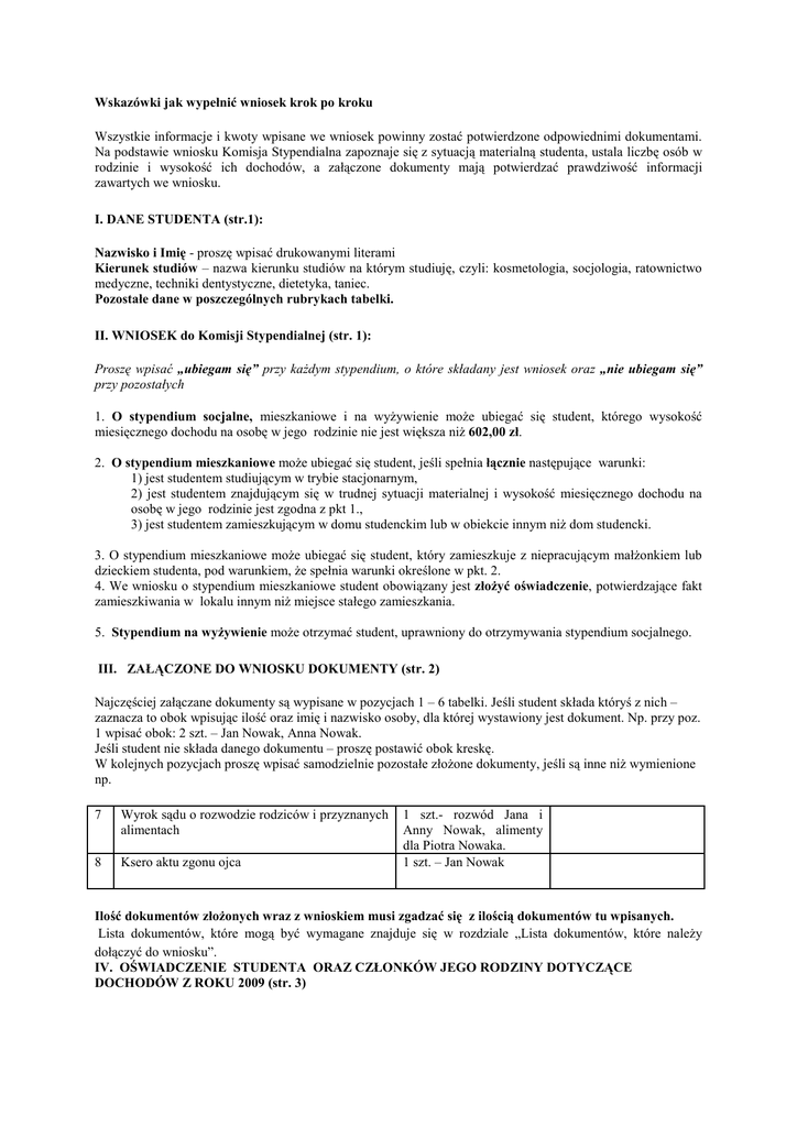 Wskazówki jak wypełnić wniosek krok po kroku Wszystkie informacje i kwoty wpisane we wniosek powinny zostać potwierdzone odpowiednimi dokumentami. Na podstawie wniosku Komisja Stypendialna zapoznaje się z sytuacją materialną studenta, ustala liczbę osób w rodzinie i wysokość ich dochodów, a załączone dokumenty mają potwierdzać prawdziwość informacji zawartych we wniosku. I. DANE STUDENTA (str.1): Nazwisko i Imię - proszę wpisać drukowanymi literami Kierunek studiów – nazwa kierunku studiów na którym studiuję, czyli: kosmetologia, socjologia, ratownictwo medyczne, techniki dentystyczne, dietetyka, taniec. Pozostałe dane w poszczególnych rubrykach tabelki. II. WNIOSEK do Komisji Stypendialnej (str. 1): Proszę wpisać „ubiegam się” przy kaŜdym stypendium, o które składany jest wniosek oraz „nie ubiegam się” przy pozostałych 1. O stypendium socjalne, mieszkaniowe i na wyŜywienie moŜe ubiegać się student, którego wysokość miesięcznego dochodu na osobę w jego rodzinie nie jest większa niŜ 602,00 zł. 2. O stypendium mieszkaniowe moŜe ubiegać się student, jeśli spełnia łącznie następujące warunki: 1) jest studentem studiującym w trybie stacjonarnym, 2) jest studentem znajdującym się w trudnej sytuacji materialnej i wysokość miesięcznego dochodu na osobę w jego rodzinie jest zgodna z pkt 1., 3) jest studentem zamieszkującym w domu studenckim lub w obiekcie innym niŜ dom studencki. 3. O stypendium mieszkaniowe moŜe ubiegać się student, który zamieszkuje z niepracującym małŜonkiem lub dzieckiem studenta, pod warunkiem, Ŝe spełnia warunki określone w pkt. 2. 4. We wniosku o stypendium mieszkaniowe student obowiązany jest złoŜyć oświadczenie, potwierdzające fakt zamieszkiwania w lokalu innym niŜ miejsce stałego zamieszkania. 5. Stypendium na wyŜywienie moŜe otrzymać student, uprawniony do otrzymywania stypendium socjalnego. III. ZAŁĄCZONE DO WNIOSKU DOKUMENTY (str. 2) Najczęściej załączane dokumenty są wypisane w pozycjach 1 – 6 tabelki. Jeśli student składa któryś z nich – zaznacza to obok wpisując ilość oraz imię i nazwisko osoby, dla której wystawiony jest dokument. Np. przy poz. 1 wpisać obok: 2 szt. – Jan Nowak, Anna Nowak. Jeśli student nie składa danego dokumentu – proszę postawić obok kreskę. W kolejnych pozycjach proszę wpisać samodzielnie pozostałe złoŜone dokumenty, jeśli są inne niŜ wymienione np. 7 Wyrok sądu o rozwodzie rodziców i przyznanych alimentach 8 Ksero aktu zgonu ojca 1 szt.- rozwód Jana i Anny Nowak, alimenty dla Piotra Nowaka. 1 szt. – Jan Nowak Ilość dokumentów złoŜonych wraz z wnioskiem musi zgadzać się z ilością dokumentów tu wpisanych. Lista dokumentów, które mogą być wymagane znajduje się w rozdziale „Lista dokumentów, które naleŜy dołączyć do wniosku”. IV. OŚWIADCZENIE STUDENTA ORAZ CZŁONKÓW JEGO RODZINY DOTYCZĄCE DOCHODÓW Z ROKU 2009 (str. 3) W zamieszczonej tu tabeli student powinien wpisać wszystkich członków swojej rodziny, łącznie z własną osobą, niezaleŜnie od tego, czy kaŜdy z nich miał dochody w 2009 r. czy nie miał (czyli równieŜ dzieci czy rodzeństwo niepełnoletnie). Członkowie rodziny muszą być podani zgodnie z wymogami opisanymi w informacji: „Osoby w rodzinie studenta”. Oznacza to np. Ŝe dziadkowie studenta, czy pełnoletnie rodzeństwo, które się nie uczy – nie mogą być brani pod uwagę przy wyliczaniu miesięcznego dochodu na osobę w rodzinie, nawet jeśli mieszkają ze studentem i prowadzą wspólne gospodarstwo. RównieŜ ojczym/macocha, jeśli nie są opiekunami prawnymi studenta oraz partner Ŝyciowy studenta, jeśli nie jest współmałŜonkiem – nie mogą znaleźć się we wniosku. Skład rodziny ustala się zgodnie ze stanem na dzień składania wniosku. TABELA: Przy kaŜdym członku rodziny, w kolejnych kolumnach - naleŜy wyliczyć lub wpisać kwotę kaŜdego rodzaju dochodu, jaki dana osoba otrzymywała w roku 2009, a więc: · KOLUMNY 1 – 6: DOCHÓD OPODATKOWANY NA ZASADACH OGÓLNYCH NaleŜy przedstawić zaświadczenie z US o ww. dochodzie z roku 2009 (lub jego braku) dla KAśDEGO pełnoletniego członka rodziny! Dochód kaŜdego członka rodziny opodatkowany podatkiem za zasadach ogólnych, policzony na podstawie zaświadczenia z urzędu skarbowego. w kolumnach z nr 1, 2, 3, 5 naleŜy przepisać kwoty z zaświadczenia z US, a w kolumnie z nr 4 – naleŜy przeliczyć kwotę składki na ubezpieczenie zdrowotne wg podanego tam wzoru (od kwoty przychodu naleŜy odjąć kwotę składek na ubezpieczenia społeczne, a wynik odejmowania naleŜy pomnoŜyć przez 9 %), w kolumnie z nr 6 naleŜy policzyć dochód netto (dochód po odliczeniach) odejmując od dochodu brutto (z kolumny 2) składkę na ubezp. społ. (z kolumny 3), przeliczoną składkę na ubezp. zdrowotne (z kolumny 4) i podatek (z kolumny 5). Proszę nie przepisywać dochodu netto (tzw. "dochodu do zaświadczenia") z zaświadczenia z US! Jego wysokość policzona zgodnie ze wskazówkami będzie na ogół inna niŜ na zaświadczeniu (róŜnica wynika z odliczenia innej wysokości składki na ubezpieczenie zdrowotne od dochodu brutto). UWAGA Wzór na składkę zdrowotną nie sprawdza się przy dochodzie z działalności gospodarczej i w sytuacjach, gdy składka zdrowotna nie została w ogóle zapłacona. Konieczne jest wtedy stosowne oświadczenie studenta. Szczegóły w informacji: "Kłopoty ze wzorem na składkę zdrowotną". · KOLUMNA 7: DOCHÓD OPODATKOWANY ZRYCZAŁTOWANYM PODATKIEM Jeśli członek rodziny uzyskiwał w 2009 dochód opodatkowany podatkiem zryczałtowanym lub kartą podatkową (np. niektóre rodzaje działalności gospodarczej, wynajem) – naleŜy przepisać dochód z oświadczenia tej osoby (policzony samodzielnie przez tę osobę i zadeklarowany w oświadczeniu, które jest załącznikiem nr 1A do Regulaminu) do kolumny 7 tabelki. Nie naleŜy przepisywać do wniosku k