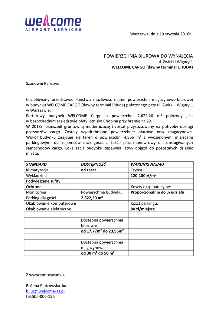 Warszawa, dnia 19 stycznia 2016r. POWIERZCHNIA BIUROWA DO WYNAJĘCIA ul. Żwirki i Wigury 1 WELCOME CARGO (dawny terminal ETIUDA) Szanowni Państwo, Chcielibyśmy przedstawić Państwu możliwość najmu powierzchni magazynowo-biurowej w budynku WELCOME CARGO (dawny terminal Etiuda) położonego przy ul. Żwirki i Wigury 1 w Warszawie. Parterowy budynek WELCOME Cargo o powierzchni 2.622,20 m² położony jest w bezpośrednim sąsiedztwie płyty lotniska Chopina przy bramie nr 20. W 2013r. przeszedł gruntowną modernizację i został przystosowany na potrzeby obsługi przewozów cargo. Zostały wyodrębnione powierzchnie biurowe oraz magazynowe. Wokół budynku znajduje się teren o powierzchni 4.865 m² z wydzielonymi miejscami parkingowymi dla najemców oraz gości, a także plac manewrowy dla obsługiwanych samochodów cargo. Lokalizacja budynku zapewnia łatwy dojazd do pozostałych dzielnic miasta. STANDARD Klimatyzacja Wykładzina Podwieszane sufity Ochrona Monitoring Parking dla gości Okablowanie komputerowe Okablowanie elektryczne DOSTĘPNOŚĆ od zaraz Powierzchnia budynku: 2.622,20 m² Dostępna powierzchnia magazynowa: od 30 m² do 50 m² Bożena Piotrowska-Juc [email protected] tel.506-006-156 Koszty eksploatacyjne: Proporcjonalnie do % udziału Koszt parkingu: 80 zł/miejsce Dostępna powierzchnia biurowa: od 17,77m² do 23,95m² Z wyrazami szacunku, WARUNKI NAJMU Czynsz: 120-180 zł/m²