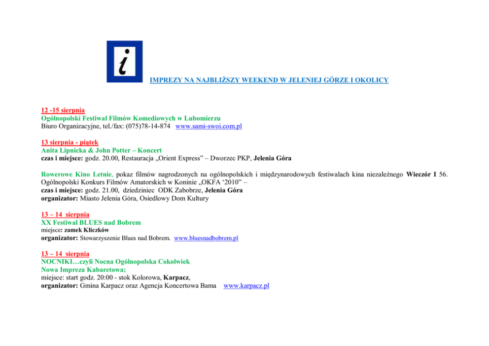 IMPREZY NA NAJBLIŻSZY WEEKEND W JELENIEJ GÓRZE I OKOLICY 12 -15 sierpnia Ogólnopolski Festiwal Filmów Komediowych w Lubomierzu Biuro Organizacyjne, tel./fax: (075)78-14-874 www.sami-swoi.com.pl 13 sierpnia - piątek Anita Lipnicka & John Potter – Koncert czas i miejsce: godz. 20.00, Restauracja „Orient Express” – Dworzec PKP, Jelenia Góra Rowerowe Kino Letnie, pokaz filmów nagrodzonych na ogólnopolskich i międzynarodowych festiwalach kina niezależnego Wieczór I 56. Ogólnopolski Konkurs Filmów Amatorskich w Koninie „OKFA ‘2010” – czas i miejsce: godz. 21.00, dziedziniec ODK Zabobrze, Jelenia Góra organizator: Miasto Jelenia Góra, Osiedlowy Dom Kultury 13 – 14 sierpnia XX Festiwal BLUES nad Bobrem miejsce: zamek Kliczków organizator: Stowarzyszenie Blues nad Bobrem. www.bluesnadbobrem.pl 13 – 14 sierpnia NOCNIKI…czyli Nocna Ogólnopolska Cokolwiek Nowa Impreza Kabaretowa; miejsce: start godz. 20:00 - stok Kolorowa, Karpacz, organizator: Gmina Karpacz oraz Agencja Koncertowa Bama www.karpacz.pl 13 – 15 sierpnia XIV Festiwal Rowerowy LECH BIKE ACTION miejsce: Szklarska Poręba organizator: Fun. Sport, MOKSiAL www.festiwalrowerowy.pl, www.bikeaction.pl 14 sierpnia – sobota INAUGURACJA OBCHODÓW 30. Rocznicy Powstania NSZZ „Solidarność” Spektakl plenerowy „Czas matek” w wykonaniu Teatru 8 Dnia z Poznania, widowisko prezentowane na okoliczność upamiętnienia Poznańskiego Czerwca ’56 czas i miejsce: godz. 21.30, Plac Ratuszowy, Jelenia Góra organizator: Jeleniogórskie Centrum Kultury, NSZZ „Solidarność” Region Jeleniogórski, Mecenat Miasta Jelenia Góra Mistrzostwa Polski MTB w ramach Bike Maratonu - Mistrzostwa Polski Polskiego Związku Kolarskiego w Maratonie MTB odbędą się na trasach prowadzących przez Rudawy Janowickie, ze startem i metą na lotnisku Aeroklubu Jeleniogórskiego organizator: Grabek Promotion Sp. z o.o. Maciej Grabek, Mecenat Miasta Jelenia Góra, www.bikemaraton.com.pl Średniowieczny Piknik w ruinach zamku Bolczów czas i miejsce: godz. 14:00 – zamek Bolczów, Rudawy Janowickie organizator: Stowarzyszenie Mieszkańcy Gminie / Janowice Wielkie www.janowice-wielkie.com Dzień Kultury Romskiej miejsce: Kowary, www.kowary.pl 14 - 15 sierpnia XX Festiwal BLUES nad Bobrem miejsce: zamek Kliczków l org. Stowarzyszenie Blues nad Bobrem, www.bluesnadbobrem.p 15 sierpnia - niedziela Uroczystość z okazji Święta Wojska Polskiego w Jeleniej Górze godz. 11.45 wymarsz Kompanii Honorowej 23. Śląskiej Brygady Artylerii z Bolesławca, pocztów sztandarowych i Orkiestry Dętej, spod Bramy Wojanowskiej ulicą 1 Maja na plac przed Kościołem Garnizonowym, podniesienie flagi państwowej i odegranie hymnu państwowego, przemówienia okolicznościowe, złożenie kwiatów pod pomnikiem „Niepodległość i Wolność”, odegranie Roty, godz. 13.00 msza św. w intencji Ojczyzny i Wojska Polskiego, złożenie kwiatów pod żołnierskimi tablicami pamiątkowymi, koncert pieśni patriotycznych i żołnierskich organizator: Jeleniogórskie Stowarzyszenie Żołnierzy Radiotechników RADAR, Mecenat Miasta Jelenia Góra X Mistrzostwa Karkonoszy w Bungy Jumping miejsce: godz. 14:00 Dolna Stacja Wyciągu na Szrenicę, Szklarska Poręba, org. MOKSiAL tel. 75 717 36 14, www.szklarskaporeba.pl Pokazy starego rzemiosła czas i miejsce: godz.11.00-17.00, Wieża Książęca, Siedlęcin, organizator: Fundacja Zamku Chudów www.zamekchudow.pl Koncert Promenadowy w wykonaniu Doroty Ujdy – Jankiewicz i Andrzeja Jankiewicza czas i miejsce: godz. 16.00, Park Norweski - taras Muzeum Przyrodniczego, Jelenia Góra-Cieplice (w razie deszczu koncert odbędzie się w Kościele Ewangelicko–Augsburskim) organizator: Miasto Jelenia Góra, Przystań Twórcza - Cieplickie Centrum Kultury, Muzeum Przyrodnicze Cieplickie Koncerty Organowe - koncert w wykonaniu Marcina Armańskiego; w programie: Johann Sebastian Bach (1683-1750) - Preludium i fuga G-dur, BWV 541, Nun komm der Heiden Heiland, BWV 659, Concerto a-moll, BWV 593, Cesar Franck (1822-1890) - Cantabile H-dur, Grand chœur Es-dur, Marco Enrico Bossi (1861-1925) - Scherzo g-moll, op.49/2, Alexandre Guilmant (1837-1911) - Prieré As-dur, Louis James Alfred Lefébure-Wély (1817-1869) - Marche C-dur// (bilety 10 zł, ulgowy 7 zł) czas i miejsce: godz. 19.15 w Kościół Ewangelicki, Plac Piastowski 18, Jelenia Góra organizator: Parafia Ewangelicko-Augsburska, Mecenat Miasta Jelenia Góra Rajd rowerowy Jeleniogórskim Traktem Śródmiejskim promujący produkt turystyczny w ramach projektu „Jeleniogórski Trakt Śródmiejski” – impreza ta jest współfinansowana przez Unię Europejską z Europejskiego Funduszu Rozwoju Regionalnego w ramach Regionalnego Programu Operacyjnego dla Województwa Dolnośląskiego na lata 2007-2013. rejestracja zawodników: w godz. 10.00-11.00 - Plac Ratuszowy, Jelenia Góra organizator: Miasto Jelenia Góra www.jeleniagora.pl Koncert w klimatach jazzujących, swingujących i piosenki autorskiej, Z cyklu " muzycznie i nastrojowo " zagrają: Sebastian Lehner - wokal, saksofon i Piotr Sobota – gitara. czas i miejsce: godz. 18:00 Restauracja Hotelu*** „Caspar” Jelenia Góra-Cieplice, Pl. Piastowski 28, www.caspar.pl, tel: 75/6455001 Piknik ze sztuką przy Dziurawej Skale czas i miejsce: godz. 11.00 – 21.00 - OKW „Karolinka”, Podgórzyn, tel. 75 76 21 234, www.przesieka.pl informacje zebrało CENTRUM INFORMACJI TURYSTYCZNEJ I KULTURALNEJ 58-500 JELENIA GÓRA UL.BANKOWA 27, TEL. O75/76 76 925 TEL/FAX O75/76 76 935 ,[email protected], www.jeleniagora.pl