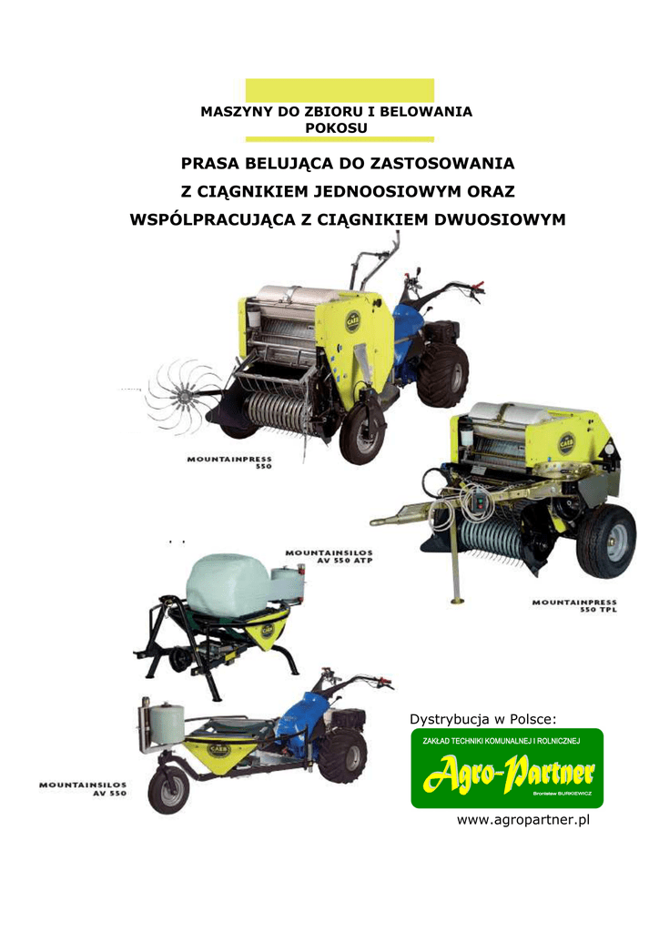 MASZYNY DO ZBIORU I BELOWANIA POKOSU PRASA BELUJĄCA DO ZASTOSOWANIA Z CIĄGNIKIEM JEDNOOSIOWYM ORAZ WSPÓLPRACUJĄCA Z CIĄGNIKIEM DWUOSIOWYM Dystrybucja w Polsce: www.agropartner.pl PODSTAWOWE DANE TECHNICZNE Wymiary beli: 55x52 cm Masa beli siana: 20-25 kg Masa beli słomy: 14-18 kg Masa beli zielonki: 35-50 kg Produkcja godzinowa: 50-80 beli Szerokość robocza: 70-105 cm Ilość zębów nagarniacza w rzędzie / ilość rzędów: 16 / 2 Owijanie beli siatką: tak Licznik beli: tak Automatyczny naciąg łańcucha: tak Długość maszyny: 130-230 cm Masa własna maszyny: 255-280 kg Opony: 3.50-8 4PR Zapotrzebowanie mocy: 6,6-14,8 kW Wymiary beli: 55x52 cm Masa beli siana: 20-25 kg Masa beli słomy: 14-18 kg Masa beli zielonki: 35-50 kg Produkcja godzinowa: 50-80 beli Szerokość robocza: 70-105 cm Ilość zębów nagarniacza w rzędzie / ilość rzędów: 16 / 2 Owijanie beli siatką: tak Licznik beli: tak Automatyczny naciąg łańcucha: tak Długość maszyny: 195-225 cm Szerokość maszyny: 123-175 cm Wysokość regulowana: 93-103 cm Masa własna maszyny: 295 kg Opony: 18x8.50-8 4PR Zapotrzebowanie mocy: 12 kW OWIJARKA Wymiary rolki folii: Wysokość: 25 cm Długość: 1800 m Masa beli siana: 20-25 kg Masa własna maszyny: 89 kg Procent rozciągnięcia folii: 50% Ilość owinięć: 6/4/2 Wysokość owijanych beli: 52-73 cm Średnica beli: 50-60 cm Masa beli: 20-80 kg Wymiary rolki folii: Wysokość: 25 cm Długość: 1800 m Masa beli siana: 20-25 kg Masa własna maszyny: 89 kg Procent rozciągnięcia folii: 50% Ilość owinięć: 6/4/2 Wysokość owijanych beli: 52-73 cm Średnica beli: 50-60 cm Masa beli: 20-80 kg