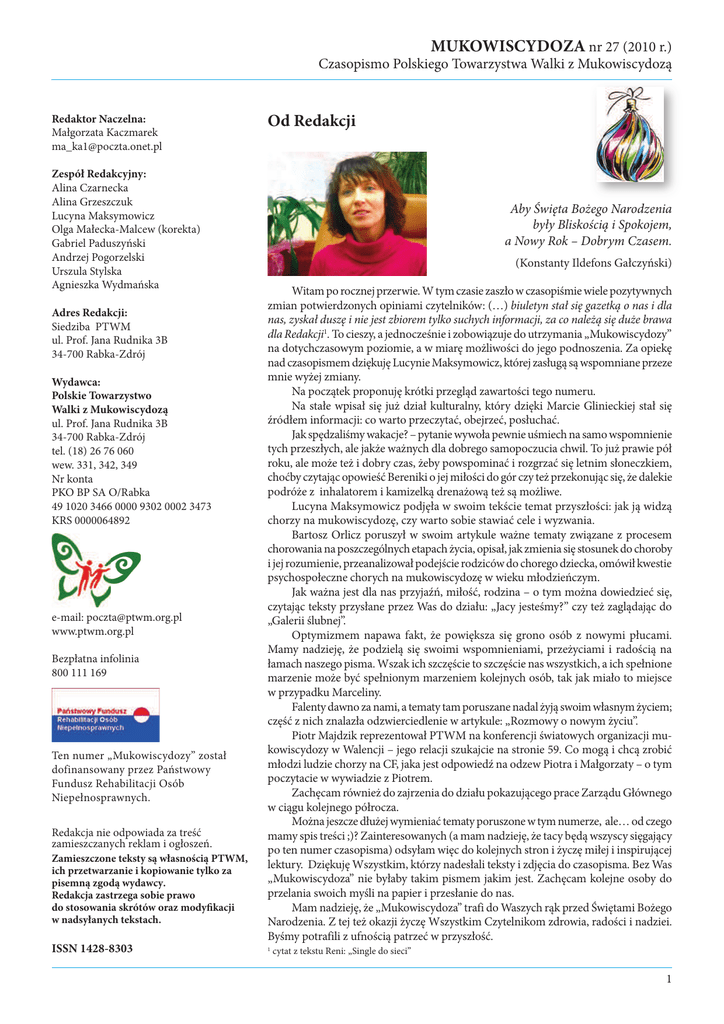 MUKOWISCYDOZA nr 27 (2010 r.) Czasopismo Polskiego Towarzystwa Walki z Mukowiscydozą Redaktor Naczelna: Małgorzata Kaczmarek [email protected] Zespół Redakcyjny: Alina Czarnecka Alina Grzeszczuk Lucyna Maksymowicz Olga Małecka-Malcew (korekta) Gabriel Paduszyński Andrzej Pogorzelski Urszula Stylska Agnieszka Wydmańska Adres Redakcji: Siedziba PTWM ul. Prof. Jana Rudnika 3B 34-700 Rabka-Zdrój Wydawca: Polskie Towarzystwo Walki z Mukowiscydozą ul. Prof. Jana Rudnika 3B 34-700 Rabka-Zdrój tel. (18) 26 76 060 wew. 331, 342, 349 Nr konta PKO BP SA O/Rabka 49 1020 3466 0000 9302 0002 3473 KRS 0000064892 e-mail: [email protected] www.ptwm.org.pl Bezpłatna infolinia 800 111 169 ISSN 1428-8303 Ten numer „Mukowiscydozy” został dofinansowany przez Państwowy Fundusz Rehabilitacji Osób Niepełnosprawnych. Redakcja nie odpowiada za treść zamieszczanych reklam i ogłoszeń. Zamieszczone teksty są własnością PTWM, ich przetwarzanie i kopiowanie tylko za pisemną zgodą wydawcy. Redakcja zastrzega sobie prawo do stosowania skrótów oraz modyfikacji w nadsyłanych tekstach. ISSN 1428-8303 Od Redakcji Aby Święta Bożego Narodzenia były Bliskością i Spokojem, a Nowy Rok – Dobrym Czasem. (Konstanty Ildefons Gałczyński) Witam po rocznej przerwie. W tym czasie zaszło w czasopiśmie wiele pozytywnych zmian potwierdzonych opiniami czytelników: (…) biuletyn stał się gazetką o nas i dla nas, zyskał duszę i nie jest zbiorem tylko suchych informacji, za co należą się duże brawa dla Redakcji1. To cieszy, a jednocześnie i zobowiązuje do utrzymania „Mukowiscydozy” na dotychczasowym poziomie, a w miarę możliwości do jego podnoszenia. Za opiekę nad czasopismem dziękuję Lucynie Maksymowicz, której zasługą są wspomniane przeze mnie wyżej zmiany. Na początek proponuję krótki przegląd zawartości tego numeru. Na stałe wpisał się już dział kulturalny, który dzięki Marcie Glinieckiej stał się źródłem informacji: co warto przeczytać, obejrzeć, posłuchać. Jak spędzaliśmy wakacje? – pytanie wywoła pewnie uśmiech na samo wspomnienie tych przeszłych, ale jakże ważnych dla dobrego samopoczucia chwil. To już prawie pół roku, ale może też i dobry czas, żeby powspominać i rozgrzać się letnim słoneczkiem, choćby czytając opowieść Bereniki o jej miłości do gór czy też przekonując się, że dalekie podróże z inhalatorem i kamizelką drenażową też są możliwe. Lucyna Maksymowicz podjęła w swoim tekście temat przyszłości: jak ją widzą chorzy na mukowiscydozę, czy warto sobie stawiać cele i wyzwania. Bartosz Orlicz poruszył w swoim artykule ważne tematy związane z procesem chorowania na poszczególnych etapach życia, opisał, jak zmienia się stosunek do choroby i jej rozumienie, przeanalizował podejście rodziców do chorego dziecka, omówił kwestie psychospołeczne chorych na mukowiscydozę w wieku młodzieńczym. Jak ważna jest dla nas przyjaźń, miłość, rodzina – o tym można dowiedzieć się, czytając teksty przysłane przez Was do działu: „Jacy jesteśmy?” czy też zaglądając do „Galerii ślubnej”. Optymizmem napawa fakt, że powiększa się grono osób z nowymi płucami. Mamy nadzieję, że podzielą się swoimi wspomnieniami, przeżyciami i radością na łamach naszego pisma. Wszak ich szczęście to szczęście nas wszystkich, a ich spełnione marzenie może być spełnionym marzeniem kolejnych osób, tak jak miało to miejsce w przypadku Marceliny. Falenty dawno za nami, a tematy tam poruszane nadal żyją swoim własnym życiem; część z nich znalazła odzwierciedlenie w artykule: „Rozmowy o nowym życiu”. Piotr Majdzik reprezentował PTWM na konferencji światowych organizacji mukowiscydozy w Walencji – jego relacji szukajcie na stronie 59. Co mogą i chcą zrobić młodzi ludzie chorzy na CF, jaka jest odpowiedź na odzew Piotra i Małgorzaty – o tym poczytacie w wywiadzie z Piotrem. Zachęcam również do zajrzenia do działu pokazującego prace Zarządu Głównego w ciągu kolejnego półrocza. Można jeszcze dłużej wymieniać tematy poruszone w tym numerze, ale… od czego mamy spis treści ;)? Zainteresowanych (a mam nadzieję, że tacy będą wszyscy sięgający po ten numer czasopisma) odsyłam więc do kolejnych stron i życzę miłej i inspirującej lektury. Dziękuję Wszystkim, którzy nadesłali teksty i zdjęcia do czasopisma. Bez Was „Mukowiscydoza” nie byłaby takim pismem jakim jest. Zachęcam kolejne osoby do przelania swoich myśli na papier i przesłanie do nas. Mam nadzieję, że „Mukowiscydoza” trafi do Waszych rąk przed Świętami Bożego Narodzenia. Z tej też okazji życzę Wszystkim Czytelnikom zdrowia, radości i nadziei. Byśmy potrafili z ufnością patrzeć w przyszłość. 1 cytat z tekstu Reni: „Single do sieci” 1 SPIS TREŚCI Medycyna: informacje, porady, nowinki Zakażenie Burholderia cepacia w mukowiscydozie . . . . . . . . . . . . . . . . . . . . . . . . . . . . . . . . . . . . . . . .3 Wziewna antybiotykoterapia w mukowiscydozie . . . . . . . . . . . . . . . . . . . . . . . . . . . . . . . . . . . . . . . . .6 NZOZ Genomed – porady genetyczne . . . . . . . . . . . . . . . . . . . . . . . . . . . . . . . . . . . . . . . . . . . . . . . . . .8 AquADEK-s – optymalne wchłanianie . . . . . . . . . . . . . . . . . . . . . . . . . . . . . . . . . . . . . . . . . . . . . . . . . .9 s. 17 Edukacja i psychologia na co dzień Dorastanie z chorobą przewlekłą, czyli kilka uwag o planach życiowych. . . . . . . . . . . . . . . . . . . . .10 Psychologia przy mukowiscydozie. Przegląd wybranych aspektów psychospołecznych związanych z chorobą i jej doświadczaniem . . . . . . . . . . . . . . . . . . . . . . . . . . . . . . . . . . . . . . . . . . . . . . . . . . .13 Techniki terapeutyczne dla każdego z nas: silvoterapia. . . . . . . . . . . . . . . . . . . . . . . . . . . . . . . . . . . . .17 Przepisy prawne i ich interpre