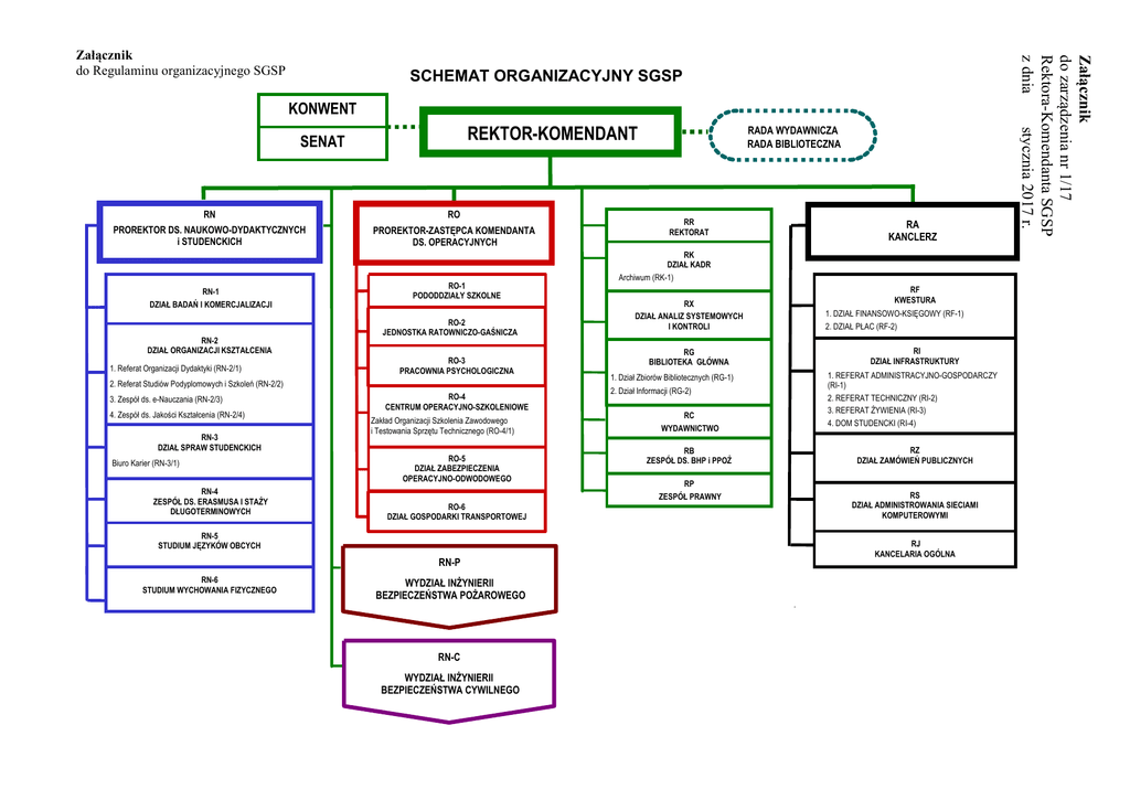 SCHEMAT ORGANIZACYJNY SGSP KONWENT REKTOR-KOMENDANT SENAT RN RO PROREKTOR DS. NAUKOWO-DYDAKTYCZNYCH i STUDENCKICH PROREKTOR-ZASTĘPCA KOMENDANTA DS. OPERACYJNYCH RN-1 DZIAŁ BADAŃ I KOMERCJALIZACJI RN-2 DZIAŁ ORGANIZACJI KSZTAŁCENIA 1. Referat Organizacji Dydaktyki (RN-2/1) RO-1 PODODDZIAŁY SZKOLNE RO-2 JEDNOSTKA RATOWNICZO-GAŚNICZA RO-3 PRACOWNIA PSYCHOLOGICZNA 2. Referat Studiów Podyplomowych i Szkoleń (RN-2/2) 3. Zespół ds. e-Nauczania (RN-2/3) 4. Zespół ds. Jakości Kształcenia (RN-2/4) RN-3 DZIAŁ SPRAW STUDENCKICH Biuro Karier (RN-3/1) RN-4 ZESPÓŁ DS. ERASMUSA I STAŻY DŁUGOTERMINOWYCH RO-4 CENTRUM OPERACYJNO-SZKOLENIOWE Zakład Organizacji Szkolenia Zawodowego i Testowania Sprzętu Technicznego (RO-4/1) RO-5 DZIAŁ ZABEZPIECZENIA OPERACYJNO-ODWODOWEGO RR REKTORAT RO-6 DZIAŁ GOSPODARKI TRANSPORTOWEJ RN-P WYDZIAŁ INŻYNIERII BEZPIECZEŃSTWA POŻAROWEGO RN-C WYDZIAŁ INŻYNIERII BEZPIECZEŃSTWA CYWILNEGO RA KANCLERZ RK DZIAŁ KADR Archiwum (RK-1) RX DZIAŁ ANALIZ SYSTEMOWYCH I KONTROLI RG BIBLIOTEKA GŁÓWNA 1. Dział Zbiorów Bibliotecznych (RG-1) 2. Dział Informacji (RG-2) RC WYDAWNICTWO RB ZESPÓŁ DS. BHP i PPOŻ RF KWESTURA 1. DZIAŁ FINANSOWO-KSIĘGOWY (RF-1) 2. DZIAŁ PŁAC (RF-2) RI DZIAŁ INFRASTRUKTURY 1. REFERAT ADMINISTRACYJNO-GOSPODARCZY (RI-1) 2. REFERAT TECHNICZNY (RI-2) 3. REFERAT ŻYWIENIA (RI-3) 4. DOM STUDENCKI (RI-4) RZ DZIAŁ ZAMÓWIEŃ PUBLICZNYCH RP ZESPÓŁ PRAWNY RN-5 STUDIUM JĘZYKÓW OBCYCH RN-6 STUDIUM WYCHOWANIA FIZYCZNEGO RADA WYDAWNICZA RADA BIBLIOTECZNA RS DZIAŁ ADMINISTROWANIA SIECIAMI KOMPUTEROWYMI RJ KANCELARIA OGÓLNA Załącznik do zarządzenia nr 1/17 Rektora-Komendanta SGSP z dnia stycznia 2017 r. Załącznik do Regulaminu organizacyjnego SGSP