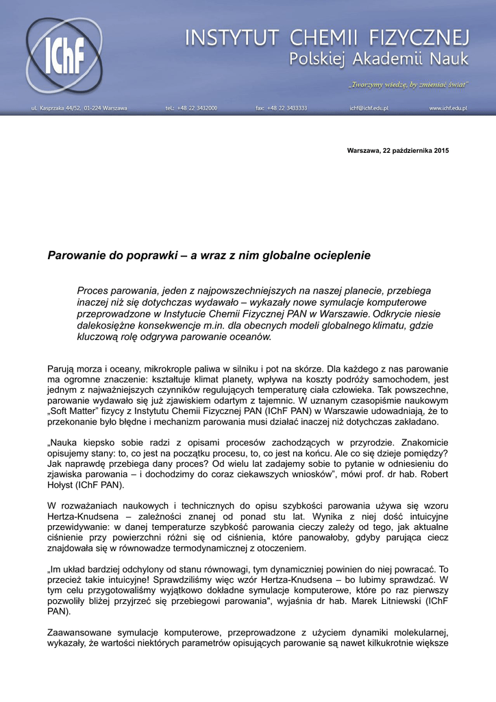 Warszawa, 22 października 2015 Parowanie do poprawki – a wraz z nim globalne ocieplenie Proces parowania, jeden z najpowszechniejszych na naszej planecie, przebiega inaczej niż się dotychczas wydawało – wykazały nowe symulacje komputerowe przeprowadzone w Instytucie Chemii Fizycznej PAN w Warszawie. Odkrycie niesie dalekosiężne konsekwencje m.in. dla obecnych modeli globalnego klimatu, gdzie kluczową rolę odgrywa parowanie oceanów. Parują morza i oceany, mikrokrople paliwa w silniku i pot na skórze. Dla każdego z nas parowanie ma ogromne znaczenie: kształtuje klimat planety, wpływa na koszty podróży samochodem, jest jednym z najważniejszych czynników regulujących temperaturę ciała człowieka. Tak powszechne, parowanie wydawało się już zjawiskiem odartym z tajemnic. W uznanym czasopiśmie naukowym „Soft Matter” fizycy z Instytutu Chemii Fizycznej PAN (IChF PAN) w Warszawie udowadniają, że to przekonanie było błędne i mechanizm parowania musi działać inaczej niż dotychczas zakładano. „Nauka kiepsko sobie radzi z opisami procesów zachodzących w przyrodzie. Znakomicie opisujemy stany: to, co jest na początku procesu, to, co jest na końcu. Ale co się dzieje pomiędzy? Jak naprawdę przebiega dany proces? Od wielu lat zadajemy sobie to pytanie w odniesieniu do zjawiska parowania – i dochodzimy do coraz ciekawszych wniosków”, mówi prof. dr hab. Robert Hołyst (IChF PAN). W rozważaniach naukowych i technicznych do opisu szybkości parowania używa się wzoru Hertza-Knudsena – zależności znanej od ponad stu lat. Wynika z niej dość intuicyjne przewidywanie: w danej temperaturze szybkość parowania cieczy zależy od tego, jak aktualne ciśnienie przy powierzchni różni się od ciśnienia, które panowałoby, gdyby parująca ciecz znajdowała się w równowadze termodynamicznej z otoczeniem. „Im układ bardziej odchylony od stanu równowagi, tym dynamiczniej powinien do niej powracać. To przecież takie intuicyjne! Sprawdziliśmy więc wzór Hertza-Knudsena – bo lubimy sprawdzać. W tym celu przygotowaliśmy wyjątkowo dokładne symulacje komputerowe, które po raz pierwszy pozwoliły bliżej przyjrzeć się przebiegowi parowania", wyjaśnia dr hab. Marek Litniewski (IChF PAN). Zaawansowane symulacje komputerowe, przeprowadzone z użyciem dynamiki molekularnej, wykazały, że wartości niektórych parametrów opisujących parowanie są nawet kilkukrotnie większe od przewidywanych przez wzór Hertza-Knudsena. Zauważono jednak efekt znacznie ciekawszy: strumień gazu uwalniającego się z powierzchni cieczy w trakcie parowania zmieniał się w niewielkim stopniu mimo znacznych fluktuacji ciśnienia. „Wniosek z tej obserwacji mógł być tylko jeden: szybkość parowania i ciśnienie pary, czyli wielkości fizyczne, które dotychczas uznawano za ściśle ze sobą powiązane, wcale takimi nie były. Przez ponad wiek w opisie teoretycznym zjawiska parowania wszyscy popełnialiśmy poważny błąd!”, stwierdza dr Litniewski. Dotychczasowy model parowania bazował na zasadzie zachowania masy: masa cząsteczek uwolnionych z powierzchni cieczy musiała odpowiednio zwiększać masę gazu w jej otoczeniu. Fizycy z IChF PAN zauważyli jednak, że skoro cząsteczki uwalniane z powierzchni mają pewną prędkość, do opisu zjawiska należałoby użyć zasady zachowania pędu. „Zdaliśmy sobie sprawę, że parowanie w pewnym stopniu przypomina strzelanie z działa: pocisk wylatuje w jedną stronę, ale całkowity pęd układu musi zostać zachowany, więc działo ulega odrzutowi w przeciwną. Podobnie dzieje się z cząsteczkami parującej cieczy. Skoro unoszą pęd, musi być odrzut, a skoro jest odrzut, to ciśnienie odczuwane przez cząsteczki na powierzchni cieczy będzie inne!”, mówi prof. Hołyst. W nowych symulacjach komputerowych zmierzono także prędkości cząsteczek uwalnianych z powierzchni cieczy. Okazały się one niewielkie, rzędu setek mikrometrów na sekundę, co odpowiada zaledwie kilku kilometrom na godzinę. Fakt ten oznacza, że praktycznie każdy naturalnie występujący przepływ nad powierzchnią cieczy musi silnie zaburzać proces parowania. Nie można więc go opisywać wzorem wyprowadzonym dla bardzo szczególnego przypadku, dla cieczy znajdującej się w równowadze termodynamicznej z otoczeniem. Odkrycie naukowców z IChF PAN ma ogromne znaczenie m.in. dla zrozumienia rzeczywistych mechanizmów odpowiedzialnych za globalne ocieplenie. Wbrew potocznemu przekonaniu, gazem cieplarnianym najobficiej występującym w atmosferze naszej planety nie jest dwutlenek węgla, lecz para wodna. Wiadomo jednocześnie, że prędkości przepływów mas powietrza nad oceanami mogą znacznie przekraczać sto kilometrów na godzinę, a zatem z pewnością wpływają na szybkość parowania. Dotychczasowe oceny tempa parowania oceanów muszą więc być obarczone błędami, co z pewnością rzutuje na dokładność przewidywań współczesnych modeli ziemskiego klimatu. Naukowcy z IChF PAN prowadzą badania nad parowaniem we współpracy z Instytutem Fizyki PAN w Warszawie, gdzie są realizowane doświadczenia weryfikujące poprawność symulacji. Instytut Chemii Fizycznej Polskiej Akademii Nauk (http://www.ichf.edu.pl/) został powołany w 1955 roku jako jeden z pierwszych instytutów chemicznych PAN. Profil naukowy Instytutu jest silnie powiązany z najnowszymi światowymi kierunkami rozwoju chemii fizycznej i fizyki chemicznej. Badania naukowe są prowadzone w dziewięciu zakładach naukowych. Działający w ramach Instytutu Zakład Doświadczalny CHEMIPAN wdraża, produkuje i komercjalizuje specjalistyczne związki chemiczne do zastosowań m.in. w rolnictwie i farmacji. Instytut publikuje około 200 oryginalnych prac badawczych rocznie. KONTAKT: prof. dr hab. Robert Hołyst Instytut Chemii Fizycznej Polskiej Akademii Nauk w Warszawie tel. +48 22 3433123 email: [email protected] dr hab. Marek Litniewski Instytut Chemii Fi