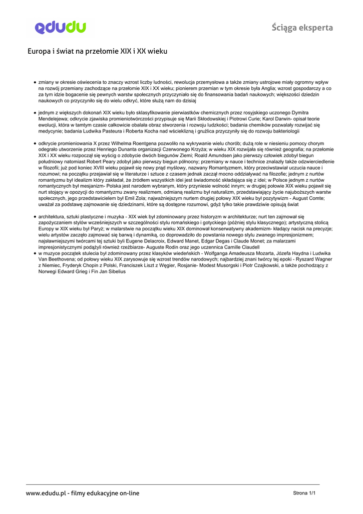 Ściąga eksperta Europa i świat na przełomie XIX i XX wieku zmiany w okresie oświecenia to znaczy wzrost liczby ludności, rewolucja przemysłowa a także zmiany ustrojowe miały ogromny wpływ na rozwój przemiany zachodzące na przełomie XIX i XX wieku; pionierem przemian w tym okresie była Anglia; wzrost gospodarczy a co za tym idzie bogacenie się pewnych warstw społecznych przyczyniało się do finansowania badań naukowych; większości dziedzin naukowych co przyczyniło się do wielu odkryć, które służą nam do dzisiaj jednym z większych dokonań XIX wieku było sklasyfikowanie pierwiastków chemicznych przez rosyjskiego uczonego Dymitra Mendelejewa; odkrycie zjawiska promieniotwórczości przypisuje się Marii Skłodowskiej i Piotrowi Curie; Karol Darwin- opisał teorie ewolucji, która w tamtym czasie całkowicie obalała obraz stworzenia i rozwoju ludzkości; badania chemików pozwalały rozwijać się medycynie; badania Ludwika Pasteura i Roberta Kocha nad wścieklizną i gruźlica przyczyniły się do rozwoju bakteriologii odkrycie promieniowania X przez Wilhelma Roentgena pozwoliło na wykrywanie wielu chorób; dużą role w niesieniu pomocy chorym odegrało utworzenie przez Henriego Dunanta organizacji Czerwonego Krzyża; w wieku XIX rozwijała się również geografia; na przełomie XIX i XX wieku rozpoczął się wyścig o zdobycie dwóch biegunów Ziemi; Roald Amundsen jako pierwszy człowiek zdobył biegun południowy natomiast Robert Peary zdobył jako pierwszy biegun północny; przemiany w nauce i technice znalazły także odzwierciedlenie w filozofii; już pod koniec XVIII wieku pojawił się nowy prąd myślowy, nazwany Romantyzmem, który przeciwstawiał uczucia nauce i rozumowi; na początku przejawiał się w literaturze i sztuce z czasem jednak zaczął mocno oddziaływać na filozofie; jednym z nurtów romantyzmu był idealizm który zakładał, że źródłem wszystkich idei jest świadomość składająca się z idei; w Polsce jednym z nurtów romantycznych był mesjanizm- Polska jest narodem wybranym, który przyniesie wolność innym; w drugiej połowie XIX wieku pojawił się nurt stojący w opozycji do romantyzmu zwany realizmem, odmianą realizmu był naturalizm, przedstawiający życie najuboższych warstw społecznych, jego przedstawicielem był Emil Zola; najważniejszym nurtem drugiej połowy XIX wieku był pozytywizm - August Comte; uważał za podstawę zajmowanie się dziedzinami, które są dostępne rozumowi, gdyż tylko takie prawdziwie opisują świat architektura, sztuki plastyczne i muzyka - XIX wiek był zdominowany przez historyzm w architekturze; nurt ten zajmował się zapożyczaniem stylów wcześniejszych w szczególności stylu romańskiego i gotyckiego (później stylu klasycznego); artystyczną stolicą Europy w XIX wieku był Paryż; w malarstwie na początku wieku XIX dominował konserwatywny akademizm- kładący nacisk na precyzje; wielu artystów zaczęło zajmować się barwą i dynamiką, co doprowadziło do powstania nowego stylu zwanego impresjonizmem; najsławniejszymi twórcami tej sztuki byli Eugene Delacroix, Edward Manet, Edgar Degas i Claude Monet; za malarzami impresjonistycznymi podążyli również rzeźbiarze- Auguste Rodin oraz jego uczennica Camille Claudell w muzyce początek stulecia był zdominowany przez klasyków wiedeńskich - Wolfganga Amadeusza Mozarta, Józefa Haydna i Ludwika Van Beethovena; od połowy wieku XIX zarysowuje się wzrost trendów narodowych; najbardziej znani twórcy tej epoki - Ryszard Wagner z Niemiec, Fryderyk Chopin z Polski, Franciszek Liszt z Węgier, Rosjanie- Modest Musorgski i Piotr Czajkowski, a także pochodzący z Norwegi Edward Grieg i Fin Jan Sibelius www.edudu.pl - filmy edukacyjne on-line Powered by TCPDF (www.tcpdf.org) Strona 1/1