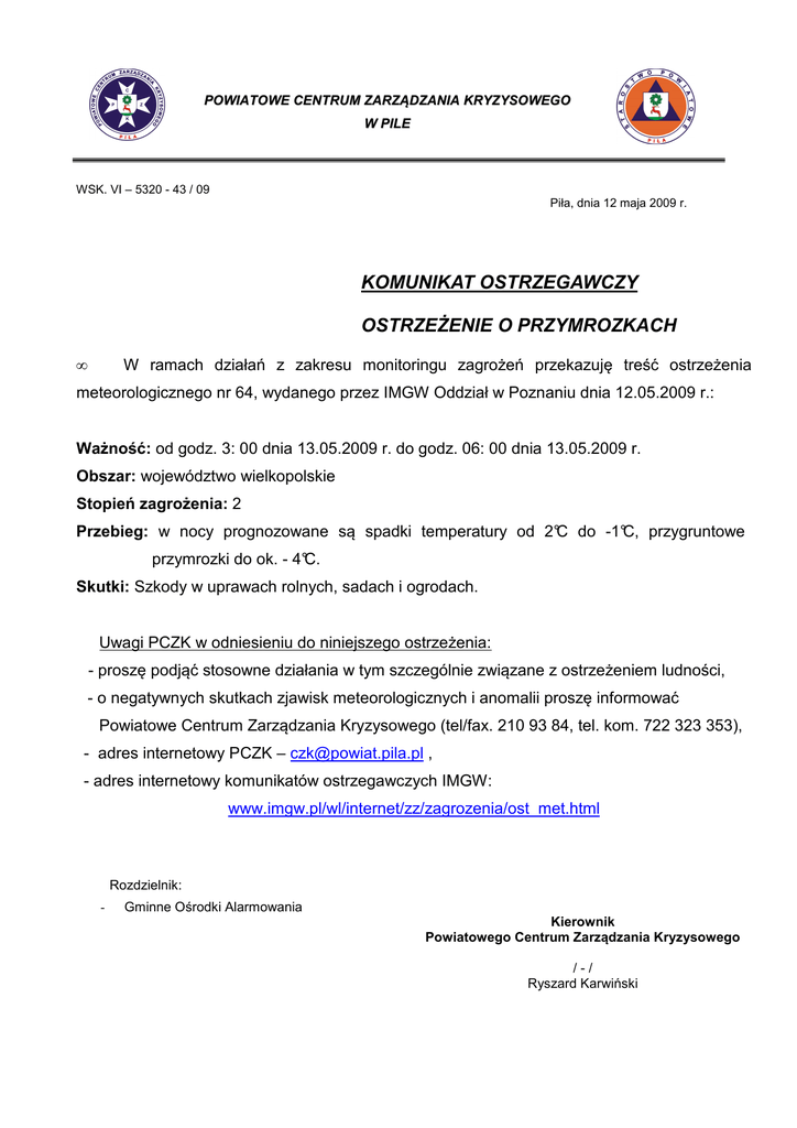 POWIATOWE CENTRUM ZARZĄDZANIA KRYZYSOWEGO W PILE WSK. VI – 5320 - 43 / 09 Piła, dnia 12 maja 2009 r. KOMUNIKAT OSTRZEGAWCZY OSTRZEŻENIE O PRZYMROZKACH • W ramach działań z zakresu monitoringu zagrożeń przekazuję treść ostrzeżenia meteorologicznego nr 64, wydanego przez IMGW Oddział w Poznaniu dnia 12.05.2009 r.: Ważność: od godz. 3: 00 dnia 13.05.2009 r. do godz. 06: 00 dnia 13.05.2009 r. Obszar: województwo wielkopolskie Stopień zagrożenia: 2 Przebieg: w nocy prognozowane są spadki temperatury od 2°C do -1°C, przygruntowe przymrozki do ok. - 4°C. Skutki: Szkody w uprawach rolnych, sadach i ogrodach. Uwagi PCZK w odniesieniu do niniejszego ostrzeżenia: - proszę podjąć stosowne działania w tym szczególnie związane z ostrzeżeniem ludności, - o negatywnych skutkach zjawisk meteorologicznych i anomalii proszę informować Powiatowe Centrum Zarządzania Kryzysowego (tel/fax. 210 93 84, tel. kom. 722 323 353), - adres internetowy PCZK – [email protected] , - adres internetowy komunikatów ostrzegawczych IMGW: www.imgw.pl/wl/internet/zz/zagrozenia/ost_met.html Rozdzielnik: - Gminne Ośrodki Alarmowania Kierownik Powiatowego Centrum Zarządzania Kryzysowego /-/ Ryszard Karwiński