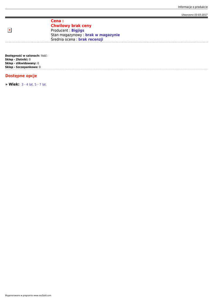 Informacje o produkcie Utworzono 03-03-2017 Cena : Chwilowy brak ceny Producent : Bigjigs Stan magazynowy : brak w magazynie Średnia ocena : brak recenzji Dostępność w salonach: Ilość: Sklep - Złotniki: 0 Sklep - zlikwidowany: 0 Sklep - Szczepankowo: 0 Dostępne opcje » Wiek: 3 - 4 lat, 5 - 7 lat. Wygenerowano w programie www.oscGold.com