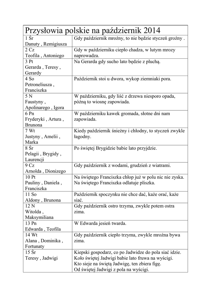 Przysłowia polskie na październik 2014 1 Śr Danuty , Remigiusza 2 Cz Teofila , Antoniego 3 Pt Gerarda , Teresy , Gerardy 4 So Petroneliusza , Franciszka 5N Faustyny , Apolinarego , Igora 6 Pn Fryderyki , Artura , Brunona 7 Wt Justyny , Amelii , Marka 8 Śr Pelagii , Brygidy , Laurencji 9 Cz Arnolda , Dionizego 10 Pt Pauliny , Daniela , Franciszka 11 So Aldony , Brunona 12 N Witolda , Maksymiliana 13 Pn Edwarda , Teofila 14 Wt Alana , Dominika , Fortunaty 15 Śr Teresy , Jadwigi Gdy październik mroźny, to nie będzie styczeń groźny . Gdy w październiku ciepło chadza, w lutym mrozy naprowadza. Na Gerarda gdy sucho lato będzie z pluchą. Październik stoi u dwora, wykop ziemniaki pora. W październiku, gdy liść z drzewa niesporo opada, późną to wiosnę zapowiada. W październiku kawek gromada, słotne dni nam zapowiada. Kiedy październik śnieżny i chłodny, to styczeń zwykle łagodny. Po świętej Brygidzie babie lato przyjdzie. Gdy październik z wodami, grudzień z wiatrami. Na świętego Franciszka chłop już w polu nic nie zyska. Na świętego Franciszka odlatuje pliszka. Październik spoczynku nie chce dać, każe orać, każe siać. Gdy październik ostro trzyma, zwykle potem ostra zima. W Edwarda jesień twarda. Gdy październik ciepło trzyma, zwykle mroźna bywa zima. Kiepski gospodarz, co po Jadwidze do pola siać idzie. Koło świętej Jadwigi babie lato fruwa na wyścigi. Kto sieje na świętą Jadwigę, ten zbiera figę. Od świętej Jadwigi z pola na wyścigi. 16 Cz Ambrożego , Gawła 17 Pt Lucyny , Małgorzaty 18 So Łukasza , Juliana 19 N Piotra , Ziemowita 20 Pn Ireny , Felicjana 21 Wt Urszuli , Celiny 22 Śr Filipa , Kordiana 23 Cz Marleny , Seweryna 24 Pt Marcina , Alojzego , Arety 25 So Kryspina , Darii , Ingi 26 N Dymitra , Łucjana 27 Pn Iwony , Manfreda 28 Wt Tadeusza , Szymona 29 Śr Narcyza , Teodora , Wioletty 30 Cz Przemysława , Edmunda 31 Pt Augusty , Antonina Kiedy w święty Gaweł słota, będzie w lecie dużo błota. Gdy październik mokro trzyma, zwykle potem ostra zima. Październik chodzi po kraju, wygania ptactwo z gaju. Październik ciepły, będzie luty skrzepły. Idzie jesień, a tu pusta kieszeń. Od świętej Urszuli chłop się kożuchem otuli. Od świętej Urszuli oczekuj śnieżnej koszuli. Święta Urszula – perły rozsuła, miesiąc wiedział – nie powiedział, słońce wstało, pozbierało. Święta Urszula i Kordula dzieci do pieca przytula. Ile razy przed nowiem w październiku śnieg spadnie, tyle razy wśród zimy odwilży przypadnie. Kiedy październik śnieżny i chłodny, to styczeń bywa zwykle pogodny. W jesieni prędko gdy liść z drzewa spadnie, to wkrótce zima będzie, każdy zgadnie. Jaki październik, taki marzec, doznał tego niejeden starzec. Na świętego Szymona i Judy spodziewają się śniegu i grudy. Jesień bezdeszczowa to zima wiatrowa. Jak przyjdzie Szymon i Judy, zagoń bydło z pola do budy. Gdy październik mroźny, to nie będzie styczeń groźny . Gdy w październiku ciepło chadza, w lutym mrozy naprowadza. Październik stoi u dwora, wykop ziemniaki pora.