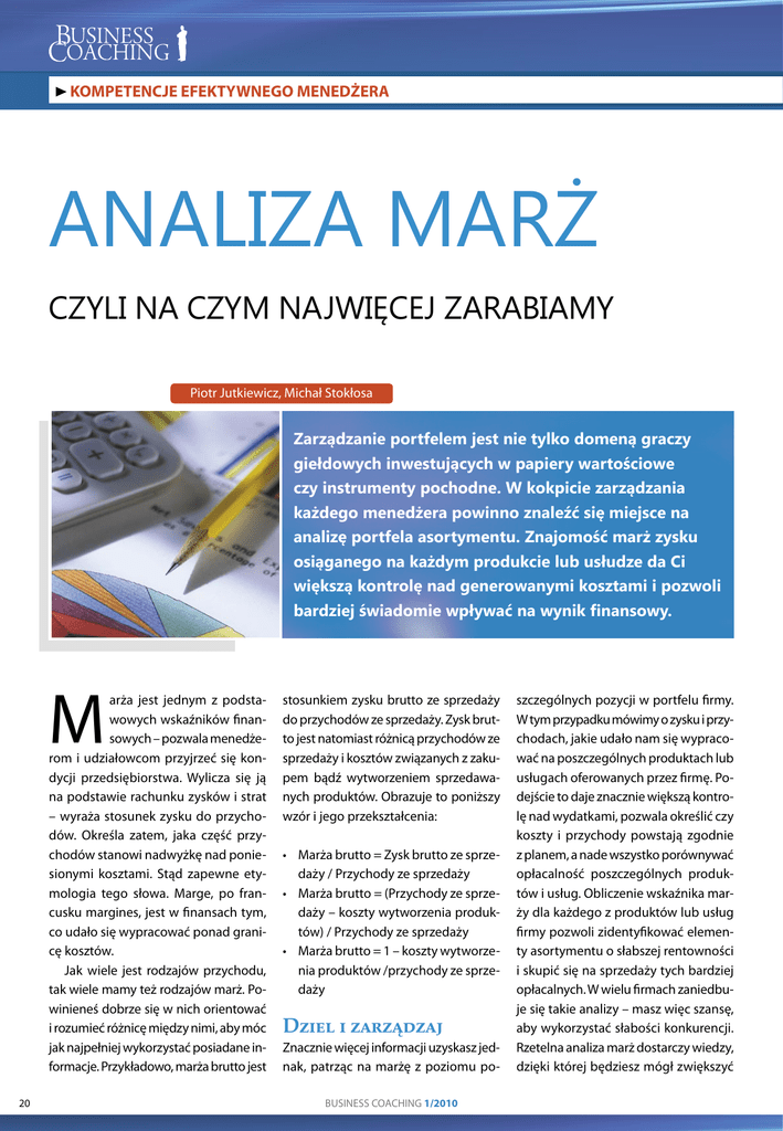 KOMPETENCJE EFEKTYWNEGO MENEDŻERA ANALIZA MARŻ CZYLI NA CZYM NAJWIĘCEJ ZARABIAMY Piotr Jutkiewicz, Michał Stokłosa Zarządzanie portfelem jest nie tylko domeną graczy giełdowych inwestujących w papiery wartościowe czy instrumenty pochodne. W kokpicie zarządzania każdego menedżera powinno znaleźć się miejsce na analizę portfela asortymentu. Znajomość marż zysku osiąganego na każdym produkcie lub usłudze da Ci większą kontrolę nad generowanymi kosztami i pozwoli bardziej świadomie wpływać na wynik finansowy. M arża jest jednym z podstawowych wskaźników finansowych – pozwala menedżerom i udziałowcom przyjrzeć się kondycji przedsiębiorstwa. Wylicza się ją na podstawie rachunku zysków i strat – wyraża stosunek zysku do przychodów. Określa zatem, jaka część przychodów stanowi nadwyżkę nad poniesionymi kosztami. Stąd zapewne etymologia tego słowa. Marge, po francusku margines, jest w finansach tym, co udało się wypracować ponad granicę kosztów. Jak wiele jest rodzajów przychodu, tak wiele mamy też rodzajów marż. Powinieneś dobrze się w nich orientować i rozumieć różnicę między nimi, aby móc jak najpełniej wykorzystać posiadane informacje. Przykładowo, marża brutto jest 20 stosunkiem zysku brutto ze sprzedaży do przychodów ze sprzedaży. Zysk brutto jest natomiast różnicą przychodów ze sprzedaży i kosztów związanych z zakupem bądź wytworzeniem sprzedawanych produktów. Obrazuje to poniższy wzór i jego przekształcenia: • Marża brutto = Zysk brutto ze sprzedaży / Przychody ze sprzedaży • Marża brutto = (Przychody ze sprzedaży – koszty wytworzenia produktów) / Przychody ze sprzedaży • Marża brutto = 1 – koszty wytworzenia produktów /przychody ze sprzedaży D���� � ��������� Znacznie więcej informacji uzyskasz jednak, patrząc na marżę z poziomu poBUSINESS COACHING 1/2010 szczególnych pozycji w portfelu firmy. W tym przypadku mówimy o zysku i przychodach, jakie udało nam się wypracować na poszczególnych produktach lub usługach oferowanych przez firmę. Podejście to daje znacznie większą kontrolę nad wydatkami, pozwala określić czy koszty i przychody powstają zgodnie z planem, a nade wszystko porównywać opłacalność poszczególnych produktów i usług. Obliczenie wskaźnika marży dla każdego z produktów lub usług firmy pozwoli zidentyfikować elementy asortymentu o słabszej rentowności i skupić się na sprzedaży tych bardziej opłacalnych. W wielu firmach zaniedbuje się takie analizy – masz więc szansę, aby wykorzystać słabości konkurencji. Rzetelna analiza marż dostarczy wiedzy, dzięki której będziesz mógł zwiększyć >>> Analiza marż swoją kontrolę nad przychodami i wydatkami, tak aby wypracowany zysk był jak największy. Dane uzyskane z tego typu obliczeń niezbędne są nie tylko dla finansistów i menedżerów najwyższego szczebla. Wiedza o opłacalności sprzedaży poszczególnych produktów i usług jest potrzebna także działowi handlowemu czy marketingu przy budowie planów i strategii. Zadbaj więc o to, aby każdy zainteresowany dział miał łatwy dostęp do tych informacji. Dodatkowo marże liczyć można na poszczególnych klientach czy kanałach dystrybucji, co da wiedzę o ich opłacalności. Taki podział pozwoli Ci na bardziej wnikliwą ocenę sytuacji rynkowej. Obserwacja marż nie powinna być działaniem jednorazowym w firmie. Wykonywana sukcesywnie pozwoli śledzić zmiany zachodzące zarówno po stronie przychodów jak i kosztów. Może służyć także jako system wczesnego ostrzegania. Identyfikując spadki marż na poszczególnych produktach lub usługach, będziesz w stanie szybko i skutecznie reagować, używając np. działań marketingowych. Dlatego zalecamy stworzenie permanentnego systemu monitorin- gu marż, który nie pozwoli żadnym istotnym dla Twojej firmy zmianom przejść niezauważenie. J�� �������� ������ ����������� ����� Fundamentalnym elementem jest narzędzie, które na podstawie zgromadzonych danych dotyczących m.in. zaopatrzenia czy sprzedaży, przypisywać będzie powstające koszty i przychody poszczególnym produktom. Stworzenie takiego narzędzia może okazać się jednak niełatwe. Pierwsze schody pojawiają się, gdy liczona jest marża na kosztach bezpośrednich. Marża ta jest najbardziej podstawowym miernikiem rentowności danego produktu lub usługi. Przy jej kalkulacji bierzemy pod uwagę jedynie koszty wytworzenia danego elementu asortymentu. Pierwszym krokiem przy tworzeniu narzędzia służącego do monitoringu marż jest odpowiednie dostosowanie sytemu księgowego. Podstawą jest możliwość identyfikacji w systemie księgowym pojedynczego produktu lub usługi sprzedanego do pojedynczego odbiorcy w pojedynczej transakcji. Dzięki temu będziesz mógł przyporządko- wać przychody do konkretnych produktów, usług czy klientów, co jest podstawą liczenia marż. W tym wypadku rola menedżera sprowadza się więc do uzgodnienia z działem księgowym odpowiedniego planu kont. Następnie niezbędne jest odpowiednie przyporządkowanie kosztów zmiennych produkcji do produktu lub usługi. Pamiętaj, że koszt zmienny jest to koszt, który jest proporcjonalny do wielkości produkcji. Potrzebować będziesz trzech elementów: • kosztów poszczególnych surowców i innych kosztów zmiennych w danej jednostce czasu (dla firm usługowych: bezpośrednich kosztów przeprowadzenia usługi), • receptur/instrukcji mówiących o ilości zasobów zużywanych na pojedynczy produkt/usługę, • wielkości produkcji. Mając powyższe informacje, możesz już wyliczyć bezpośredni koszt wytworzenia pojedynczego produktu czy usługi po kosztach zmiennych. Zadanie to jest bardzo proste, każdy może samodzielnie wykonać odpowiednie obliczenia 5 GŁÓWNYCH MYŚLI 1. Współczesny menedżer powinien monitorowa