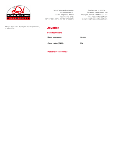 Kliknij na zdjęcie wózka, aby przejść na jego stronę internetową w naszej ofercie. Wózki Widłowe Blachdeker ul. Myślenicka 35, 32-031 Mogilany, Polska współrzędne GPS: 49° 56' 55.5485"N, 19° 53' 27.9925"E Telefon: +48 12 265 74 27 Sprzedaż: +48 606 605 100 Wynajem, serwis: +48 600 227 777 www.wozkiwidlowe24.com E-mail: [email protected] Joystick Dane techniczne Numer wewnętrzny: BD-631 Cena netto (PLN): Dodatkowe informacje 354