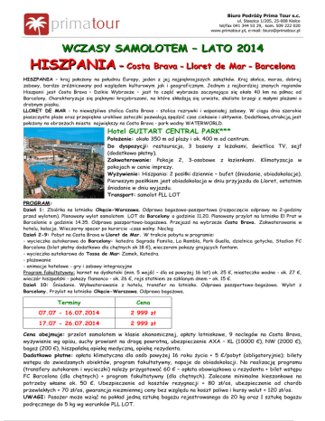 Biuro Podróży Prima Tour s.c. ul. Staszica 1/205, 25-008 Kielce tel/fax 041 344 53 29, kom. 509 222 020 www.primatour.pl, e-mail: [email protected] WCZASY SAMOLOTEM – LATO 2014 HISZPANIA - Costa Brava - Lloret de Mar - Barcelona HISZPANIA – kraj położony na południu Europy, jeden z jej najpiękniejszych zakątków. Kraj słońca, morza, dobrej zabawy, bardzo zróżnicowany pod względem kulturowym jak i geograficznym. Jednym z najbardziej znanych regionów Hiszpanii jest Costa Brava – Dzikie Wybrzeże – jest to część wybrzeża zaczynająca się około 40 km na północ od Barcelony. Charakteryzuje się pięknymi krajobrazami, na które składają się urwiste, skaliste brzegi z małymi plażami o drobnym piasku. LLORET DE MAR - to niewątpliwa stolica Costa Brava - stolica rozrywki i wspaniałej zabawy. W ciągu dnia szerokie piaszczyste plaże oraz przepiękne urokliwe zatoczki pozwalają spędzić czas ciekawie i aktywnie. Dodatkową atrakcją jest położony na obrzeżach miasta największy na Costa Brava - park wodny WATERWORLD. Hotel GUITART CENTRAL PARK*** Położenie: około 350 m od plaży i ok. 400 m od centrum. Do dyspozycji: restauracja, 3 baseny z leżakami, świetlica TV, sejf (dodatkowo płatny). Zakwaterowanie: Pokoje 2, 3-osobowe z łazienkami. Klimatyzacja w pokojach w cenie imprezy. Wyżywienie: Hiszpania: 2 posiłki dziennie – bufet (śniadanie, obiadokolacje). Pierwszym posiłkiem jest obiadokolacja w dniu przyjazdu do Lloret, ostatnim śniadanie w dniu wyjazdu. Transport: samolot PLL LOT PROGRAM: Dzień 1: Zbiórka na lotnisku Okęcie-Warszawa. Odprawa bagażowo-paszportowa (rozpoczęcie odprawy na 2-godziny przed wylotem). Planowany wylot samolotem LOT do Barcelony o godzinie 11.20. Planowany przylot na lotnisko El Prat w Barcelonie o godzinie 14.35. Odprawa paszportowo-bagażowa. Przejazd na wybrzeże Costa Brava. Zakwaterowanie w hotelu, kolacja. Wieczorny spacer po kurorcie -czas wolny. Nocleg Dzień 2-9: Pobyt na Costa Brava w Lloret de Mar. W trakcie pobytu w programie: - wycieczka autokarowa do Barcelony: katedra Sagrada Familia, La Rambla, Park Guella, dzielnica gotycka, Stadion FC Barcelona (bilet płatny dodatkowo dla chętnych ok 18 Є), wieczorem pokazy grających fontann. - wycieczka autokarowa do Tossa de Mar: Zamek, Katedra. - plażowanie - animacje hotelowe - gry i zabawy integracyjne Program fakultatywny: karnet na dyskoteki (min. 5 wejść – dla os powyżej 16 lat) ok. 25 Є, miasteczko wodne - ok. 27 Є, wieczór hiszpański - pokazy flamenco - ok. 26 Є, rejs statkiem ze szklanym dnem – ok. 15 Є. Dzień 10: Śniadanie. Wykwaterowanie z hotelu, transfer na lotnisko. Odprawa paszportowo-bagażowa. Wylot z Barcelony. Przylot na lotnisko Okęcie-Warszawa. Odprawa bagażowa. Terminy Cena 07.07 - 16.07.2014 2 999 zł 17.07 - 26.07.2014 2 999 zł Cena obejmuje: przelot samolotem w klasie ekonomicznej, opłaty lotniskowe, 9 noclegów na Costa Brava, wyżywienie wg opisu, suchy prowiant na drogę powrotną, ubezpieczenie AXA – KL (10000 Є), NW (2000 Є), bagaż (200 Є), hiszpańską opiekę medyczną, opiekę rezydenta. Dadatkowo płatne: opłata klimatyczna dla osób powyżej 16 roku życia + 5 Є/pobyt (obligatoryjnie); bilety wstępu do zwiedzanych obiektów, program fakultatywny, napoje do obiadokolacji. Na realizację programu (transfery autokarem i wycieczki) należy przygotować 60 Є – opłata obowiązkowa u rezydenta + bilet wstępu FC Barcelona (dla chętnych) + program fakultatywny (dla chętnych). Zalecane minimalne kieszonkowe na potrzeby własne ok. 50 Є. Ubezpieczenie od kosztów rezygnacji + 80 zł/os, ubezpieczenie od chorób przewlekłych + 70 zł/os, gwarancja niezmiennej ceny bez względu na koszt paliwa i kursy walut + 120 zł/os. UWAGI: Pasażer może wziąć na pokład jedną sztukę bagażu rejestrowanego do 20 kg oraz 1 sztukę bagażu podręcznego do 5 kg wg warunków PLL LOT.