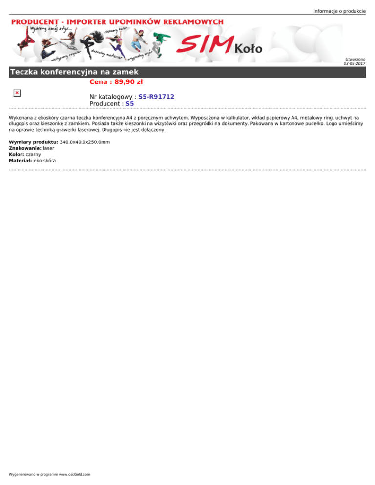 Informacje o produkcie Utworzono 03-03-2017 Teczka konferencyjna na zamek Cena : 89,90 zł Nr katalogowy : S5-R91712 Producent : S5 Wykonana z ekoskóry czarna teczka konferencyjna A4 z poręcznym uchwytem. Wyposażona w kalkulator, wkład papierowy A4, metalowy ring, uchwyt na długopis oraz kieszonkę z zamkiem. Posiada także kieszonki na wizytówki oraz przegródki na dokumenty. Pakowana w kartonowe pudełko. Logo umieścimy na oprawie techniką grawerki laserowej. Długopis nie jest dołączony. Wymiary produktu: 340.0x40.0x250.0mm Znakowanie: laser Kolor: czarny Materiał: eko-skóra Wygenerowano w programie www.oscGold.com