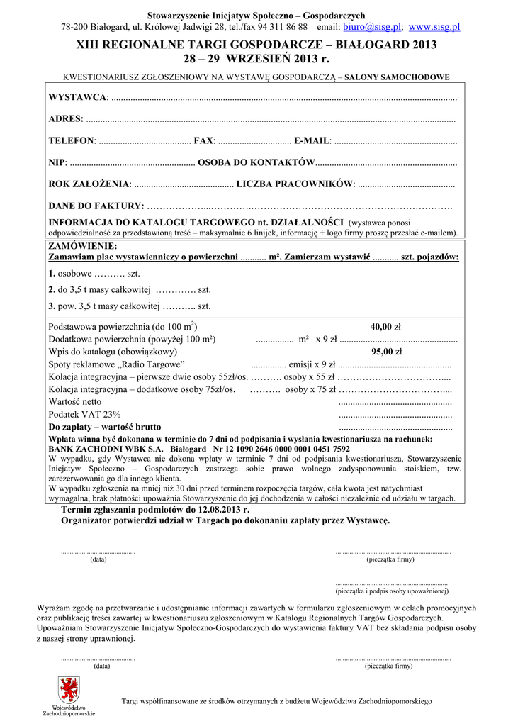 Stowarzyszenie Inicjatyw Społeczno – Gospodarczych 78-200 Białogard, ul. Królowej Jadwigi 28, tel./fax 94 311 86 88 email: [email protected]; www.sisg.pl XIII REGIONALNE TARGI GOSPODARCZE – BIAŁOGARD 2013 28 – 29 WRZESIEŃ 2013 r. KWESTIONARIUSZ ZGŁOSZENIOWY NA WYSTAWĘ GOSPODARCZĄ – SALONY SAMOCHODOWE WYSTAWCA: .................................................................................................................................................. ADRES: ............................................................................................................................................................ TELEFON: ....................................... FAX: ............................... E-MAIL: .................................................... NIP: ..................................................... OSOBA DO KONTAKTÓW............................................................ ROK ZAŁOŻENIA: .......................................... LICZBA PRACOWNIKÓW: ......................................... DANE DO FAKTURY: ………………...………….………………………………………………………. INFORMACJA DO KATALOGU TARGOWEGO nt. DZIAŁALNOŚCI (wystawca ponosi odpowiedzialność za przedstawioną treść – maksymalnie 6 linijek, informację + logo firmy proszę przesłać e-mailem). ZAMÓWIENIE: Zamawiam plac wystawienniczy o powierzchni ........... m². Zamierzam wystawić ........... szt. pojazdów: 1. osobowe ………. szt. 2. do 3,5 t masy całkowitej …………. szt. 3. pow. 3,5 t masy całkowitej ……….. szt. Podstawowa powierzchnia (do 100 m2) 40,00 zł Dodatkowa powierzchnia (powyżej 100 m²) ................ m² x 9 zł .................................................. Wpis do katalogu (obowiązkowy) 95,00 zł Spoty reklamowe „Radio Targowe” ............... emisji x 9 zł ................................................ Kolacja integracyjna – pierwsze dwie osoby 55zł/os. ………. osoby x 55 zł …………………………….... Kolacja integracyjna – dodatkowe osoby 75zł/os. ………. osoby x 75 zł …………………………….... Wartość netto ................................................ Podatek VAT 23% ................................................ Do zapłaty – wartość brutto ................................................ Wpłata winna być dokonana w terminie do 7 dni od podpisania i wysłania kwestionariusza na rachunek: BANK ZACHODNI WBK S.A. Białogard Nr 12 1090 2646 0000 0001 0451 7592 W wypadku, gdy Wystawca nie dokona wpłaty w terminie 7 dni od podpisania kwestionariusza, Stowarzyszenie Inicjatyw Społeczno – Gospodarczych zastrzega sobie prawo wolnego zadysponowania stoiskiem, tzw. zarezerwowania go dla innego klienta. W wypadku zgłoszenia na mniej niż 30 dni przed terminem rozpoczęcia targów, cała kwota jest natychmiast wymagalna, brak płatności upoważnia Stowarzyszenie do jej dochodzenia w całości niezależnie od udziału w targach. Termin zgłaszania podmiotów do 12.08.2013 r. Organizator potwierdzi udział w Targach po dokonaniu zapłaty przez Wystawcę. ........................................... (data) ................................................................... (pieczątka firmy) ................................................................. (pieczątka i podpis osoby upoważnionej) Wyrażam zgodę na przetwarzanie i udostępnianie informacji zawartych w formularzu zgłoszeniowym w celach promocyjnych oraz publikację treści zawartej w kwestionariuszu zgłoszeniowym w Katalogu Regionalnych Targów Gospodarczych. Upoważniam Stowarzyszenie Inicjatyw Społeczno-Gospodarczych do wystawienia faktury VAT bez składania podpisu osoby z naszej strony uprawnionej. ........................................... (data) ................................................................... (pieczątka firmy) Targi współfinansowane ze środków otrzymanych z budżetu Województwa Zachodniopomorskiego