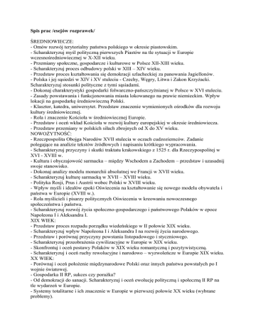 Spis prac /esejów rozprawek/ ŚREDNIOWIECZE: - Omów rozwój terytorialny państwa polskiego w okresie piastowskim. - Scharakteryzuj myśl polityczną pierwszych Piastów na tle sytuacji w Europie wczesnośredniowiecznej w X-XII wieku. - Przemiany społeczne, gospodarcze i kulturowe w Polsce XII-XIII wieku. - Scharakteryzuj proces odbudowy polski w XIII – XIV wieku. - Przedstaw proces kształtowania się demokracji szlacheckiej za panowania Jagiellonów. - Polska i jej sąsiedzi w XIV i XV stuleciu - Czechy, Węgry, Litwa i Zakon Krzyżacki. Scharakteryzuj stosunki polityczne z tymi sąsiadami. - Dokonaj charakterystyki gospodarki folwarczno-pańszczyźnianej w Polsce w XVI stuleciu. - Zasady powstawania i funkcjonowania miasta lokowanego na prawie niemieckim. Wpływ lokacji na gospodarkę średniowieczną Polski. - Klasztor, katedra, uniwersytet. Przedstaw znaczenie wymienionych ośrodków dla rozwoju kultury średniowiecznej. - Rola i znaczenie Kościoła w średniowiecznej Europie. - Przedstaw i oceń wkład Kościoła w rozwój kultury europejskiej w okresie średniowiecza. - Przedstaw przemiany w polskich siłach zbrojnych od X do XV wieku. NOWOŻYTNOŚĆ: - Rzeczpospolita Obojga Narodów XVII stulecia w oczach cudzoziemców. Zadanie polegające na analizie tekstów źródłowych i napisaniu krótkiego wypracowania. - Scharakteryzuj przyczyny i skutki traktatu krakowskiego z 1525 r. dla Rzeczypospolitej w XVI - XVIII w. - Kultura i obyczajowość sarmacka – między Wschodem a Zachodem – przedstaw i uzasadnij swoje stanowisko. - Dokonaj analizy modelu monarchii absolutnej we Francji w XVII wieku. - Scharakteryzuj kulturę sarmacką w XVII – XVIII wieku. - Polityka Rosji, Prus i Austrii wobec Polski w XVIII wieku. - Wpływ myśli i ideałów epoki Oświecenia na kształtowanie się nowego modelu obywatela i państwa w Europie (XVIII w.). - Rola myślicieli i pisarzy politycznych Oświecenia w kreowaniu nowoczesnego społeczeństwa i państwa. - Scharakteryzuj rozwój życia społeczno-gospodarczego i państwowego Polaków w epoce Napoleona I i Aleksandra I. XIX WIEK: - Przedstaw proces rozpadu porządku wiedeńskiego w II połowie XIX wieku. - Scharakteryzuj wpływ Napoleona I i Aleksandra I na rozwój życia narodowego. - Przedstaw i porównaj przyczyny powstania listopadowego i styczniowego. - Scharakteryzuj przeobrażenia cywilizacyjne w Europie w XIX wieku. - Skonfrontuj i oceń postawy Polaków w XIX wieku romantyczną i pozytywistyczną. - Scharakteryzuj i oceń ruchy rewolucyjne i narodowo – wyzwoleńcze w Europie XIX wieku. XX WIEK: - Porównaj i oceń położenie międzynarodowe Polski oraz innych państwa powstałych po I wojnie światowej. - Gospodarka II RP, sukces czy porażka? - Od demokracji do sanacji. Scharakteryzuj i oceń ewolucję polityczną i społeczną II RP na tle wydarzeń w Europie. - Systemy totalitarne i ich znaczenie w Europie w pierwszej połowie XX wieku (wybrane problemy). - Związki między Wielkim Kryzysem 1929, a kryzysem systemów demokratycznych. - Polacy w II wojnie światowej. - Porównaj programy polskiej lewicy komunistycznej oraz rządu polskiego na wychodźstwie ws. przebiegu polskiej granicy wschodniej po zakończeniu wojny. - Sytuacja ziem i społeczeństwa polskiego w czasie II wojny światowej. - Scharakteryzuj i oceń politykę Stalina wobec sprawy polskiej po II wojnie światowej. - Scharakteryzuj rolę kościoła w Polsce podczas II wojny światowej. - Porównaj skutki polityczne I i II wojny światowej. - Przedstaw podobieństwa i różnice w działaniach wojennych podczas I i II wojny światowej. - Przedstaw przyczyny powstania warszawskiego oraz oceń jego następstwa. - Drogi do wolności…- Scharakteryzuj przełomowe momenty w historii Polaków w latach 1944 – 1989. - Scharakteryzuj i oceń politykę Polski wobec NRD i RFN. - Scharakteryzuj problem Prus Wschodnich w stosunkach polsko-niemieckich w XX wieku. - Jaką rolę odegrał plan Marshalla w rozwoju gospodarczym państw. s. 79 Omega - Przedstaw proces przejmowania władzy w Polsce przez komunistów w latach 1944 – 1948. - Porównaj proces zdobywania władzy i umacniania jej przez komunistów w Polsce i w Jugosławii. Wskaż podobieństwa i różnice. - Różnice między I(1947) a II(1952) konstytucją. Wzmocniła, czy osłabiła wpływ obywateli na politykę państwa? - Komunizm w XX stuleciu. Na wybranym przykładzie (lub przykładach) scharakteryzuj jego ideologię i praktykę. - Przemiany społeczno - gospodarcze w Polsce w latach 1944-1956. Podkreśl ich specyfikę i dorobek, a także rolę propagandową dla tzw. "władzy ludowej". - Podłoże i efekty wydarzeń 1956 roku w Polsce - Scharakteryzuj i oceń zmiany ustroju społecznego i politycznego w Polsce po II wojnie światowej (do roku 1989).