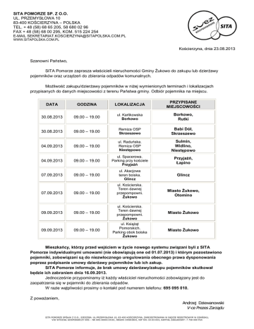 SITA POMORZE SP. Z O.O. UL. PRZEMYSŁOWA 10 83-400 KOŚCIERZYNA – POLSKA TEL. + 48 (58) 68 65 205, 58 680 02 96 FAX + 48 (58) 68 00 295, KOM. 515 224 254 E-MAIL [email protected] WWW.SITAPOLSKA.COM.PL Kościerzyna, dnia 23.08.2013 Szanowni Państwo, SITA Pomorze zaprasza właścicieli nieruchomości Gminy Żukowo do zakupu lub dzierżawy pojemników oraz urządzeń do zbierania odpadów komunalnych. Możliwość zakupu/dzierżawy pojemników w niżej wymienionych terminach i lokalizacjach przypisanych do danych miejscowości z terenu Państwa gminy. Odbiór pojemnika na miejscu. DATA GODZINA LOKALIZACJA PRZYPISANE MIEJSCOWOŚCI 30.08.2013 09.00 – 19.00 ul. Karlikowska Borkowo Borkowo, Rutki 30.08.2013 09.00 – 19.00 Remiza OSP Skrzeszewo Babi Dół, Skrzeszewo 04.09.2013 09.00 – 19.00 ul. Raduńska. Remiza OSP Niestępowo Sulmin, Widlino, Niestępowo 04.09.2013 09.00 – 19.00 ul. Spacerowa. Parking przy kościele Przyjaźń Przyjaźń, Łapino 07.09.2013 09.00 – 19.00 ul. Akacjowa teren boiska. Glincz Glincz ul. Kościerska. Teren dawnej przepompowni. Żukowo Miasto Żukowo, Otomino 07.09.2013 09.00 – 19.00 09.09.2013 09.00 – 19.00 ul. Kościerska. Teren dawnej przepompowni. Żukowo Miasto Żukowo 09.00 – 19.00 ul. Książąt Pomorskich. Parking obok boiska Żukowo Miasto Żukowo 09.09.2013 Mieszkańcy, którzy przed wejściem w życie nowego systemu związani byli z SITA Pomorze indywidualnymi umowami (nie obowiązują one od 01.07.2013) i którym pozostawiono pojemniki, zobowiązani są do niezwłocznego uregulowania obecnego prawa dysponowania poprzez podpisanie umowy dzierżawy pojemników lub ich zakup. SITA Pomorze informuje, że brak umowy dzierżawy/zakupu pojemników skutkował będzie ich zabraniem dnia 16.09.2013. Jednocześnie przypominamy iż każdy właściciel nieruchomości zobowiązany jest do zaopatrzenia się w pojemniki do zbierania odpadów. W razie wątpliwości prosimy o kontakt pod numerem telefonu: 695 095 010. Z poważaniem, Andrzej Dziewanowski V-ce Prezes Zarządu SITA POMORZE SPÓŁKA Z O.O., SIEDZIBA: UL.PRZEMYSŁOWA 10, 83-400 KOŚCIERZYNA, ZAREJESTROWANA W SĄDZIE REJESTROWYM W GDAŃSKU, VIII WYDZIAŁ GOSPODARCZY KRS – NR KRS 0000119181, REGON 190943843, NIP 591-10-03-833, KAPITAŁ ZAKŁADOWY: 7 758 000 PLN