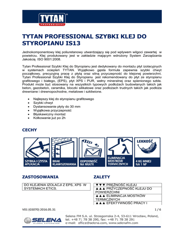 TYTAN PROFESSIONAL SZYBKI KLEJ DO STYROPIANU IS13 Jednokomponentowy klej poliuretanowy utwardzający się pod wpływem wilgoci zawartej w powietrzu. Klej produkowany jest w zakładzie mającym wdrożony System Zarządzania Jakością ISO 9001:2008. Tytan Professional Szybki Klej do Styropianu jest dedykowany do montażu płyt izolacyjnych w systemach ociepleń TYTAN. Wyjątkowo gęsta formuła zapewnia szybki chwyt początkowy, precyzyjną pracę z płytą oraz silną przyczepność do klejonej powierzchni. Tytan Professional Szybki Klej do Styropianu jest rekomendowany do płyt ze styropianu grafitowego i białego, (EPS), płyt XPS i PUR, wełny mineralnej oraz spienionego szkła. Produkt może być stosowany na wszystkich typowych podłożach budowlanych takich jak beton, gazobeton, ceramika, bloczki silikatowe oraz podłożach trudnych takich jak podłoża drewniane i drewnopochodne, metalowe i szkliwione. Najlepszy klej do styropianu grafitowego Szybki chwyt Dystansowanie płyty do 30 mm Wyjątkowa przyczepność Błyskawiczny montaż Kołkowanie już po 2h CECHY ZASTOSOWANIA DO KLEJENIA IZOLACJI Z EPS, XPS W SYSTEMACH ETICS. V01 (GS070) 2016.05.31 ZALETY ▼▼▼ PRĘŻNOŚĆ KLEJU ▲▲▲ PRZYCZEPNOŚĆ KLEJU DO POWIERZCHNI ▲▲▲ ELIMINACJA MOSTKÓW TERMICZNYCH ▲▲▲ EFEKTYWNOŚĆ PRACY I 1/6 CZYSTA TECHNOLOGIA ▲▲▲ wysoka(i); ▲▲ podwyższona(y); ■ normalna(y); ▼▼ obniżona(y); ▼▼▼ niska(i); - nie ma zastosowania WARUNKI APLIKACJI Temperatura puszki/ aplikatora [°C] (optymalnie +20°C) Temperatura otoczenia/ podłoża [°C] +10 ÷ +30 0 ÷ +35 SPOSÓB UŻYCIA Przed przystąpieniem do aplikacji zapoznaj się z instrukcją bezpieczeństwa podaną MSDS-ie. w 1. PRZYGOTOWANIE PODŁOŻA Klej aplikować zgodnie z zakresem temperatur otoczenia i podłoża podanej w tabeli powyżej. Podłoże nie może być oblodzone, oszronione lub pokryte śniegiem. Zabezpieczyć powierzchnie narażone na przypadkowe zabrudzenie klejem. Jeśli powierzchnia płyty styropianowej jest hydrofobowa lub pokryta powłoką należy powierzchnię klejoną przed użyciem przetrzeć za pomocą papieru ściernego aby zwiększyć adhezję kleju do powierzchni płyty styropianowej. 2. PRZYGOTOWANIE PRODUKTU Zbyt zimną puszkę doprowadzić do temperatury pokojowej np. przez zanurzenie w ciepłej wodzie o temperaturze do +30°C lub pozostawić w temperaturze pokojowej przez min 24h. Temperatura aplikatora nie może być niższa niż temperatura puszki. 3. APLIKACJA Założyć rękawiczki ochronne. Energicznie wstrząsać puszką (10-20 sek. zaworem w dół) w celu dokładnego wymieszania składników. Przykręcić puszkę do aplikatora. Pozycją roboczą puszki jest pozycja „zaworem w dół”. Poniżej podane są sposoby aplikacji kleju: SPOSÓB KLEJENIA PŁYT STYROPIANOWYCH DO ŚCIAN PIONOWYCH Około 2cm grubości warkocz kleju nanieść na płytę styropianową zgodnie z poniższym rysunkiem: V01 (GS070) 2016.05.31 2/6 Wielkość strumienia i szybkość aplikacji regulować siłą nacisku na spust aplikatora. Przy dużych nierównościach warkocz kleju nakładać podwójnie. Bezpośrednio po nałożeniu kleju docisnąć płytę do ściany, miażdżąc warkocz kleju do połowy jego grubości i wstępnie ustawić położenie płyty. Należy bezwzględnie unikać całkowitego zmiażdżenia warkocza. Po kilku minutach, przy użyciu poziomicy lub długiej łaty, skorygować końcowe ustawienie płyty poprzez ponowne jej dociśnięcie i delikatne odciągnięcie od podłoża. Należy zwrócić uwagę by nie zerwać wiązania. Ustawienie płyty można korygować do około 10 minut od momentu jej pierwszego przyłożenia do ściany. Maksymalna grubość szczeliny do 30 mm. Pierwsza warstwa klejonych płyt musi się wspierać na listwie startowej. Izolowanie powierzchni nad nadprożami wykonywać z użyciem specjalnych elementów mocujących. Należy osłaniać izolowane powierzchnie podczas niekorzystnych warunków pogodowych tj. deszczu oraz wiatru. Należy zastosować dyble do mocowania płyt styropianowych zgodnie z wytycznymi zalecanymi dla systemu ETICS. 4. PRACE PO ZAKOŃCZENIU APLIKACJI Jeśli pracę przerywa się na dłużej niż 5 minut dyszę aplikatora ze świeżym klejem a także zawór należy wyczyścić czyścikiem do pian poliuretanowych oraz wstrząsnąć puszkę przed ponowna aplikacją. 5. OGRANICZENIA / UWAGI Szybkość utwardzania w tym czas korygowalności jest silnie zależna od panującej temperatury i wilgotności powietrza. Im temperatura aplikacji jest wyższa tym czas ten ulega skróceniu. Im temperatura jest niższa i bliższa minimalnej temperaturze aplikacji tym czas korekcji może ulec wydłużeniu. Producent rekomenduje dokonywanie każdorazowo korekty położenia zamocowanych płyt. Klej wykazuje brak przyczepności do polietylenu, polipropylenu, poliamidu, silikonu i teflonu. Klej jest bezpieczny dla płyt styropianowych; nie niszczy ich. Świeży klej usuwać czyścikiem do pian poliuretanowych przy czym należy zwrócić uwagę , że czyścik może niszczyć płytę styropianową. V01 (GS070) 2016.05.31 3/6 Utwardzony klej można usunąć jedynie mechanicznie (np. za pomocą noża). Jakość i stan techniczny użytego aplikatora wpływa na parametry finalnego produktu. Nie stosować kleju w pomieszczeniach bez dostępu świeżego powietrza i słabo wentylowanych a także chronić przed nagrzewaniem pojemnika powyżej 50°C. DANE TECHNICZNE Kolor szary Parametr (+23°C/50% RH) 1) Wydajność (pokrycie powierzchni) [m²] 2) Wydajność [metry bieżące] 2) Czas pełnego utwardzania [godzina] (RB024) Czas otwarty [min] 3) Czas korekty [min] Współczynnik przewodzenia ciepła (λ) [W/mK] (RB024) Możliwość dyblowania [h] Klasa palności (DIN 4102) Klasa palności (EN 13501-1:2008) Powierzchnia* Przyczepność do betonu [MPa] Przyczepność do betonu komórkowego [MPa] Przyczepność do cegły ceramicznej porotherm [MPa] Przyczepność do drewna (sosna) [MP