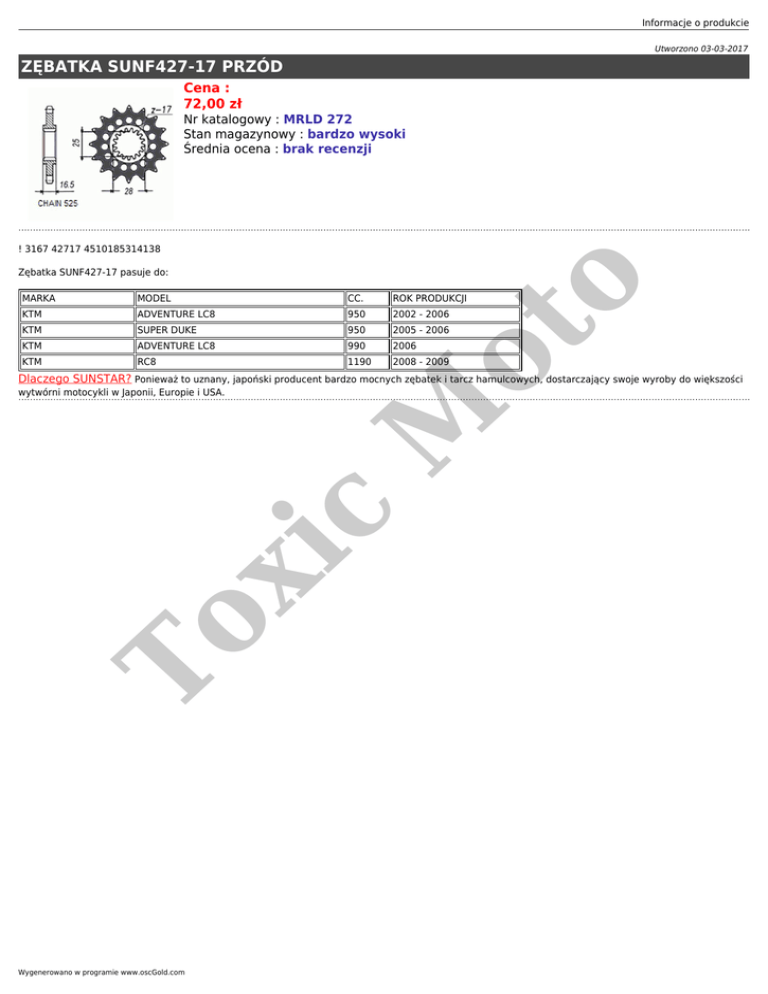 Informacje o produkcie Utworzono 03-03-2017 ZĘBATKA SUNF427-17 PRZÓD Cena : 72,00 zł Nr katalogowy : MRLD 272 Stan magazynowy : bardzo wysoki Średnia ocena : brak recenzji Zębatka SUNF427-17 pasuje do: ot o ! 3167 42717 4510185314138 MARKA MODEL CC. ROK PRODUKCJI KTM ADVENTURE LC8 950 2002 - 2006 KTM SUPER DUKE 950 2005 - 2006 KTM ADVENTURE LC8 990 2006 KTM RC8 1190 2008 - 2009 Dlaczego SUNSTAR? Ponieważ to uznany, japoński producent bardzo mocnych zębatek i tarcz hamulcowych, dostarczający swoje wyroby do większości To xi c M wytwórni motocykli w Japonii, Europie i USA. Wygenerowano w programie www.oscGold.com