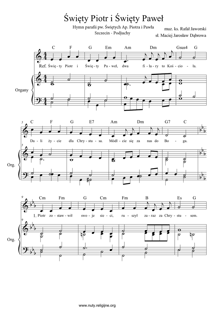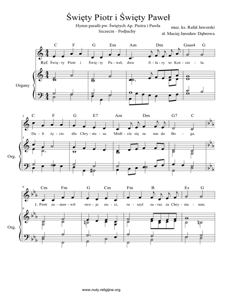 Święty Piotr i Święty Paweł Hymn parafii pw. Świętych Ap. Piotra i Pawła Szczecin - Podjuchy 3 %3 œ œ œ œ C F Ref. Świę - ty Piotr i 3 % 3 ˙ϖ Organy > 3 ˙˙ 3 C Da - li 5 Org. > ˙œ œ ˙œ œ 9 Org. ży - cie % œœ œ ˙ ˙− αα Cm ˙œ G > α ˙˙ αα ˙ ˙ œ E7 œ œ œ œ ϖ ˙œ ˙ œ ∀˙ G œ− ˙ œ œ ϖ ι ι œ œ ˙ œ nas do œϖ œ œ œ œ œ Dm G7 œ œ œ˙ œ œ Bo ˙˙ ι ι œ œι œι œ ˙ za - raz za Chry - stu ˙˙ œœ œœ œœ œœ www.nuty.religijne.org ααα ααα œ œ ˙ ˙ ˙ B ˙ ˙ ˙ ˙˙ ru - szył ˙ ˙ ła. ˙ sie - ci, ˙ œ ˙ ga. - Fm œ G C Cm œ - ι œ œ œ œœ œœ ϖϖ Módl - cie się za ˙ œ Gsus4 fi - la - ry to Koś - cio dwa ι ιœ œ œ Am µ œ˙ œ œœ œœ ˙− ˙ Dm ϖœ œ œ œ œ œ œ œ œ swo - je ι œι ι œι œι ˙ œ œ Am œ˙− − ˙ dla Chry - stu - sa. Fm ˙˙ ˙ œ œ œ œ 1. Piotr zo - staw - wił α %αα ˙ ˙ Pa - weł, ˙ϖ % α œ œ œ œ 9 Świę - ty ˙ F Em œ œ œ œ ˙ %œ œ œ œ 5 G muz. ks. Rafał Jaworski sł. Maciej Jarosław Dąbrowa Es ϖ̇ ˙ ααα G - ˙ sem. µ˙ ˙˙ Święty Piotr i Święty Paweł 2 αα % α œ œ œ œ 13 C Pan mu pry - mat α % α α œϖ œ œ œ 13 Org. Fm > α µ ˙˙ αα B Es œ œ œ œ œ˙ œ œ ˙ œ dał wśród u - czniów œ α œœ œ ˙˙ As œ i œ dał ˙ œ œ œ ˙− œ œ œ ˙ 2. Szaweł, prześladowca chrześcijan, Spotkał Pana pod Damaszkiem. Oślepiony Jego blaskiem, Stał się Chrystusowym świadkiem. Ref. Święty Piotr i święty Paweł ... 3. Zakładali Kościół święty. Piotr jest jego fundamentem. Paweł głosił pośród pogan, Niestrudzenie nauki święte. Ref. Święty Piotr i święty Paweł ... 4. Obaj w Rzymie nawracali, Znosząc wiele prześladowań. Oddał życie Piotr na krzyżu, Paweł, głowę ofiarował. Ref. Święty Piotr i święty Paweł ... 5. Nasi święci Patronowie, Do Jezusa nas prowadźcie W wierze i miłości bratniej, Chcemy być tylko Chrystusa. Ref. Święty Piotr i święty Paweł ... www.nuty.religijne.org ι œ œι œι œι ˙ Fm D7 Gsus4 G ˙ do Kró - le - stwa Klu - cze. œ œ œ œ ˙˙ ˙ µ˙ œ µœ ˙ ∀œ ϖ ϖ