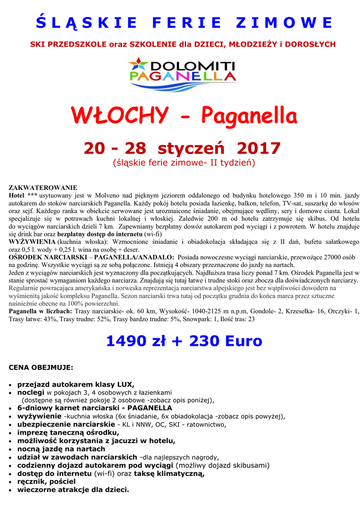 ŚLĄSKIE FERIE ZIMOWE SKI PRZEDSZKOLE oraz SZKOLENIE dla DZIECI, MŁODZIEŻY i DOROSŁYCH WŁOCHY - Paganella 20 - 28 styczeń 2017 (śląskie ferie zimowe- II tydzień) ZAKWATEROWANIE Hotel *** usytuowany jest w Molveno nad pięknym jeziorem oddalonego od budynku hotelowego 350 m i 10 min. jazdy autokarem do stoków narciarskich Paganella. Każdy pokój hotelu posiada łazienkę, balkon, telefon, TV-sat, suszarkę do włosów oraz sejf. Każdego ranka w obiekcie serwowane jest urozmaicone śniadanie, obejmujące wędliny, sery i domowe ciasta. Lokal specjalizuje się w potrawach kuchni lokalnej i włoskiej. Zaledwie 200 m od hotelu zatrzymuje się skibus. Od hotelu do wyciągów narciarskich dzieli 7 km. Zapewniamy bezpłatny dowóz autokarem pod wyciągi i z powrotem. W hotelu znajduje się drink bar oraz bezpłatny dostęp do internetu (wi-fi) WYŻYWIENIA (kuchnia włoska): Wzmocnione śniadanie i obiadokolacja składająca się z II dań, bufetu sałatkowego oraz 0,5 l. wody + 0,25 l. wina na osobę + deser. OŚRODEK NARCIARSKI – PAGANELLA/ANADALO: Posiada nowoczesne wyciągi narciarskie, przewożące 27000 osób na godzinę. Wszystkie wyciągi są ze sobą połączone. Istnieją 4 obszary przeznaczone do jazdy na nartach. Jeden z wyciągów narciarskich jest wyznaczony dla początkujących. Najdłuższa trasa liczy ponad 7 km. Ośrodek Paganella jest w stanie sprostać wymaganiom każdego narciarza. Znajdują się tutaj łatwe i trudne stoki oraz zbocza dla doświadczonych narciarzy. Regularnie powracająca amerykańska i norweska reprezentacja narciarstwa alpejskiego jest bez wątpliwości dowodem na wyśmienitą jakość kompleksu Paganella. Sezon narciarski trwa tutaj od początku grudnia do końca marca przez sztuczne naśnieżnie obecne na 100% powierzchni. Paganella w liczbach: Trasy narciarskie- ok. 60 km, Wysokość- 1040-2125 m n.p.m, Gondole- 2, Krzesełka- 16, Orczyki- 1, Trasy łatwe: 43%, Trasy trudne: 52%, Trasy bardzo trudne: 5%, Snowpark: 1, Ilość tras: 23 1490 zł + 230 Euro CENA OBEJMUJE: przejazd autokarem klasy LUX, noclegi w pokojach 3, 4 osobowych z łazienkami (dostępne są również pokoje 2 osobowe -zobacz opis poniżej), 6-dniowy karnet narciarski - PAGANELLA wyżywienie -kuchnia włoska (6x śniadanie, 6x obiadokolacja -zobacz opis powyżej), ubezpieczenie narciarskie - KL i NNW, OC, SKI - ratownictwo, imprezę taneczną ośrodku, możliwość korzystania z jacuzzi w hotelu, nocną jazdę na nartach udział w zawodach narciarskich -dla najlepszych nagrody, codzienny dojazd autokarem pod wyciągi (możliwy dojazd skibusami) dostęp do internetu (wi-fi) oraz taksę klimatyczną, ręcznik, pościel wieczorne atrakcje dla dzieci. UWAGI: • Odpłatność w pokoju 2 osobowym za osobę: 1550 zł + 230 Euro (zgłoszenie przy rezerwacji) • Dziecko w wieku do 10 lat- odpłatność: 1300 zł + odpłatność w Euro (nieukończony 11 r. ż. w dniu wyjazdu) zakwaterowanie w pokoju z 2 osobami dorosłymi) • Odpłatność w pokoju 1 osobowym: 1550 zł + 230 Euro + 8 Euro/dzień (zgłoszenie przy rezerwacji) • Junior urodzony po 30.11.2000 -odpłatność: 185 Euro + odpłatność w zł • Dziecko urodzone po 30.11.2008 -odpłatność: 75 Euro + odpłatność w zł • Senior urodzony przed 30.11.1951 -odpłatność: 215 Euro + odpłatność w zł • Dojazd własnym środkiem transportu (również dojazdy pod wyciągi): zniżka -180 zł/osoba (zgłoszenie przy rezerwacji) • Zwrotna kaucja za karnet narciarski- 5 Euro • Przy znacznej podwyżce cen paliwa lub/i ceny Euro, cena wyjazdu może ulec podwyższeniu, • Istnieje możliwość zorganizowania opieki -ski przedszkole oraz szkolenia dla dzieci (zobacz opis poniżej) oraz szkolenia narciarskiego dla dorosłych (zgłoszenie przy rezerwacji) • Wyjazd dla członków klubu! • Dla dzieci i młodzieży obowiązkowe kaski! OPIS SZKOLENIA i SKI PRZEDSZKOLA NARCIARSKIEGO W ramach szkolenia/opieki nad dziećmi i młodzieżą zapewniamy codzienne zajęcia narciarskie od rana do przerwy obiadowej. Będziemy realizowali program nauki i doskonalenia jazdy na nartach, w oparciu o formę zabawową jak również elementy formy sportowej. Planujemy szkolenie jazdy na tyczkach oraz zawody z nagrodami. Będziemy filmować na stoku postępy, a następnie wieczorem wspólnie je analizować. Chcemy dzieciom również wieczorami zapełnić czas grami i zabawami integracyjnymi oraz ciekawymi bajkami/filmami. ZGŁOSZENIE PRZY REZERWACJI! UWAGI do szkolenia: • Warunkiem uczestnictwa w szkoleniu dzieci i młodzieży jest posiadanie podstawowych umiejętności narciarskich oraz poruszania się wyciągami narciarskimi • Dzieci i młodzież oraz osoby dorosłe tzw. „zerowe” (nie posiadające podstawowych umiejętności narciarskich) - przed zapisem na wyjazd, prosimy o kontakt telefoniczny • Przy grupie chętnych dzieci, istnieje możliwość zorganizowania opieki całodniowej na stoku • Ski przedszkole oraz szkolenie narciarskie jest dodatkowo płatne Tutaj można zobaczyć jak wyglądało ski przedszkole oraz szkolenie na ostatnich wyjazdach: http://www.powersport.com.pl/?strona=galerie&id=171 WPŁATY: I zaliczka: 500 zł/osoba -jak najszybciej II rata: reszta w złotówkach -do 15.12.2016 III rata: Euro płatne w dniu wyjazdu ZAPISY wyłącznie poprzez formularz rezerwacyjny na stronie klubowej: www.powersport.com.pl INFORMACJE: Pałac Młodzieży w Katowicach -Klub Sportowego Reagowania *PowerSport* Paweł Nowojski +48 605-336-999 Witek Twardosz +48 609-500-519 Bogdan Łusiak +48 607-690-126 [email protected]