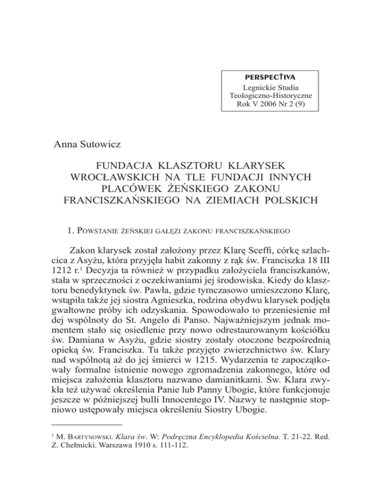 122 ANNA SUTOWICZ † PERSPECTIVA Legnickie Studia Teologiczno-Historyczne Rok V 2006 Nr 2 (9) Anna Sutowicz FUNDACJA KLASZTORU KLARYSEK WROCŁAWSKICH NA TLE FUNDACJI INNYCH PLACÓWEK ŻEŃSKIEGO ZAKONU FRANCISZKAŃSKIEGO NA ZIEMIACH POLSKICH 1. POWSTANIE ŻEŃSKIEJ GAŁĘZI ZAKONU FRANCISZKAŃSKIEGO Zakon klarysek został założony przez Klarę Sceffi, córkę szlachcica z Asyżu, która przyjęła habit zakonny z rąk św. Franciszka 18 III 1212 r.1 Decyzja ta również w przypadku założyciela franciszkanów, stała w sprzeczności z oczekiwaniami jej środowiska. Kiedy do klasztoru benedyktynek św. Pawła, gdzie tymczasowo umieszczono Klarę, wstąpiła także jej siostra Agnieszka, rodzina obydwu klarysek podjęła gwałtowne próby ich odzyskania. Spowodowało to przeniesienie mł dej wspólnoty do St. Angelo di Panso. Najważniejszym jednak momentem stało się osiedlenie przy nowo odrestaurowanym kościółku św. Damiana w Asyżu, gdzie siostry zostały otoczone bezpośrednią opieką św. Franciszka. Tu także przyjęto zwierzchnictwo św. Klary nad wspólnotą aż do jej śmierci w 1215. Wydarzenia te zapoczątkowały formalne istnienie nowego zgromadzenia zakonnego, które od miejsca założenia klasztoru nazwano damianitkami. Św. Klara zwykła też używać określenia Panie lub Panny Ubogie, które funkcjonuje jeszcze w późniejszej bulli Innocentego IV. Nazwy te następnie stopniowo ustępowały miejsca określeniu Siostry Ubogie. 1 M. BARTYNOWSKI. Klara św. W: Podręczna Encyklopedia Kościelna. T. 21-22. Red. Z. Chełmicki. Warszawa 1910 s. 111-112. Funkcja klasztoru klarysek wrocławskich 123 Przez 27 lat życia zakonnego Klara broniła owego charyzmatu ubóstwa, ze szczególnym zacięciem, dopominając się osobnego przywileju papieskiego, na mocy którego siostry damianitki miałyby prawo żyć z pracy rąk i żebraniny, tak jak ich bracia franciszkanie. Pomysł ten był bezprecedensową nowością, stawiającą paradoksalnie żeńską gałąź zakonu na równi z męską, w równym stopniu niezależności od finansowej woli fundatorów, a także podkreślającą niemniejszą funkcję społeczno-ewangelizacyjną sióstr mimo ich klauzurowego odcięcia od świata zewnętrznego. Przywilej ten wydany przez papieża Inocentego III w 1216 r. i potwierdzony przez Grzegorza IX w 1228 r., nie znalazł jednak niestety następnie odzwierciedlenia w regule przygotowanej dla klarysek przez kard. Hugolina w 1219 r. i zatwierdzonej przez Grzegorza IX. Reguła ta wprowadzała wiele elementów stylu życia benedyktynek, w tym podział sióstr na tzw. chóry oraz możliwość posiadania dóbr materialnych. Klara nie poddała się jednak w swej batalii o ubóstwo Pań Ubogich. Odbija się ona szerokim echem w listach do błogosławionej Agnieszki Praskiej, pierwszej klaryski w Czechach, której klasztor stał się źródłem ekspansji nowego zakonu na północ Europy. Pisze o tym także w Testamencie znanym tylko z późniejszych odpisów w językach narodowych. W 1253 r. ułożyła własną regułę zakonną według ducha franciszkańskiego, która jednak przyjęła się tylko w klasztorze damianitek w Asyżu. W pozostałych zgromadzeniach obowiązywała bądź reguła kardynała Hugolina, bądź też Innocentego IV, który w 1247 r. zatwierdził formam vitae wprowadzającą do benedyktyńskiego stylu życia klasztorów klarysek elementy franciszkańskie takie jak posługa franciszkanów, ich pomoc materialna i duchowa, przywilej ubóstwa, posłuszeństwo klarysek wobec Kościoła z posługą głoszenia Ewangelii2. Ta różnorodność obowiązujących reguł wynikała z dużej autonomii poszczególnych klasztorów. W 1229 r. powstał klasztor w Zamora jako pierwsza placówka poza damianitkami. W ciągu kilku lat zakon rozprzestrzenił się na półwyspie pirenejskim (w 1228 r. protektor zakonu kard. Rinaldo pisze o 24 klasztorach italskich) i następnie na kontynencie aż do Pragi (1233 r.). Należy zauważyć odmienny kierunek rozwoju zakonu męskiego franciszkanów i klarysek, które nie założyły ani jednego klasztoru w Niemczech aż do końca XIII w. Dopiero Omówienie reguł klarysek. C. NIEZGODA. Święta Klara z Asyżu w świetle Poverella. Kraków 1993 s. 134 nn. 2 124 ANNA SUTOWICZ po fundacji wrocławskiej odnajdujemy powoli klasztory Pań Ubogich w Niemczech, Francji i na Węgrzech. Próby uporządkowania życia klasztornego tak wielkiej rodziny zakonnej podjął się w 1263 r. papież Urban IV, który sporządził nową regułę, bardzo obszerną i szczegółową. Choć posiadała ona charakter franciszkański, również zezwalała na posiadanie własności materialnej oraz wyjmowała klaryski spod bezpośredniej jurysdykcji franciszkanów. Niektóre jednak klasztory, na czele ze wspólnotą św. Damiana pozostały przy regule Klary zatwierdzonej w 1253 r. przez Innocentego IV. Gdy w 1253 r. umierała św. Klara, zostawiała swą rodzinę zakonną na początku burzliwego rozwoju. Przez całe swe życie święta założycielka wywierała ogromny wpływ na ukształtowanie duchowości klarysek. Pisała wiele listów kierowanych do powstających wspólnot, z których najwierniej i bez uszczerbku czasu dochowały się te pisane do księżniczki czeskiej Agnieszki osiadłej w klasztorze w Pradze. Kanonizowano ją w 1255 r. po krótkim procesie informacyjnym, którego akta zachowały się w całości. 2. PIERWSZE FUNDACJE KLASZTORÓW KLARYSEK NA ZIEMIACH POLSKICH Jeszcze za życia św. Klary powstały w Polsce pierwsze wspólnoty Pań Ubogich: w Zawichoście i Wrocławiu, obydwie z inspiracji i przy wydatnej pomocy św. Agnieszki Praskiej. Ta niezwykła postać pochodziła z rodziny królów węgierskich. Po kądzieli spokrewniona była z inną franciszkanką św. Elżbietą turyńską, a także św. Małgorzatą, św. Kingą i bł. Jolantą, późniejszymi fundatorkami klasztorów w Gnieźnie i Starym Sączu. Na tym samym dworze, jako żona Beli IV przebywała także fund