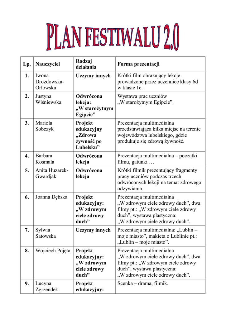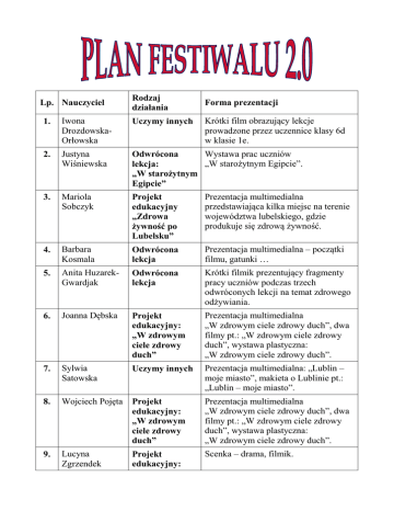 Lp. Nauczyciel Rodzaj działania Forma prezentacji Krótki film obrazujący lekcje prowadzone przez uczennice klasy 6d w klasie 1e. 1. Iwona DrozdowskaOrłowska Uczymy innych 2. Justyna Wiśniewska Wystawa prac uczniów Odwrócona „W starożytnym Egipcie”. lekcja: „W starożytnym Egipcie” 3. Mariola Sobczyk Projekt edukacyjny „Zdrowa żywność po Lubelsku” Prezentacja multimedialna przedstawiająca kilka miejsc na terenie województwa lubelskiego, gdzie produkuje się zdrową żywność. 4. Barbara Kosmala Odwrócona lekcja Prezentacja multimedialna – początki filmu, gatunki … 5. Anita HuzarekGwardjak Odwrócona lekcja Krótki filmik prezentujący fragmenty pracy uczniów podczas trzech odwróconych lekcji na temat zdrowego odżywiania. 6. Joanna Dębska Projekt edukacyjny: „W zdrowym ciele zdrowy duch” Prezentacja multimedialna „W zdrowym ciele zdrowy duch”, dwa filmy pt.: „W zdrowym ciele zdrowy duch”, wystawa plastyczna: „W zdrowym ciele zdrowy duch”. 7. Sylwia Satowska Uczymy innych Prezentacja multimedialna: „Lublin – moje miasto”, makieta o Lublinie pt.: „Lublin – moje miasto”. 8. Wojciech Pojęta Projekt edukacyjny: „W zdrowym ciele zdrowy duch” Prezentacja multimedialna „W zdrowym ciele zdrowy duch”, dwa filmy pt.: „W zdrowym ciele zdrowy duch”, wystawa plastyczna: „W zdrowym ciele zdrowy duch”. 9. Lucyna Zgrzendek Projekt edukacyjny: Scenka – drama, filmik. „Po zdrowie duszy i ciała na Lubelszczyznę” 10. Zofia Dzięcioł Uczymy innych Prezentacja multimedialna – pokaz slajdów. 11. Magdalena Stafińska Projekt edukacyjny: „Zdrowa żywność po Lubelsku” Prezentacja multimedialna przedstawiająca kilka miejsc na terenie województwa lubelskiego, gdzie produkuje się zdrową żywnośc. 12. Renata Grulich Projekt: „Lubelskie smaki” Film: „Jak pieczemy cebularza”. 13. Klaudia GołośRobak Projekt edukacyjny: „Zdrowy start” Wiersze. 14. Magdalena Hryniewicz Żebura Projekt edukacyjny: „Zdrowy start” Pokaz slajdów. 15. Justyna Iwanicka Projekt edukacyjny: „Zdrowe jedzenie” Praca plastyczna – wystawa. 16. Urszula Siodłowska Odwrócona lekcja: „Formu ochrony przyrody” Wystawa prac plastycznych, prezentacja multimedialna. 17. Maja Wolska Projekt edukacyjny: „Prosto z natury” Wystawa prac plastycznych, zdjęć z realizacji projektu (Tablica). Wystawa „Albumy o ziołach” – (zielnik). Rymowanki o ziołach, prace plastyczne. Rośliny wyhodowane przez uczniów na szkolnym parapecie. Ulotki dla zwiedzających: przepis na cebularza, o pszczołach, ziołach. Quiz dla zwiedzających. Ulotki – przepisy. Filmik. 18. Izabela Litwin Projekt edukacyjny: „Prosto z natury” Wystawa prac plastycznych, zdjęć z realizacji projektu (Tablica). 19 „Obliczanie pól wielokątów”. Prezentacja multimedialna dotyczących obliczania pól wielokątów. Jolanta Żukowska
