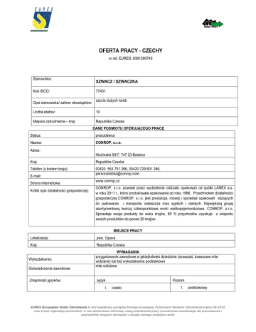 OFERTA PRACY - CZECHY nr ref. EURES: 8391290745 Stanowisko: Kod ISCO: Opis stanowiska/ zakres obowiązków: SZWACZ / SZWACZKA 77431 szycie dużych toreb Liczba etatów: 10 Miejsce zatrudnienia – kraj: Republika Czeska DANE PODMIOTU OFERUJĄCEGO PRACĘ Status: pracodawca Nazwa: CONROP, s.r.o. Adres: Hlučínská 93/7, 747 23 Bolatice Kraj: Republika Czeska Telefon (z kodem kraju): 00420 553 751 266, 00420 729 601 266, [email protected] E-mail: Strona internetowa: Krótki opis działalności gospodarczej: www.conrop.cz CONROP, s.r.o. powstał przez wydzielenie oddziału opakowań od spółki LANEX a.s. w roku 2011 r., która produkowała opakowania od roku 1986. Przedmiotem działalności gospodarczej CONROP, s.r.o. jest produkcja, rozwój i sprzedaż opakowań służących do pakowania i transportu zwłaszcza mas sypkich i ciekłych. Największą grupę asortymentową tworzą czteropunktowe worki wielkopojemnościowe. CONROP, s.r.o. Sprzedaje swoje produkty do wielu krajów, 85 % przychodów uzyskuje z eksportu swoich produktów do ponad 20 krajów. MIEJSCE PRACY Lokalizacja: pow. Opava Kraj: Republika Czeska Wykształcenie: Doświadczenie zawodowe: Znajomość języków: WYMAGANIA przygotowanie zawodowe w jakiejkolwiek dziedzinie (szwaczki, krawcowe mile widziane) lub też wykształcenie podstawowe mile widziane Język czeski Poziom 1. podstawowy EURES (Europejskie Służby Zatrudnienia) to sieć współpracy pomiędzy Komisją Europejską, Publicznymi Służbami Zatrudnienia krajów UE/ EOG oraz innych organizacji partnerskich, w celu dostarczania informacji, usług pośrednictwa pracy i poradnictwa zawodowego dla pracodawców i pracowników chcących skorzystać z zasady wolnego przepływu osób Uprawnienia/ dyplomy/ dokumenty: dobry stan zdrowia Inne istotne wymagania: Wysokość pensji brutto: WYNAGRODZENIE I WARUNKI ZATRUDNIENIA 9.500 CZK Wysokość pensji netto: http://www.vypocet.cz/cista-mzda Waluta, w jakiej wypłacana jest pensja: Korona czeska Rodzaj stawki wynagrodzenia: miesięczna Premie: b.d. Dodatkowe świadczenia zakwaterowanie wyżywienie Podróż: inne we własnym, zakresie dofinansowanie na wyżywienie, na koszt własny świadczenia pracownicze wynikające z układu zbiorowego pracy: dodatek za pracę na zmianie popołudniowej i nocnej, dodatek za pracę w sobotę, 21 dni urlopu + 4 dni wolne od pracy Nazwa firmy, z którą zostanie podpisana umowa: CONROP, s.r.o. Rodzaj umowy: umowa o pracę Wymiar czasu pracy pełen etat Czas trwania umowy: czas określony 6 miesięcy z możliwością przedłużenia praca w systemie dwuzmianowym (zmiana poranna od godz. 6.00 do 14.00, zmiana popołudniowa od godz. 14.00 do 22.00) Zmiany i praca w dni wolne: Liczba godzin tygodniowo: 40 Data rozpoczęcia: od zaraz Inne informacje: SPOSÓB SKŁADANIA WNIOSKU Wymagane dokumenty: CV Język, w którym muszą być sporządzone przedkładane dokumenty: polski lub czeski Do kogo należy wysłać dokumenty: do pracodawcy Gdzie należy wysłać dokumenty: [email protected] Dane teleadresowe doradcy EURES lub przedstawiciela pracodawcy: kontakt z Działem Kadr: tel. 553 751 266, 729 601 266, e-mail: [email protected] KOORDYNATOR Wojewódzki Urząd Pracy w Opolu WAŻNOŚĆ Data publikacji: 21.04.2015 Termin przedkładania podań o pracę / zakończenia ważności oferty: Do odwołania EURES (Europejskie Służby Zatrudnienia) to sieć współpracy pomiędzy Komisją Europejską, Publicznymi Służbami Zatrudnienia krajów UE/ EOG oraz innych organizacji partnerskich, w celu dostarczania informacji, usług pośrednictwa pracy i poradnictwa zawodowego dla pracodawców i pracowników chcących skorzystać z zasady wolnego przepływu osób Uprzejmie informujemy, że pracodawca skontaktuje się wyłącznie z wybranymi kandydatami. Urząd Pracy dokłada wszelkich starań, aby oferty pracy będące w zasobach urzędu, były rzetelne i wiarygodne. Ponieważ wszystkie oferty pracy pochodzą od osób trzecich Urząd Pracy zastrzega, że odpowiedzialność za ewentualne rozbieżności pomiędzy warunkami pracy zaprezentowanymi w niniejszej ofercie a warunkami zaproponowanymi przez potencjalnego pracodawcę ponosi pracodawca. Stosunek pracy z pracodawcą zagranicznym będzie zawarty w ramach prawa obowiązującego w kraju zatrudnienia. Oznacza to, że wszelkie roszczenie z tytułu nie wywiązywania się pracodawcy z warunków zawartych w umowie o pracę, dochodzić można wyłącznie w sądzie pracy w kraju zatrudnienia. W sytuacjach losowych pomoc polskich placówek konsularnych ogranicza się do ewentualnego udzielenia doraźnej pomocy (np. kredytu na zakup biletu powrotnego do Polski ). Na podstawie ustawy o ochronie danych osobowych z dnia 29 sierpnia 1997 r. (Dz. U. z 2014 r., poz.1182 ze zm.) informujemy, że administratorem danych osobowych wskazanych w dokumentach przekazanych w odpowiedzi na ofertę pracy jest pracodawca zagraniczny/ Wojewódzki Urząd Pracy w Opolu, ul. Głogowska 25C, 45-315 Opole Dane osobowe wskazane dobrowolnie w ww. dokumentach będą przetwarzane i udostępniane publicznym służbom zatrudnienia, pracodawcom lub podmiotom reprezentującym pracodawców do celów związanych z pośrednictwem pracy w ramach sieci EURES, na podstawie ustawy z dnia 20 kwietnia 2004 r. o promocji zatrudnienia i instytucjach rynku pracy (Dz. U. z 2013 r. , poz. 674 ze zm.) przez okres konieczny do osiągnięcia celu określonego w przedmiotowej ustawie. Osobie, której dane osobowe dotyczą przysługuje prawo dostępu do ich treści i prawo ich poprawiania. Więcej ofert pracy za granicą: www.eures.europa.eu www.eures.praca.gov.pl www.eures.wup.opole.pl EURES (Europejskie Służby Zatrudnienia) to sieć współpracy pomiędzy Komisją Europejską, Publicznymi Służbami Zatrudnienia krajów UE/ EOG oraz innych organizacji partnerskich, w celu dostarczania informacji, usług pośrednictwa pracy i poradnictwa zawodowego dla pracodawców i pracowników chcących skorzystać z zasady wolnego przep