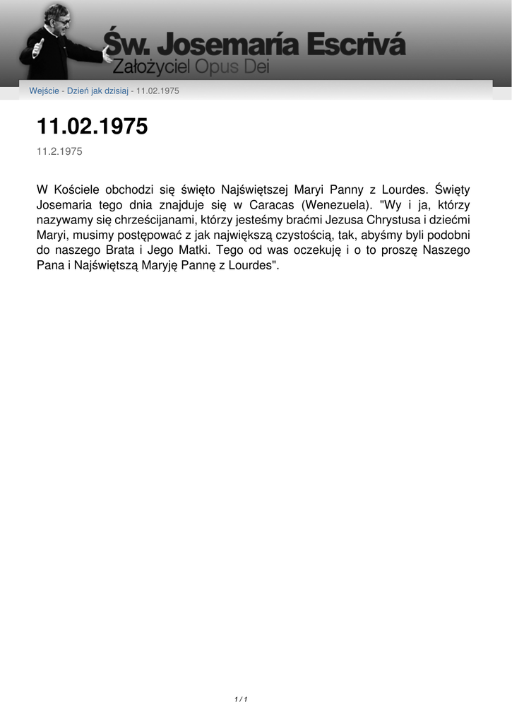 Wejście - Dzień jak dzisiaj - 11.02.1975 11.02.1975 11.2.1975 W Kościele obchodzi się święto Najświętszej Maryi Panny z Lourdes. Święty Josemaria tego dnia znajduje się w Caracas (Wenezuela). "Wy i ja, którzy nazywamy się chrześcijanami, którzy jesteśmy braćmi Jezusa Chrystusa i dziećmi Maryi, musimy postępować z jak największą czystością, tak, abyśmy byli podobni do naszego Brata i Jego Matki. Tego od was oczekuję i o to proszę Naszego Pana i Najświętszą Maryję Pannę z Lourdes". 1/1 Powered by TCPDF (www.tcpdf.org)