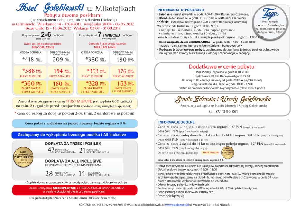 w Mikołajkach Pobyt z dwoma posiłkami ( ze śniadaniem i obiadem lub śniadaniem i kolacją ) w terminach: Wielkanoc 14 - 17.04.2017, Majówka 28.04 - 03.05.2017, Boże Ciało 15 - 18.06.2017, Wakacje 03.07 - 31.08.2017 2-6 noclegów Przy pobycie od cena wynosi Przy pobycie od *418 *388 PLN/ DOBA FIRST MINUTE *360 NIEODPŁATNIE DZIECKO 4-14 lat w pokoju rodziców ZŁOTA KARTA i FIRST MINUTE 209 PLN/ DOBA 194 PLN/ DOBA FIRST MINUTE 180 PLN/ DOBA W strefie All Inclusive w godz. 11.30-21.00 na powitanie w pokoju napoje: kawa, herbata, woda, soki, napoje gazowane słodycze firmy TAGO alkohole: piwo, wino, wódka 80ml/os., drinki oraz bufet deserowy i bufet zimnych przekąsek czynny w godz. 11.30-19.00 Dzieci do 7 lat w pokoju rodziców NIEODPŁATNIE PLN/ DOBA noclegów cena wynosi Dzieci do 4 lat w pokoju rodziców OSOBA DOROSŁA 7 i WIĘCEJ Przy pobycie na min. 7 noclegów OSOBA DOROSŁA w pokoju rodziców *380 PLN/ DOBA 190 PLN/ DOBA *353 PLN/ DOBA 176 PLN/ DOBA FIRST MINUTE *328 PLN/ DOBA ZŁOTA KARTA i FIRST MINUTE DZIECKO 7-14 lat FIRST MINUTE 163 PLN/ DOBA ZŁOTA KARTA i FIRST MINUTE PLN/ DOBA ZŁOTA KARTA i FIRST MINUTE Podczas tygodniowego pobytu zachęcamy do zamiany jednego posiłku bufetowego na wybór dań z karty Restauracji Zielonej. Rezerwacja w recepcji. Dodatkowo w cenie pobytu: Park Wodny Tropikana w godz. 8.00-21.00 Dyskoteka w Klubie Nocnym od godz. 22.00 Dancing w Restauracji Zielonej od godz. 20.00 w piątek i sobotę Zajęcia w Klubie dla Dzieci w godz. 10.00 - 17.00 Wstęp na całoroczne lodowisko (wypożyczenie łyżew 10 zł/ 1 godz.) Warunkiem otrzymania ceny FIRST MINUTE jest wpłata 60% zaliczki na min. 2 tygodnie przed przyjazdem (podane ceny uwzględniają rabat). Rezerwacja zabiegów w Studiu i Urody Gołębiewska OFERTA NAZdrowia POWITANIE * cena od osoby za dobę w pokoju 2-os. (min. 2 os. dorosłe w pokoju) tel. 87/ 42 90 861 Cena pokoi z widokiem na jezioro i baseny będzie wyższa o 5 % Zachęcamy do wykupienia trzeciego posiłku i All Inclusive DOPŁATA ZA TRZECI POSIŁEK 42 HOTELI GOŁĘBIEWSKI PLN/DOBA/ OSOBA DOROSŁA 21 PLN/DOBA/ DZIECKO DO LAT 14 Cena za dobę w pokoju 1-osobowym wynosi 627 PLN (przy 2-6 noclegach) oraz 570 PLN (przy 7 noclegach i więcej) Cena za dobę osoby dorosłej i 1 dziecka do 14 lat wynosi 731 PLN (przy 2-6 noclegach) oraz 665 PLN (przy 7 noclegach i więcej) Cena za dobę 2 dzieci do 14 lat w osobnym pokoju wynosi 627 PLN (przy 2-6 noclegach) oraz 570 PLN (przy 7 noclegach i więcej) Od w/w cen przysługują rabaty FIRST MINUTE HOTELI GOŁĘBIEWSKI DOPŁATA ZA ALL INCLUSIVE Cena pokoi z widokiem na jezioro i baseny będzie wyższa o 5 % DOTYCZY OFERTY Z TRZEMA POSIŁKAMI Pobyt rozpoczyna się obiadem lub kolacją (w zależności od wybranej oferty), kończy śniadaniem. Doba hotelowa trwa w godzinach 15:00 - 12:00 Istnieje możliwość nieodpłatnego przedłużenia doby hotelowej (w miarę dostępności miejsc) W dniu wyjazdu zapraszamy na obiad - bufet szwedzki w Restauracji Czerwonej w cenie 54 PLN/os. Złota Karta Hoteli Gołębiewski upoważnia do 7% rabatu. Oferta dotyczy pobytów indywidualnych Podane ceny zawierają podatek VAT w wysokości 8% i 23% i opłatę klimatyczną Hotel zastrzega sobie możliwość zmiany cen 28 PLN/DOBA/ OSOBA DOROSŁA 14 PLN/DOBA/ DZIECKO DO LAT 14 Dzieci korzystają NIEODPŁATNIE z RESTAURACJI SMAKOLANDIA w cenie wykupionej oferty z trzema posiłkami Dla pozostałych dzieci cena Smakolandii: 30 zł/dziecko /dobę Promocje łączą się KONTAKT: tel. +48 87/42 90 700-702; E-MAIL: [email protected]; www.golebiewski.pl ul. Mrągowska 34; 11-730 Mikołajki