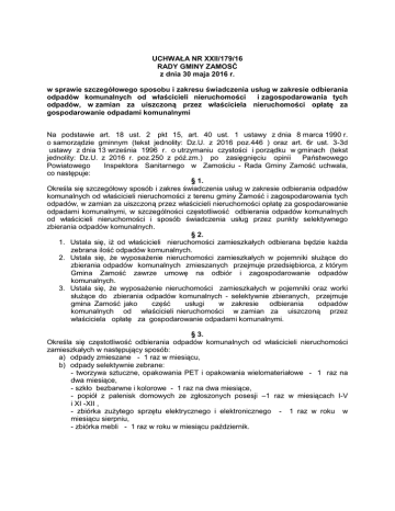 UCHWAŁA NR XXII/179/16 RADY GMINY ZAMOSĆ z dnia 30 maja 2016 r. w sprawie szczegółowego sposobu i zakresu świadczenia usług w zakresie odbierania odpadów komunalnych od właścicieli nieruchomości i zagospodarowania tych odpadów, w zamian za uiszczoną przez właściciela nieruchomości opłatę za gospodarowanie odpadami komunalnymi Na podstawie art. 18 ust. 2 pkt 15, art. 40 ust. 1 ustawy z dnia 8 marca 1990 r. o samorządzie gminnym (tekst jednolity: Dz.U. z 2016 poz.446 ) oraz art. 6r ust. 3-3d ustawy z dnia 13 września 1996 r. o utrzymaniu czystości i porządku w gminach (tekst jednolity: Dz.U. z 2016 r. poz.250 z póź.zm.) po zasięgnięciu opinii Państwowego Powiatowego Inspektora Sanitarnego w Zamościu - Rada Gminy Zamość uchwala, co następuje: § 1. Określa się szczegółowy sposób i zakres świadczenia usług w zakresie odbierania odpadów komunalnych od właścicieli nieruchomości z terenu gminy Zamość i zagospodarowania tych odpadów, w zamian za uiszczoną przez właścicieli nieruchomości opłatę za gospodarowanie odpadami komunalnymi, w szczególności częstotliwość odbierania odpadów komunalnych od właścicieli nieruchomości i sposób świadczenia usług przez punkty selektywnego zbierania odpadów komunalnych. § 2. 1. Ustala się, iż od właścicieli nieruchomości zamieszkałych odbierana będzie każda zebrana ilość odpadów komunalnych. 2. Ustala się, że wyposażenie nieruchomości zamieszkałych w pojemniki służące do zbierania odpadów komunalnych zmieszanych przejmuje przedsiębiorca, z którym Gmina Zamość zawrze umowę na odbiór i zagospodarowanie odpadów komunalnych. 3. Ustala się, że wyposażenie nieruchomości zamieszkałych w pojemniki oraz worki służące do zbierania odpadów komunalnych - selektywnie zbieranych, przejmuje gmina Zamość jako część usługi w zakresie odbierania odpadów komunalnych od właścicieli nieruchomości w zamian za uiszczoną przez właściciela opłatę za gospodarowanie odpadami komunalnymi. § 3. Określa się częstotliwość odbierania odpadów komunalnych od właścicieli nieruchomości zamieszkałych w następujący sposób: a) odpady zmieszane - 1 raz w miesiącu, b) odpady selektywnie zebrane: - tworzywa sztuczne, opakowania PET i opakowania wielomateriałowe - 1 raz na dwa miesiące, - szkło bezbarwne i kolorowe - 1 raz na dwa miesiące, - popiół z palenisk domowych ze zgłoszonych posesji –1 raz w miesiącach I-V i XI -XII , - zbiórka zużytego sprzętu elektrycznego i elektronicznego - 1 raz w roku w miesiącu sierpniu, - zbiórka mebli - 1 raz w roku w miesiącu październik. § 4. 1. Punkty selektywnego zbierania odpadów komunalnych utworzone i prowadzone będą przez przedsiębiorcę, z którym Gmina Zamość zawrze umowę na odbiór i zagospodarowanie odpadów komunalnych. 2. Do punktów selektywnego zbierania odpadów komunalnych właściciele nieruchomości zamieszkałych dostarczają nieodpłatnie następujące frakcje odpadów komunalnych zebranych selektywnie: 1) papieru i tektury, 2) metalu 3) tworzyw sztucznych i opakowań wielomateriałowych, 4) szkła bezbarwnego i kolorowego, 5) przeterminowanych leków i chemikaliów, 6) mebli i innych odpadów wielkogabarytowych, 7) zużytych baterii i akumulatorów, 8) zużytego sprzętu elektrycznego i elektronicznego, 9) zużytych opon, 10) odpadów budowlanych i rozbiórkowych stanowiących odpady komunalne, 11) odpadów zielonych, 12) odzieży i tekstyliów, 13) popiołu z palenisk domowych. 3. Punkty selektywnego zbierania odpadów komunalnych będą świadczyły usługi w zakresie odbierania odpadów komunalnych zbieranych w sposób selektywny: - od poniedziałku do piątku w godzinach od 09:00 do 17:00, - w soboty w od 9:00 do 14:00; w okresie od 1 maja do 30 września w godzinach od 9:00 do 17:00. § 5. Określa się tryb i sposób zgłaszania przez właścicieli nieruchomości przypadków niewłaściwego świadczenia usług przez przedsiębiorcę odbierającego odpady komunalne od właścicieli nieruchomości lub przez prowadzącego punkt selektywnego zbierania odpadów komunalnych: 1) uwagi i zastrzeżenia co do odbierania odpadów komunalnych mogą być zgłaszane przez właścicieli nieruchomości w czasie pracy Urzędu Gminy Zamość przy ul. Peowiaków nr 92, pok. 6 lub drogą elektroniczną na adres: [email protected], 2) przyjmowane i rozpatrywane będą jedynie uwagi i zastrzeżenia na piśmie, ustnie do protokołu lub elektronicznie - zawierające imię i nazwisko oraz adres osoby je wnoszącej. § 6. Tracą moc uchwały: 1. Uchwała Nr XXIX/297/2013 Rady Gminy Zamość z dnia 07 marca 2013 roku w sprawie szczegółowego sposobu i zakresu świadczenia usług w zakresie odbierania odpadów komunalnych od właścicieli nieruchomości i zagospodarowania tych odpadów w zamian za uiszczoną opłatę (Dz. Urz. Woj. Lub. z 2013 poz.1678). 2. Uchwała nr XLII/411/14 z dnia 26 lutego 2014 roku zmieniająca uchwałę w sprawie szczegółowego sposobu i zakresu świadczenia usług w zakresie odbierania odpadów komunalnych od właścicieli nieruchomości i zagospodarowania tych odpadów w zamian za uiszczoną opłatę ( Dz. Urz. Woj. Lub z 2014 poz.1290). 2. Uchwała nr XLVIIII/456/14 z dnia 29 sierpnia 2014 roku zmieniająca uchwałę w sprawie szczegółowego sposobu i zakresu świadczenia usług w zakresie odbierania odpadów komunalnych od właścicieli nieruchomości i zagospodarowania tych odpadów w zamian za uiszczoną opłatę ( Dz. Urz. Woj. Lub z 2014 poz.3038). § 7. Wykonanie uchwały powierza się Wójtowi Gminy Zamość. § 8. Uchwała wchodzi w życie po upływie 14 dni od dnia ogłoszenia w Dzienniku Urzędowym Województwa Lubelskiego. Przewodniczący Rady Gminy Zamość Józef Siemczyk