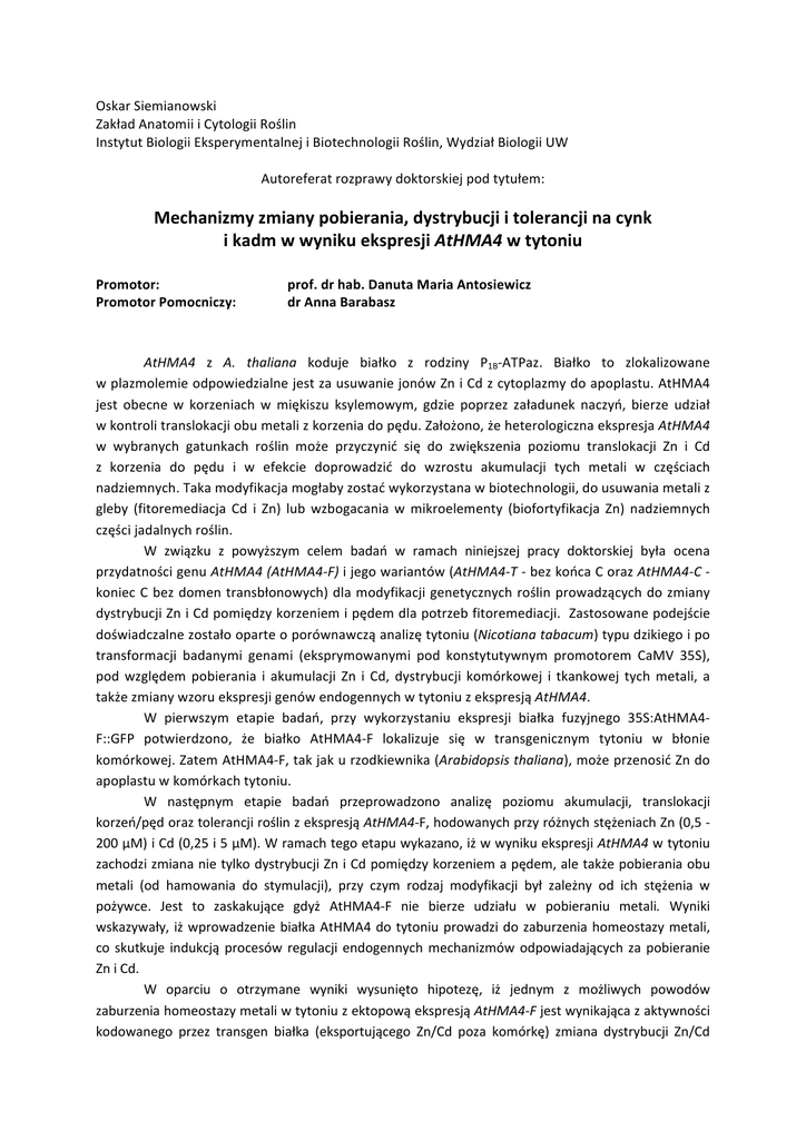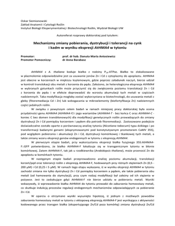 Oskar Siemianowski Zakład Anatomii i Cytologii Roślin Instytut Biologii Eksperymentalnej i Biotechnologii Roślin, Wydział Biologii UW Autoreferat rozprawy doktorskiej pod tytułem: Mechanizmy zmiany pobierania, dystrybucji i tolerancji na cynk i kadm w wyniku ekspresji AtHMA4 w tytoniu Promotor: prof. dr hab. Danuta Maria Antosiewicz Promotor Pomocniczy: dr Anna Barabasz AtHMA4 z A. thaliana koduje białko z rodziny P1B-‐ATPaz. Białko to zlokalizowane w plazmolemie odpowiedzialne jest za usuwanie jonów Zn i Cd z cytoplazmy do apoplastu. AtHMA4 jest obecne w korzeniach w miękiszu ksylemowym, gdzie poprzez załadunek naczyń, bierze udział w kontroli translokacji obu metali z korzenia do pędu. Założono, że heterologiczna ekspresja AtHMA4 w wybranych gatunkach roślin może przyczynić się do zwiększenia poziomu translokacji Zn i Cd z korzenia do pędu i w efekcie doprowadzić do wzrostu akumulacji tych metali w częściach nadziemnych. Taka modyfikacja mogłaby zostać wykorzystana w biotechnologii, do usuwania metali z gleby (fitoremediacja Cd i Zn) lub wzbogacania w mikroelementy (biofortyfikacja Zn) nadziemnych części jadalnych roślin. W związku z powyższym celem badań w ramach niniejszej pracy doktorskiej była ocena przydatności genu AtHMA4 (AtHMA4-‐F) i jego wariantów (AtHMA4-‐T -‐ bez końca C oraz AtHMA4-‐C -‐ koniec C bez domen transbłonowych) dla modyfikacji genetycznych roślin prowadzących do zmiany dystrybucji Zn i Cd pomiędzy korzeniem i pędem dla potrzeb fitoremediacji. Zastosowane podejście doświadczalne zostało oparte o porównawczą analizę tytoniu (Nicotiana tabacum) typu dzikiego i po transformacji badanymi genami (eksprymowanymi pod konstytutywnym promotorem CaMV 35S), pod względem pobierania i akumulacji Zn i Cd, dystrybucji komórkowej i tkankowej tych metali, a także zmiany wzoru ekspresji genów endogennych w tytoniu z ekspresją AtHMA4. W pierwszym etapie badań, przy wykorzystaniu ekspresji białka fuzyjnego 35S:AtHMA4-‐ F::GFP potwierdzono, że białko AtHMA4-‐F lokalizuje się w transgenicznym tytoniu w błonie komórkowej. Zatem AtHMA4-‐F, tak jak u rzodkiewnika (Arabidopsis thaliana), może przenosić Zn do apoplastu w komórkach tytoniu. W następnym etapie badań przeprowadzono analizę poziomu akumulacji, translokacji korzeń/pęd oraz tolerancji roślin z ekspresją AtHMA4-‐F, hodowanych przy różnych stężeniach Zn (0,5 -‐ 200 μM) i Cd (0,25 i 5 μM). W ramach tego etapu wykazano, iż w wyniku ekspresji AtHMA4 w tytoniu zachodzi zmiana nie tylko dystrybucji Zn i Cd pomiędzy korzeniem a pędem, ale także pobierania obu metali (od hamowania do stymulacji), przy czym rodzaj modyfikacji był zależny od ich stężenia w pożywce. Jest to zaskakujące gdyż AtHMA4-‐F nie bierze udziału w pobieraniu metali. Wyniki wskazywały, iż wprowadzenie białka AtHMA4 do tytoniu prowadzi do zaburzenia homeostazy metali, co skutkuje indukcją procesów regulacji endogennych mechanizmów odpowiadających za pobieranie Zn i Cd. W oparciu o otrzymane wyniki wysunięto hipotezę, iż jednym z możliwych powodów zaburzenia homeostazy metali w tytoniu z ektopową ekspresją AtHMA4-‐F jest wynikająca z aktywności kodowanego przez transgen białka (eksportującego Zn/Cd poza komórkę) zmiana dystrybucji Zn/Cd pomiędzy symplastem a apoplastem w komórkach wszystkich tkanek badanych roślin. W celu weryfikacji postawionej hipotezy określono dystrybucję Zn w komórkach i tkankach: a) poprzez analizę stężenia Zn w symplaście (w izolowanych protoplastach) i w apoplaście (metodą infiltracji i wirowania); b) poprzez analizę stężenia Zn w symplaście (w protoplastach) z zastosowaniem indykacyjnego dla Zn barwnika fluorescencyjnego -‐ Zinpyr-‐1; c) poprzez analizę lokalizacji Zn w tkankach na przekrojach poprzecznych korzeni i liści. Wyniki przeprowadzonych badań pokazały, iż rzeczywiście u transformantów stężenie Zn/Cd w apoplaście jest wyższe, zaś w symplaście niższe w stosunku do typu dzikiego, zmieniona jest także lokalizacja Zn na poziomie tkankowym. W dalszych badaniach wykazano, że obserwowane zmiany w dystrybucji/lokalizacji Zn na poziomie komórkowym/tkankowym przyczyniają się do powstania na liściach transformantów objawów toksyczności Zn – nekroz, co wskazuje, że w wyniku ekspresji AtHMA4 następuje obniżenie poziomu tolerancji na ten metal. Otrzymane wyniki skłaniają jednak do zmiany paradygmatu myślenia o nekrozach, wskazując, że za ich powstawaniem kryje się specyficzny mechanizm tolerancji, który polega na ochronie przed nadmiarem Zn całej blaszki liściowej. Mechanizm ten polega na załadunku wysokich ilości metalu jedynie do grup komórek, które pod wpływem toksyczności dużych stężeń Zn, zamierając tworzą nekrozy, jednocześnie chroniąc pozostałe komórki w blaszce liściowej. Podwyższony poziom Zn w apoplaście wydaje się być związany z inicjacją tego procesu. Analizując pobieranie metali w roślinach tytoniu hodowanych w obecności Cd wykazano, iż ekspresja AtHMA4 prowadzi do zahamowania pobierania Cd. W związku z tym, celem kolejnego etapu pracy była identyfikacja mechanizmów odpowiedzialnych za obniżenie akumulacji Cd w transformantach. W oparciu o analizę z użyciem mikromacierzy DNA udało się ustalić, iż ekspresja transgenu ingeruje w metabolizm roślin transformowanych zmieniając wzór ekspresji genów odpowiedzialnych za regulację homoeostazy metali (NtIRT1, NtNAS1, HMA3, MTP1a), brak jednak było obniżenia poziomu transkrytpu potencjalnych transporterów Cd. Wzrosła natomiast ekspresja genów istotnych w szlaku biosyntezy lignin. Na tej podstawie oraz wykorzystując badania histologiczne ustalono, że za obniżenie pobierania/akumulacji Cd w tytoniu z ekspresją AtHMA4 odpowiada wzrost lignifikacji ściany komórkowej pomiędzy epidermą a korą pierwotną korzenia. Dodatkową przesłanką wskazującą, że u rośl