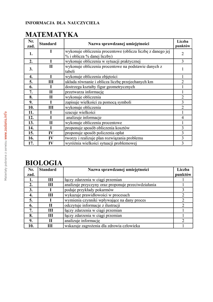 INFORMACJA DLA NAUCZYCIELA MATEMATYKA Nr. zad. 1. 2. 3. 4. 5. 6. 7. 8. 9. 10. 11. 12. 13. 14. 15. 16. 17. Standard I I II I III I II II I III I I II I IV IV IV Nazwa sprawdzanej umiejętności wykonuje obliczenia procentowe (oblicza liczbę z danego jej % i oblicza % danej liczby) wykonuje obliczenia w sytuacji praktycznej wykonuje obliczenia procentowe na podstawie danych z tabeli wykonuje obliczenia objętości układa równanie i oblicza liczbę przejechanych km dostrzega kształty figur geometrycznych przetwarza informację wykonuje obliczenia zapisuje wielkości za pomocą symboli wykonuje obliczenia szacuje wielkości analizuje informacje wykonuje obliczenia procentowe proponuje sposób obliczenia kosztów proponuje sposób policzenia opłat tworzy i realizuje plan rozwiązania problemu wyróżnia wielkości sytuacji problemowej Liczba punktów 2 3 1 1 2 1 1 2 3 2 1 4 1 3 3 3 3 BIOLOGIA Nr. zad. 1. 2. 3. 4. 5. 6. 7. 8. 9. 10. Standard III III I III I II III III II III Nazwa sprawdzanej umiejętności łączy zdarzenia w ciągi przemian analizuje przyczyny oraz proponuje przeciwdziałania podaje przykłady pokarmów wykazuje prawidłowości w procesach wymienia czynniki wpływające na dany proces odczytuje informacje z ilustracji łączy zdarzenia w ciągi przemian łączy zdarzenia w ciągi przemian analizuje informację wskazuje zagrożenia dla zdrowia człowieka Liczba punktów 1 1 3 2 2 2 1 1 2 1 CHEMIA Nr. zad. 1. 2. 3. 4. 5. 6. 7. 8. 9. 10. Standard II III I II I I II I II II Nazwa sprawdzanej umiejętności wybiera opisany związek stosuje zasady przy zapisywaniu wzorów związków chemicznych określa wartościowość przetwarza informację sprawnie wykonuje podstawowe obliczenia wyodrębnia z równania utleniacz i reduktor z użyciem informacji wykonuje przeliczenia chemiczne określa cechy związku wybiera istotne wielkości rozpoznaje cechy substancji Liczba punktów 1 2 1 2 3 1 2 1 1 2 GEOGRAFIA Nr. zad. 1. 2. 3. 4. 5. 6. 7. 8. 9. 10. 11. Standard I II II I II I III II I I III Nazwa sprawdzanej umiejętności wykonuje obliczenia analizuje informację interpretuję informacje wybiera opis zjawiska odczytuje informacje określa wielkości wskazuje skutki odczytuje informacje stosuje terminy do opisu zjawisk podaje cechy klimatu i procesu wykazuje zależności między środowiskiem a działaniem człowieka Liczba punktów 1 1 1 1 1 1 1 1 1 2 4 FIZYKA Nr. zad. 1. 2. 3. 4. 5. 6. 7. 8. 9. 10. 11. 12. Standard III III II I II III III III II IV I III Nazwa sprawdzanej umiejętności wskazuje ośrodki o określonych właściwościach określa warunki występowania ruchu odczytuje informacje z wykresu oznacza bieguny magnetyczne Ziemi wykorzystuje odczytane z wykresu dane do obliczeń oblicza wartość średniej szybkości oblicza wielkości charakterystyczne dla obwodu elektrycznego oblicza prędkość wykorzystuje dane z tekstu do określania relacji miedzy wielkościami wykonuje procedury osiągania celu wykonuje obliczenia łączy zdarzenia w ciągi przemian Liczba punktów 1 1 1 1 3 3 3 1 1 1 2 2