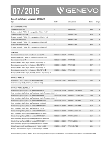 07/2015 Cennik detaliczny urządzeń GENEVO Opis EAN Urządzenie Cena Grupa - PRiMA6SET 699 A - PRiMA12SET 459 A - PRiMA16SET 799 A - PRiMA64SET 849 A 5903240615117 PRiMA 6 488 A 5903240615124 PRiMA 12 239 A 5903240615100 PRiMA 16 557 A 5903240615131 PRiMA 64 599 A 5903240615261 PRiMA 6 LCD 263 A 5903240615209 PRiMA LCD WH-WH 299 A PRiMA64 LCD WH-WH 299 A 5903240615216 PRiMA LCD WH-BL 319 A 5903240615223 PRiMA LCD WH-BK 319 A 5903240615230 PRiMA LCD GY-WH 319 A 5903240615247 PRiMA LCD GY-BL 319 A 5903240615254 PRiMA LCD GY-BK 319 A 5903240615407 PRiMA EXT-Z8 133 A ZESTAWY ALARMOWE Zestaw PRiMA 6 LCD Zestaw: centrala PRiMA 6, manipulator PRiMA 6 LCD Zestaw PRiMA 12 LCD Zestaw: centrala PRiMA 12, manipulator PRiMA 6 LCD Zestaw PRiMA 16 LCD Zestaw: centrala PRiMA 16, manipulator PRiMA LCD Zestaw PRiMA 64 LCD Zestaw: centrala PRiMA 64, manipulator PRiMA LCD CENTRALE Centrala alarmowa z komunikatorem GSM/GPRS 6 wejść (maks. 6), 4 wyjścia, zasilacz impulsowy 1.5A Centrala alarmowa 8 wejść (maks. 16), 6 wyjść, zasilacz impulsowy 2A Centrala alarmowa z komunikatorem GSM/GPRS 8 wejść (maks. 16), 6 wyjść, zasilacz impulsowy 2A Centrala alarmowa z komunikatorem GSM/GPRS 8 wejść (maks. 64), 6 wyjść, 4 strefy, zasilacz impulsowy 2A MODUŁY PRiMA 6 Manipulator graficzny LCD do centrali PRiMA 6 kolor obudowy: biały, kolor wyświetlacza: biały MODUŁY PRiMA 16/PRiMA 64* Manipulator graficzny LCD do centrali PRiMA 16 kolor obudowy: biały, kolor wyświetlacza: biały, firmware PRiMA 16 Manipulator graficzny LCD do centrali PRiMA 64 5903240615278 kolor obudowy: biały, kolor wyświetlacza: biały, firmware PRiMA 64 Manipulator graficzny LCD do centrali PRiMA 16/64 kolor obudowy: biały, kolor wyświetlacza: niebieski Manipulator graficzny LCD do centrali PRiMA 16/64 kolor obudowy: biały, kolor wyświetlacza: czarny Manipulator graficzny LCD do centrali PRiMA 16/64 kolor obudowy: grafitowy, kolor wyświetlacza: biały Manipulator graficzny LCD do centrali PRiMA 16/64 kolor obudowy: grafitowy, kolor wyświetlacza: niebieski Manipulator graficzny LCD do centrali PRiMA 16/64 kolor obudowy: grafitowy, kolor wyświetlacza: czarny Moduł rozszerzenia wejść do centrali PRiMA 16/64 8 wejść, nadzorowane wyjście zasilania czujek 150mA Wszystkie manipulatory PRiMA16/64 posiadają możliwość wymiany firmware i dostosowania do central PRiMA16/PRiMA64. KOMUNIKATORY Komunikator GSM z funkcjami zdalnego sterowania µ 5903240615605 GSM-8 329 A 5903240615827 ANT-GSM-MAG 36 A 5903240615803 ANT-GSM-1 36 A 5903240615810 CUSB-PIN3 79 A 5906881440926 BOX-1 109 B 8 wejść, 8 wyjść, zdalne sterowanie, aplikacja Android AKCESORIA Antena GSM magnetyczna Antena GSM900/1800 magnetyczna z kablem 2.5m, SMA-F Antena GSM Antena dwuzakresowa GSM900/1800 typu Dipol, SMA-F Kabel USB do programowania Kabel USB - RSTTL PIN3 z układem FTDI Obudowa metalowa AWO-205 (Pulsar) Transformator 16-18V/40VA, miejsce na akumulator 17Ah Cennik GENEVO ważny od dnia 30.07.2015, obowiązujący do dnia wejścia w życie kolejnej edycji. GENEVO sp. z o.o. zastrzega sobie prawo do zmian cen bez powiadomienia, oraz do ewentualnych błędów i pomyłek w cenniku. Wszystkie ceny netto w PLN, nie zawierają podatku VAT.