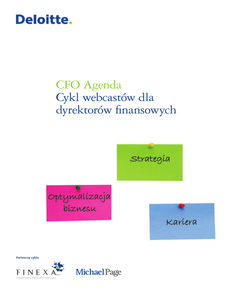 CFO Agenda Cykl webcastów dla dyrektorów finansowych Partnerzy cyklu O webcastach Obecnie zadania wykonywane przez dyrektora finansowego są dużo bardziej rozbudowane i nie polegają tylko na wspieraniu innych działów w organizacji. Z roku na rok rola dyrektora finansowego się zmienia, a finanse przenikają do każdego z obszarów działalności firmy. Dyrektor finansowy dziś to przede wszystkim kluczowy decydent – przywódca, który wprowadza wysokie standardy zarządzania w firmie. Interesariusze oczekują, że będzie on zarówno partnerem strategicznym, jak i będzie brał czynny udział w optymalizowaniu procesów biznesowych. Nowoczesny dyrektor finansowy musi realizować wieloaspektowe, złożone zadania. W żargonie nazywa się je niekiedy “czterema twarzami” dyrektora finansowego. Oczywiście wymagania związane z realizacją poszczególnych ról znacznie się różnią. Trudne zadanie dyrektora finansowego polega na łączeniu w jedną całość wszystkich tych zróżnicowanych ról, działań ludzkich i procesów w ramach jednego, sprawnie działającego pionu finansowego. Aby przybliżyć Państwu aktualne problemy związane z budowaniem strategii organizacji, z procesami optymalizacji biznesu oraz z rozwojem ścieżki kariery nowoczesnego dyrektora finansowego, eksperci Deloitte przygotowali cykl bezpłatnych seminariów on-line, które poruszają ważne dla CFO zagadnienia z punktu widzenia zarządzania firmą i osiągania przewagi konkurencyjnej. Każdy z webcastów będzie komentowany przez praktyka biznesu, dyrektora finansowego ze Stowarzyszenia Dyrektorów Finansowych Finexa. Czym jest webcast? Webcast jest to “wirtualne” spotkanie z ekspertami Deloitte, które odbywa się na żywo całkowicie za pośrednictwem Internetu. Podczas spotkania mogą Państwo wysłuchać prezentacji, a także brać w nim aktywny udział, zadając pytania. Wszystkie webcasty odbywają się na żywo i są nieodpłatne. Każdy webcast to: • wiedza – aktualne tematy biznesowe, omawiane przez najlepszych specjalistów; • interaktywność – dzięki błyskawicznym sondażom porównają się Państwo z innymi uczestnikami webcastów i poznają omawiane zagadnienia z perspektywy innych firm. Będą Państwo także mogli zadać pytanie prowadzącym webcast; • wygoda – webcasty odbywają się całkowicie przez Internet, dlatego mogą w nich Państwo uczestniczyć łącząc się z dowolnego miejsca z dostępem do sieci; • elastyczność – każdy webcast jest dostępny w archiwum przez 90 dni od emisji. Mogą Państwo do niego powrócić w dogodnym momencie. Jak wziąć udział w webcaście? Prosimy: 1. Wejść na stronę www.deloitte.com/pl/webcastyCFO 2. Wybrać interesujący Państwa webcast 3. Kliknąć na przycisk „Zarejestruj się” 4. Uzupełnić formularz zgłoszeniowy i kliknąć na przycisk „Rejestracja” Jeżeli webcast, w którym chcą Państwo wziąć udział, jeszcze się nie odbył, otrzymacie e-mail z przypomnieniem. Dzięki niemu weźmiecie Państwo udział w emisji webcastu w czasie rzeczywistym oraz uzyskacie dostęp do archiwalnych wydań webcastów. Program webcastów Harmonogram Data Godzina Temat 10 kwietnia 2013 10:00-11:00 Jak zmiany w CIT i VAT na 2013 mają wpływ na cashflow w firmach? 18 kwietnia 2013 10:00-11:00 Wydzielenie części biznesu (Divestment) – aspekty finansowe, prawne i podatkowe 7 maja 2013 10:00-11:00 Rachunkowe ujęcie optymalizacji podatkowych i finansowych 21 maja 2013 10:00-11:00 Od CFO do CEO 4 czerwca 2013 10:00-11:00 Optymalizacja procesu zamknięcia ksiąg rachunkowych 18 czerwca 2013 10:00-11:00 Prognozy CFO dla polskiej gospodarki Prezentacja wyników międzynarodowego badania CFO dużych firm w Polsce i Europie Środkowej Więcej informacji oraz rejestracja na: www.deloitte.com/pl/webcastyCFO Jak zmiany w CIT i VAT na 2013 mają wpływ na cashflow w firmach? 10 kwietnia 2013, godz. 10.00-11.00 Wydzielenie części biznesu (Divestment) – aspekty finansowe, prawne i podatkowe 18 kwietnia 2013, godz. 10.00-11.00 Prowadzący: Przemyslaw Skorupa Straszy Menedżer w Dziale Doradztwa Podatkowego Deloitte Prowadzący: Katarzyna Sermanowicz-Giza Dyrektor w Dziale Doradztwa Finansowego Anna Rączkowska Menedżer w Dziale Doradztwa Podatkowego Deloitte Robert Nowak Dyrektor w Dziale Doradztwa Podatkowego Deloitte Podczas webcastu omówione zostaną następujące kwestie: • Jakie nowe zasady rozliczeń kosztów zostały wprowadzone w życie od 1 stycznia 2013 r.? • Jak postępować w przypadku kosztów pośrednich nieuregulowanym w terminach wskazanych w ustawie o CIT – z uwzględnieniem przypadków kosztów rozliczanych jednorazowo oraz kosztów rozliczanych w czasie? • Jak postępować w przypadku kosztów bezpośrednich nieuregulowanym w terminach wskazanych w ustawie o CIT – jakie znaczenie w ww. zakresie mają zasady rachunkowości przyjęte przez podmiot w zakresie ustalania technicznego kosztu wytworzenia, kosztu własnego sprzedaży? • Jak postępować w przypadku nabycia środków trwałych – w przypadkach nabycia na kredyt lub z odroczonym terminem płatności? • Jakie mechanizmy kontrole należy stosować, aby mieć pewność, że stosujemy się do obowiązujących zasad? • Warunki stosowania ulgi na złe długi w VAT od 1 stycznia 2013 r. • Korekta podatku naliczonego w przypadku nieuregulowanych faktur. Joanna Dudek Partner Associate w Kancelarii Deloitte Legal Ewa Grzejszczyk Dyrektor w Dziale Doradztwa Podatkowego Podczas webcastu zostaną omówione następujące kwestie: • Plan wydzielenia; • Aspekty finansowe wydzielenia części biznesu – spojrzenie z punktu widzenia nabywcy: - podział bilansu: podział i klucze alokacji, - podział pro-forma rachunku zysku i strat, - funkcje wspólne dla spółki matki i wydzielanej części przedsiębiorstwa – jak można poradzić sobie z tym problemem. • Pułapki prawne i podatkowe: - optymalizacja struktury podatkowej, - prawna stru