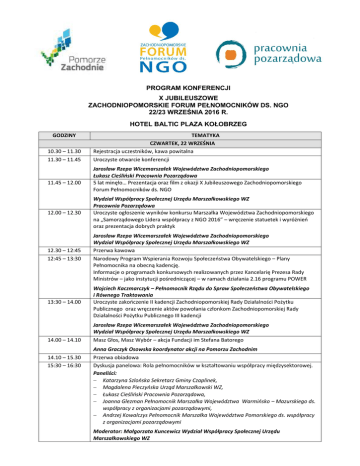 PROGRAM KONFERENCJI X JUBILEUSZOWE ZACHODNIOPOMORSKIE FORUM PEŁNOMOCNIKÓW DS. NGO 22/23 WRZEŚNIA 2016 R. HOTEL BALTIC PLAZA KOŁOBRZEG GODZINY 10.30 – 11.30 11.30 – 11.45 11.45 – 12.00 TEMATYKA CZWARTEK, 22 WRZEŚNIA Rejestracja uczestników, kawa powitalna Uroczyste otwarcie konferencji Jarosław Rzepa Wicemarszałek Województwa Zachodniopomorskiego Łukasz Cieśliński Pracownia Pozarządowa 5 lat minęło… Prezentacja oraz film z okazji X Jubileuszowego Zachodniopomorskiego Forum Pełnomocników ds. NGO 12.00 – 12.30 Wydział Współpracy Społecznej Urzędu Marszałkowskiego WZ Pracownia Pozarządowa Uroczyste ogłoszenie wyników konkursu Marszałka Województwa Zachodniopomorskiego na „Samorządowego Lidera współpracy z NGO 2016” – wręczenie statuetek i wyróżnień oraz prezentacja dobrych praktyk 12.30 – 12:45 12:45 – 13:30 Jarosław Rzepa Wicemarszałek Województwa Zachodniopomorskiego Wydział Współpracy Społecznej Urzędu Marszałkowskiego WZ Przerwa kawowa Narodowy Program Wspierania Rozwoju Społeczeństwa Obywatelskiego – Plany Pełnomocnika na obecną kadencję. Informacje o programach konkursowych realizowanych przez Kancelarię Prezesa Rady Ministrów – jako instytucji pośredniczącej – w ramach działania 2.16 programu POWER 13:30 – 14.00 Wojciech Kaczmarczyk – Pełnomocnik Rządu do Spraw Społeczeństwa Obywatelskiego i Równego Traktowania Uroczyste zakończenie II kadencji Zachodniopomorskiej Rady Działalności Pożytku Publicznego oraz wręczenie aktów powołania członkom Zachodniopomorskiej Rady Działalności Pożytku Publicznego III kadencji 14.00 – 14.10 14.10 – 15.30 15:30 – 16:30 Jarosław Rzepa Wicemarszałek Województwa Zachodniopomorskiego Wydział Współpracy Społecznej Urzędu Marszałkowskiego WZ Masz Głos, Masz Wybór – akcja Fundacji im Stefana Batorego Anna Graczyk Osowska koordynator akcji na Pomorzu Zachodnim Przerwa obiadowa Dyskusja panelowa: Rola pełnomocników w kształtowaniu współpracy międzysektorowej. Paneliści: Katarzyna Szlońska Sekretarz Gminy Czaplinek, Magdalena Pieczyńska Urząd Marszałkowski WZ, Łukasz Cieśliński Pracownia Pozarządowa, Joanna Glezman Pełnomocnik Marszałka Województwa Warmińsko – Mazurskiego ds. współpracy z organizacjami pozarządowymi, Andrzej Kowalczys Pełnomocnik Marszałka Województwa Pomorskiego ds. współpracy z organizacjami pozarządowymi Moderator: Małgorzata Kuncewicz Wydział Współpracy Społecznej Urzędu Marszałkowskiego WZ 16.30 – 19.00 od 20:00 8.00 – 9.00 9.00 – 10.40 10.40 – 11.00 11.00 – 14.30 14.30 – 14:45 14:45 Sesja warsztatowa. Blok warsztatów z podziałem na 2 grupy Tematy: 1. Wolontariat – animacja na rzecz tworzenia klubów wolontariuszy w samorządach Anna Graczyk Osowska Regionalne Centrum Wolontariatu w Szczecinie 2. Nowe wzory ofert, umów i sprawozdań dotyczących realizacji zadań publicznych Artur Gluziński ekspert ds. współpracy z ngo Uczestnicy zostaną podzieleni na dwie grupy: A i B . Kolejność udziału w warsztatach: Grupa A: godz. 16.30 – 17.40 temat nr 1; godz. 17.50 – 19.00 temat nr 2 Grupa B: godz. 16.30 – 17.40 temat nr 2; godz. 17.50 – 19.00 temat nr 1 Uroczysta kolacja PIĄTEK, 23 WRZEŚNIA Śniadanie Nowe wzory ofert, umów i sprawozdań dotyczących realizacji zadań publicznych Artur Gluziński ekspert ds. współpracy z ngo Przerwa kawowa Sesja warsztatowa. Blok warsztatów z podziałem na 3 grupy: Tematy: 1. Inicjatywa lokalna – znaczenie, dobra praktyki, korzyści dla samorządu Łukasz Waszak Stowarzyszenie Centrum Promocji i Rozwoju Inicjatyw Obywatelskich OPUS 2. Finansowe mechanizmy współpracy z NGO na przykładzie regrantingu, funduszu wkładów własnych, funduszy pożyczkowych w samorządach Paweł Szczyrski Dyrektor Biura ds. Organizacji Pozarządowych Urzędu Miasta Szczecin 3. Roczny program współpracy – proces tworzenia, konsultacji. Jakie ma znaczenie dla budowania relacji samorządu z organizacjami pozarządowymi Łukasz Cieśliński Pracownia Pozarządowa Uczestnicy zostaną podzieleni na trzy grupy: A, B i C . Kolejność udziału w warsztatach: Grupa A: 11.00 – 12.00 temat nr 1; 12.15 – 13.15 temat nr 2; 13.30 – 14.30 temat nr 3 Grupa B: 11.00 – 12.00 temat nr 2; 12.15 – 13.15 temat nr 3; 13.30 – 14.30 temat nr 1 Grupa C: 11.00 – 12.00 temat nr 3; 12.15 – 13.15 temat nr 1; 13.30 – 14.30 temat nr 2 Sesja podsumowująca X Jubileuszowe Zachodniopomorskie Forum Pełnomocników ds. NGO Obiad Organizatorzy zastrzegają możliwość zmiany programu Forum