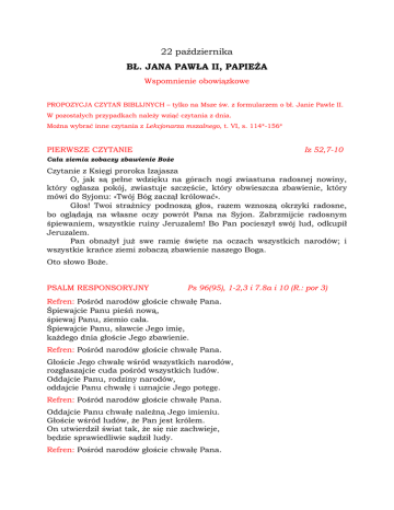 22 października BŁ. JANA PAWŁA II, PAPIEŻA Wspomnienie obowiązkowe PROPOZYCJA CZYTAŃ BIBLIJNYCH – tylko na Msze św. z formularzem o bł. Janie Pawle II. W pozostałych przypadkach należy wziąć czytania z dnia. Można wybrać inne czytania z Lekcjonarza mszalnego, t. VI, s. 114*-156* PIERWSZE CZYTANIE Iz 52,7-10 Cała ziemia zobaczy zbawienie Boże Czytanie z Księgi proroka Izajasza O, jak są pełne wdzięku na górach nogi zwiastuna radosnej nowiny, który ogłasza pokój, zwiastuje szczęście, który obwieszcza zbawienie, który mówi do Syjonu: «Twój Bóg zaczął królować». Głos! Twoi strażnicy podnoszą głos, razem wznoszą okrzyki radosne, bo oglądają na własne oczy powrót Pana na Syjon. Zabrzmijcie radosnym śpiewaniem, wszystkie ruiny Jeruzalem! Bo Pan pocieszył swój lud, odkupił Jeruzalem. Pan obnażył już swe ramię święte na oczach wszystkich narodów; i wszystkie krańce ziemi zobaczą zbawienie naszego Boga. Oto słowo Boże. PSALM RESPONSORYJNY Ps 96(95), 1-2,3 i 7.8a i 10 (R.: por 3) Refren: Pośród narodów głoście chwałę Pana. Śpiewajcie Panu pieśń nową, śpiewaj Panu, ziemio cała. Śpiewajcie Panu, sławcie Jego imię, każdego dnia głoście Jego zbawienie. Refren: Pośród narodów głoście chwałę Pana. Głoście Jego chwałę wśród wszystkich narodów, rozgłaszajcie cuda pośród wszystkich ludów. Oddajcie Panu, rodziny narodów, oddajcie Panu chwałę i uznajcie Jego potęgę. Refren: Pośród narodów głoście chwałę Pana. Oddajcie Panu chwałę należną Jego imieniu. Głoście wśród ludów, że Pan jest królem. On utwierdził świat tak, że się nie zachwieje, będzie sprawiedliwie sądził ludy. Refren: Pośród narodów głoście chwałę Pana. DRUGIE CZYTANIE Ef 4,1-7.11-13 Bóg ustanowił pasterzy i nauczycieli Czytanie z Listu świętego Pawła Apostoła do Efezjan Bracia: Zachęcam was ja, więzień w Panu, abyście postępowali w sposób godny powołania, jakim zostaliście wezwani, z całą pokorą i cichością, z cierpliwością, znosząc siebie nawzajem w miłości. Usiłujcie zachować jedność Ducha dzięki więzi, jaką jest pokój. Jedno jest Ciało i jeden Duch, bo też zostaliście wezwani do jednej nadziei, jaką daje wasze powołanie. Jeden jest Pan, jedna wiara, jeden chrzest. Jeden jest Bóg i Ojciec wszystkich, który jest i działa ponad wszystkimi, przez wszystkich i we wszystkich. Każdemu zaś z nas została dana łaska według miary daru Chrystusowego. I On ustanowił jednych apostołami, innych prorokami, innych ewangelistami, innych pasterzami i nauczycielami dla przysposobienia świętych do wykonywania posługi, celem budowania Ciała Chrystusowego, aż dojdziemy wszyscy razem do jedności wiary i pełnego poznania Syna Bożego, do człowieka doskonałego, do miary wielkości według Pełni Chrystusa. Oto słowo Boże. ŚPIEW PRZED EWANGELIĄ J 10,14 Aklamacja: Alleluja, alleluja, alleluja. Ja jestem dobrym pasterzem i znam owce moje, a moje Mnie znają Aklamacja: Alleluja, alleluja, alleluja. EWANGELIA J 21,15-17 Paś baranki moje, paś owce moje Słowa Ewangelii według świętego Jana Gdy Jezus ukazał się swoim uczniom i spożył z nimi śniadanie, rzekł do Szymona Piotra: «Szymonie, synu Jana, czy miłujesz Mnie więcej aniżeli ci?» Odpowiedział Mu: «Tak, Panie, Ty wiesz, że Cię kocham». Rzekł do niego: «Paś baranki moje». I znowu, po raz drugi, powiedział do niego: «Szymonie, synu Jana, czy miłujesz Mnie?» Odparł Mu: «Tak, Panie, Ty wiesz, że Cię kocham». Rzekł do niego: «Paś owce moje». Powiedział mu po raz trzeci: «Szymonie, synu Jana, czy kochasz Mnie?» Zasmucił się Piotr, że mu po raz trzeci powiedział: «Czy kochasz Mnie?» I rzekł do Niego: «Panie, Ty wszystko wiesz, Ty wiesz, że Cię kocham». Rzekł do niego Jezus: «Paś owce moje». Oto słowo Pańskie.