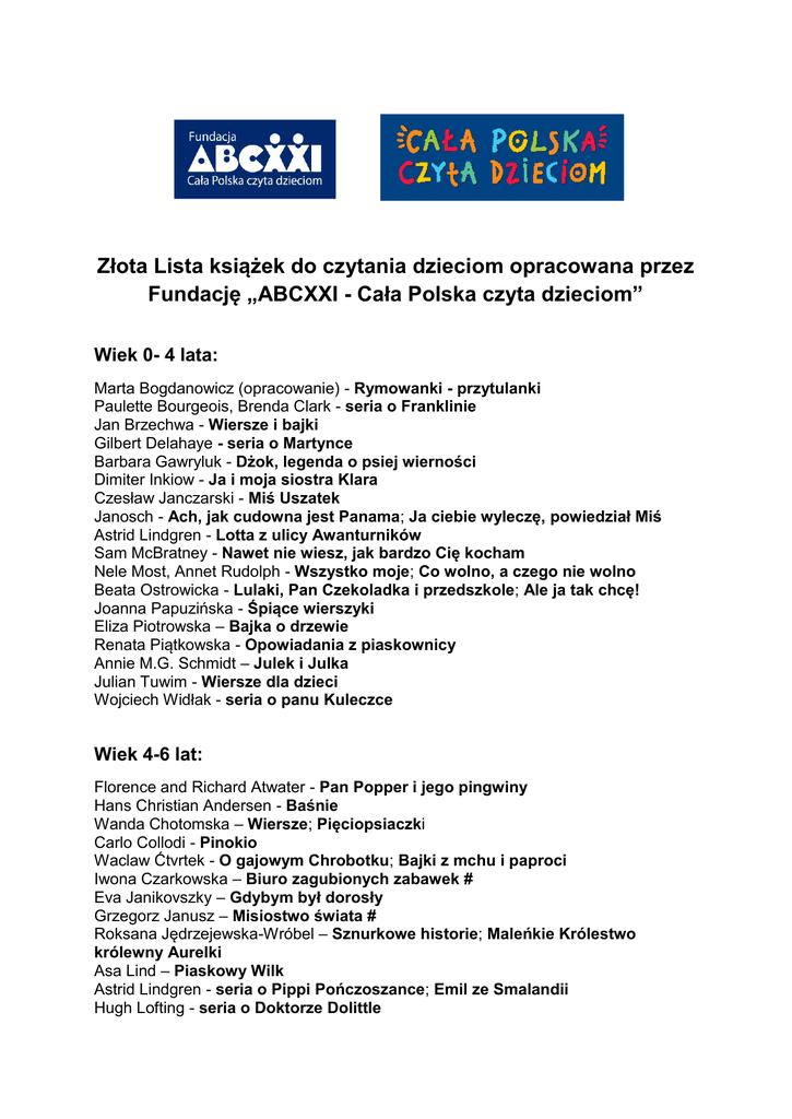 Złota Lista książek do czytania dzieciom opracowana przez Fundację „ABCXXI - Cała Polska czyta dzieciom” Wiek 0- 4 lata: Marta Bogdanowicz (opracowanie) - Rymowanki - przytulanki Paulette Bourgeois, Brenda Clark - seria o Franklinie Jan Brzechwa - Wiersze i bajki Gilbert Delahaye - seria o Martynce Barbara Gawryluk - Dżok, legenda o psiej wierności Dimiter Inkiow - Ja i moja siostra Klara Czesław Janczarski - Miś Uszatek Janosch - Ach, jak cudowna jest Panama; Ja ciebie wyleczę, powiedział Miś Astrid Lindgren - Lotta z ulicy Awanturników Sam McBratney - Nawet nie wiesz, jak bardzo Cię kocham Nele Most, Annet Rudolph - Wszystko moje; Co wolno, a czego nie wolno Beata Ostrowicka - Lulaki, Pan Czekoladka i przedszkole; Ale ja tak chcę! Joanna Papuzińska - Śpiące wierszyki Eliza Piotrowska – Bajka o drzewie Renata Piątkowska - Opowiadania z piaskownicy Annie M.G. Schmidt – Julek i Julka Julian Tuwim - Wiersze dla dzieci Wojciech Widłak - seria o panu Kuleczce Wiek 4-6 lat: Florence and Richard Atwater - Pan Popper i jego pingwiny Hans Christian Andersen - Baśnie Wanda Chotomska – Wiersze; Pięciopsiaczki Carlo Collodi - Pinokio Waclaw Ćtvrtek - O gajowym Chrobotku; Bajki z mchu i paproci Iwona Czarkowska – Biuro zagubionych zabawek # Eva Janikovszky – Gdybym był dorosły Grzegorz Janusz – Misiostwo świata # Roksana Jędrzejewska-Wróbel – Sznurkowe historie; Maleńkie Królestwo królewny Aurelki Asa Lind – Piaskowy Wilk Astrid Lindgren - seria o Pippi Pończoszance; Emil ze Smalandii Hugh Lofting - seria o Doktorze Dolittle Kornel Makuszyński - Przygody Koziołka Matołka Małgorzata Musierowicz - Znajomi z zerówki Alan A. Milne - Kubuś Puchatek; Chatka Puchatka Renata Piątkowska - Na wszystko jest sposób #; Nie ma nudnych dni Małgorzata Strzałkowska - Leśne Głupki; Wierszyki łamiące języki Danuta Wawiłow – Wiersze Max Velthuijs - Żabka i obcy Wiek 6- 8 lat: Heather Amery - Mity greckie dla najmłodszych Marcin Brykczyński - Ni pies, ni wydra Jan Brzechwa - Pchła Szachrajka; Szelmostwa Lisa Witalisa Kamil Giżycki - Wielkie czyny szympansa Bajbuna Mądrego Frances Hodgson Burnett - Mała księżniczka Tove Jansson - seria o Muminkach Ludwik Jerzy Kern - Wiersze dla dzieci; Ferdynand Wspaniały Erich Kästner - 35 maja Astrid Lingren - Dzieci z Bullerbyn; Mio, mój Mio W. Markowska, A. Milska - Baśnie z dalekich wysp i lądów Anna Onichimowska - Najwyższa góra świata Joanna Papuzińska - Asiunia Grey Owl - Przygody Sajo i małych bobrów Małgorzata Strzałkowska - Rady nie od parady; Wiersze, że aż strach Anne Cath. Westly - 8+2 i ciężarówka Roksana Jędrzejewska-Wróbel – Kosmita Śpiewająca Lipka. Baśnie Słowian Zachodnich (pr. zb.) Wiek 8-10 lat: Edmund de Amicis – Serce (w nowej wersji językowej z kolekcji „Cała Polska czyta dzieciom”) Paweł Beręsewicz – Czy wojna jest dla dziewczyn?; Jak zakochałem Kaśkę Kwiatek Frances Hodgson Burnett - Tajemniczy ogród J. Canfield, M. i P. Hansen, I. Dunlap - Balsam dla duszy dziecka Andrew Clements - Fryndel Iwona Chmielewska – Pamiętnik Blumki Roald Dahl - Matylda Andrzej Grabowski – Zenek i mrówki Anna Kamieńska - Książka nad książkami Rudyard Kipling - Księga dżungli Eric Knight - Lassie, wróć! Astrid Lindgren - Bracia Lwie Serce; Rasmus i włóczęga Clive Staples Lewis - Opowieści z Narnii Andrzej Maleszka – Magiczne drzewo Olga Masiuk – Lenka, Fryderyk i podróże # Lucy M. Montgomery - Ania z Zielonego Wzgórza Anna Onichimowska - Dzień czekolady # Ida Pierelotkin - Ala Betka # Sempe, Gościnny - seria o Mikołajku Barbara Stenka – Masło przygodowe # Katarzyna Terechowicz, Wojciech Cesarz – Pamiętnik grzecznego psa # Mark Twain - Przygody Tomka Sawyera; Królewicz i żebrak Wiek 10-12 lat: Francesco d'Adamo - Iqbal Paweł Beręsewicz – A niech to czykolada # Charles Dickens - Oliver Twist; Opowieść wigilijna Michael Ende - Momo Antoine de Saint - Exupery - Mały Książe Ewa Grętkiewicz - Dostaliśmy po dziecku # Astrid Lindgren - Ronja, córka zbójnika Witold Makowiecki - Diossos; Przygody Meliklesa Greka Ferenc Molnar - Chłopcy z Placu Broni Małgorzata Musierowicz - Wszystkie tomy Jeżycjady Jerzy Niemczuk - Opowieść pod strasznym tytułem Ferdynand Ossendowski - Słoń Birara Magda Papuzińska – Wszystko jest możliwe Katherine Paterson - Most do Terabithii Michel Piquemal - Bajki filozoficzne Katarzyna Pranić – Ela-Sanela # Eric Emmanuel Schmitt - Oskar i pani Róża; Dziecko Noego Lemony Snicket - Seria niefortunnych zdarzeń Jerry Spinelli - Kraksa J.R.R. Tolkien - Hobbit José Mauro de Vasconcelos - Moje drzewko pomarańczowe Jean Webster - Tajemniczy opiekun Maciej Wojtyszko - seria o Brombie Juliusz Verne - Tajemnicza wyspa; 20 tysięcy mil podwodnej żeglugi Wiek 12-14 lat: Antologia pod red. Grzegorza Leszczyńskiego - Po schodach wierszy H. Jackson Brown, Jr. - Mały poradnik życia J. Canfield, M.V. Hansen, K. Kirberger - Balsam dla duszy nastolatka Paulo Coehlo - Alchemik Arthur Conan Doyle - Pies Baskerville'ów Ursula K. le Guin - Czarnoksiężnik z Archipelagu Barbara Kosmowska - Pozłacana rybka # Harper Lee - Zabić drozda Joanna Rudniańska – Kotka Brygidy Katarzyna Ryrych – Wyspa mojej siostry # Marcin Szczygielski – Czarny Młyn (Grand Prix w II edycji konkursu im. Astrid Lindgren) Dorota Terakowska - Córka czarownic Anika Thor - Prawda czy wyzwanie J.R.R. Tolkien - Władca pierścieni Beata Wróblewska - Jabłko Apolejki # książki popularnonaukowe Edward de Bono - Naucz się myśleć kreatywnie Tony Buzan - Rusz głową Wiek 14-16 lat: Pierre Boulle - Most na rzece Kwai Anna Frank - Dziennik Francis Scott Fitzgerald - Wielki Gatsby Ruben Gallego - Białe na czarnym Victor Hugo - Nędznicy Leszek Kołakowski - 13 bajek z królestwa Lailonii (...) i inne bajki Yann Martel - Życie Pi Amos Oz - Jak uleczyć fanatyka Bolesław Prus - Faraon ks. Jan Twardowski - Wiersze Władysław B