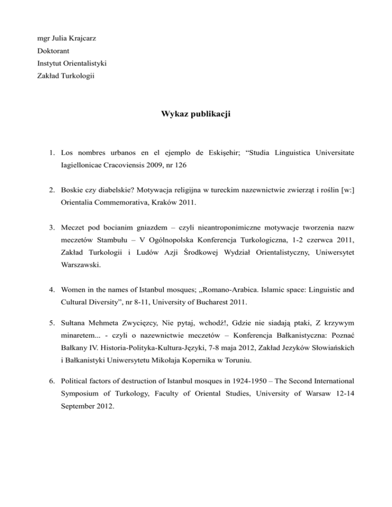 mgr Julia Krajcarz Doktorant Instytut Orientalistyki Zakład Turkologii Wykaz publikacji 1. Los nombres urbanos en el ejemplo de Eskişehir; “Studia Linguistica Universitate Iagiellonicae Cracoviensis 2009, nr 126 2. Boskie czy diabelskie? Motywacja religijna w tureckim nazewnictwie zwierząt i roślin [w:] Orientalia Commemorativa, Kraków 2011. 3. Meczet pod bocianim gniazdem – czyli nieantroponimiczne motywacje tworzenia nazw meczetów Stambułu – V Ogólnopolska Konferencja Turkologiczna, 1-2 czerwca 2011, Zakład Turkologii i Ludów Azji Środkowej Wydział Orientalistyczny, Uniwersytet Warszawski. 4. Women in the names of Istanbul mosques; „Romano-Arabica. Islamic space: Linguistic and Cultural Diversity”, nr 8-11, University of Bucharest 2011. 5. Sułtana Mehmeta Zwycięzcy, Nie pytaj, wchodź!, Gdzie nie siadają ptaki, Z krzywym minaretem... - czyli o nazewnictwie meczetów – Konferencja Bałkanistyczna: Poznać Bałkany IV. Historia-Polityka-Kultura-Języki, 7-8 maja 2012, Zakład Jezyków Słowiańskich i Bałkanistyki Uniwersytetu Mikołaja Kopernika w Toruniu. 6. Political factors of destruction of Istanbul mosques in 1924-1950 – The Second International Symposium of Turkology, Faculty of Oriental Studies, University of Warsaw 12-14 September 2012.