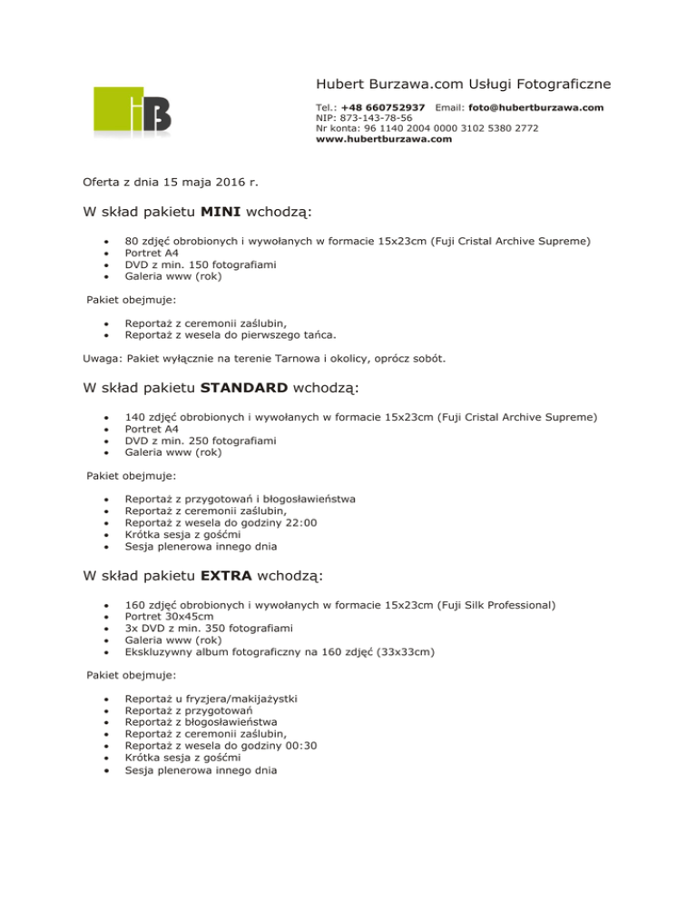 Hubert Burzawa.com Usługi Fotograficzne Tel.: +48 660752937 Email: [email protected] NIP: 873-143-78-56 Nr konta: 96 1140 2004 0000 3102 5380 2772 www.hubertburzawa.com Oferta z dnia 15 maja 2016 r. W skład pakietu MINI wchodzą: 80 zdjęć obrobionych i wywołanych w formacie 15x23cm (Fuji Cristal Archive Supreme) Portret A4 DVD z min. 150 fotografiami Galeria www (rok) Pakiet obejmuje: Reportaż z ceremonii zaślubin, Reportaż z wesela do pierwszego tańca. Uwaga: Pakiet wyłącznie na terenie Tarnowa i okolicy, oprócz sobót. W skład pakietu STANDARD wchodzą: 140 zdjęć obrobionych i wywołanych w formacie 15x23cm (Fuji Cristal Archive Supreme) Portret A4 DVD z min. 250 fotografiami Galeria www (rok) Pakiet obejmuje: Reportaż z przygotowań i błogosławieństwa Reportaż z ceremonii zaślubin, Reportaż z wesela do godziny 22:00 Krótka sesja z gośćmi Sesja plenerowa innego dnia W skład pakietu EXTRA wchodzą: 160 zdjęć obrobionych i wywołanych w formacie 15x23cm (Fuji Silk Professional) Portret 30x45cm 3x DVD z min. 350 fotografiami Galeria www (rok) Ekskluzywny album fotograficzny na 160 zdjęć (33x33cm) Pakiet obejmuje: Reportaż u fryzjera/makijażystki Reportaż z przygotowań Reportaż z błogosławieństwa Reportaż z ceremonii zaślubin, Reportaż z wesela do godziny 00:30 Krótka sesja z gośćmi Sesja plenerowa innego dnia W skład pakietu EXTRA+ wchodzą: 160 zdjęć obrobionych i wywołanych w formacie 15x23cm (Fuji Silk Professional) 3x portret 30x45cm 3x DVD z min. 350 fotografiami Galeria www (rok) Ekskluzywny album fotograficzny na 160 zdjęć (33x33cm) 2 albumy (25x25cm) - dla rodziców Pakiet obejmuje: Reportaż u fryzjera/makijażystki Reportaż z przygotowań Reportaż z błogosławieństwa Reportaż z ceremonii zaślubin, Reportaż z wesela do godziny 00:30 Krótka sesja z gośćmi Sesja plenerowa innego dnia W skład pakietu PREMIUM wchodzą: 200 zdjęć obrobionych i wywołanych w formacie 15x23cm (Fuji Silk Professional) 25 zdjęć z sesji narzeczeńskiej obrobionych i wywołanych w formacie 15x23cm Portret 30x45cm 3x DVD z min. 500 fotografiami Galeria www (rok) 3x prezentacja z podkładem muzycznym (PC & TV) Ekskluzywny album fotograficzny (33x33cm) 2x albumy (25x25cm) - dla rodziców Promocja! Kupon o wartości 100 zł na makijaż ślubny w salonie Estetica Pakiet obejmuje: Sesja narzeczeńska (randka przed ślubem) Reportaż u fryzjera/makijażystki Reportaż z przygotowań Reportaż z błogosławieństwa Reportaż z ceremonii zaślubin, Reportaż z wesela do godziny 00:30 Krótka sesja z gośćmi Sesja plenerowa innego dnia Pakiet PREMIUM zawiera w sumie trzy dni zdjęciowe. W skład pakietu PLENER wchodzą: 50 zdjęć obrobionych i wywołanych w formacie 15x23cm (Fuji Silk Professional) Portret 30x45cm DVD z min. 130 fotografiami Galeria www (rok) Pakiet obejmuje dzień plenerowy (4-6h) w wybranych lokalizacjach. Preferujemy dni od pn-pt. DODATKOWE USŁUGI Prezentacja multimedialna (diaporama) z podkładem muzycznym - 400 PLN Prezentacja multimedialna + dodatkowa prezentacja z własnych zdjęć w formie podziękowania dla rodziców - 600 PLN Dodatkowa kopia płyty DVD (nadruk na płycie i okładka) - 20 PLN (wydanie jednopłytowe) lub 30 PLN (wydanie dwupłytowe). Dodatkowo obrobione zdjęcie wraz z odbitką 15x23cm – 25 PLN/1 szt. Dodatkowa godzina pracy poza pakietem - 150 PLN Dodatkowy fotograf - cena zależna od pakietu. Cały materiał RAW - 900 PLN (pendrive) Istnieje możliwość wykonania wszelkich dodatków takich jak np.: ramy na zamówienie z portretem, zdjęcia na płótnie, fotografie w dużych formatach itd. Zapytania prosimy kierować na adres e-mail lub telefonicznie ([email protected] / +48 660-752-937). Ceny zawierają podatek. Dla naszych klientów oferujemy zniżki na odbitki Fuji Film. INNE Fotoksięgi lub albumy fotograficzne wykonane są z wysokiej klasy materiałów. Wzory, kolory, tłoczenia, obszycia itd. wybierane są przez Państwa na spotkaniu. Ceny pakietów nie zawierają ewentualnych kosztów transportu i noclegu. Koszt dojazdu wliczany jest gdy miejsce zaślubin/pleneru jest oddalone więcej niż 100km od Tarnowa i wynosi 1.50 PLN/km w obie strony.