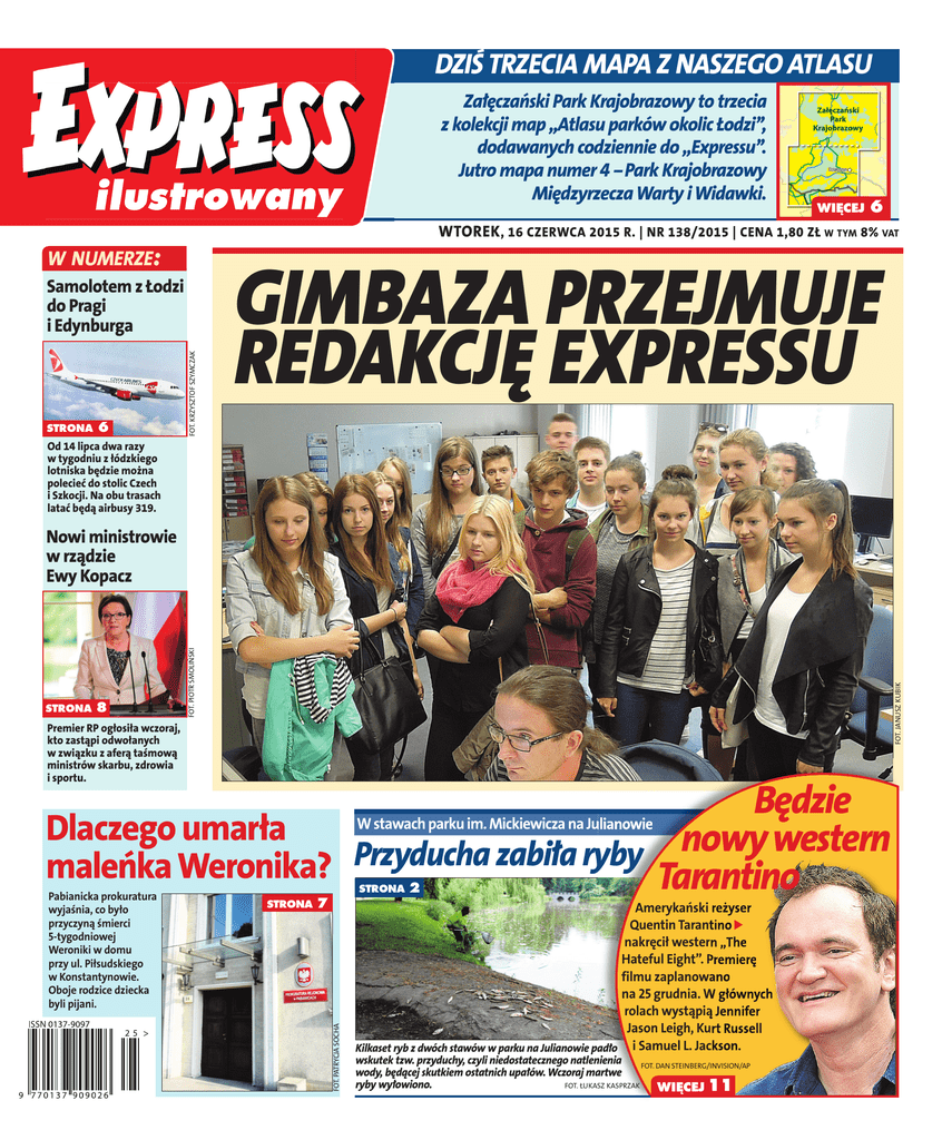 DZiś TrZEciA MAPA Z nAsZEgo ATlAsu Załęczański Park Krajobrazowy to trzecia z kolekcji map ,,Atlasu parków okolic Łodzi’’, dodawanych codziennie do ,,Expressu’’. Jutro mapa numer 4 --Park Krajobrazowy Międzyrzecza Warty i Widawki. WIĘCEJ 6 WTOREK , 16 czERWca 2015 R. | NR 138/2015 | cENa 1,80 zł W Tym 8% vaT W nuMErZE: STRONA 6 fot. krzySztof Szymczak Samolotem z łodzi do Pragi i Edynburga gimbaza przejmuje redakcję expressu Od 14 lipca dwa razy w tygodniu z łódzkiego lotniska będzie można polecieć do stolic czech i Szkocji. Na obu trasach latać będą airbusy 319. 8 fot. januSz kubik STRONA fot. Piotr SmolińSki Nowi ministrowie w rządzie Ewy Kopacz Premier RP ogłosiła wczoraj, kto zastąpi odwołanych w związku z aferą taśmową ministrów skarbu, zdrowia i sportu. Będzie W stawach parku im. Mickiewicza na Julianowie Dlaczego umarła nowy western Przyducha zabiła ryby maleńka Weronika? Tarantino STRONA STRONA 7 fot. Patrycja Socha Pabianicka prokuratura wyjaśnia, co było przyczyną śmierci 5-tygodniowej Weroniki w domu przy ul. Piłsudskiego w Konstantynowie. Oboje rodzice dziecka byli pijani. 2 Amerykański reżyser Quentin Tarantino x nakręcił western ,,The Hateful Eight”. Premierę filmu zaplanowano na 25 grudnia. W głównych rolach wystąpią Jennifer Jason Leigh, Kurt Russell Kilkaset ryb z dwóch stawów w parku na Julianowie padło i Samuel L. Jackson. wskutek tzw. przyduchy, czyli niedostatecznego natlenienia fot. Dan Steinberg/inviSion/aP wody, będącej skutkiem ostatnich upałów. Wczoraj martwe ryby wyłowiono. fot. łukaSz kaSPrzak fot. maciej Stanik WIĘCEJ 11