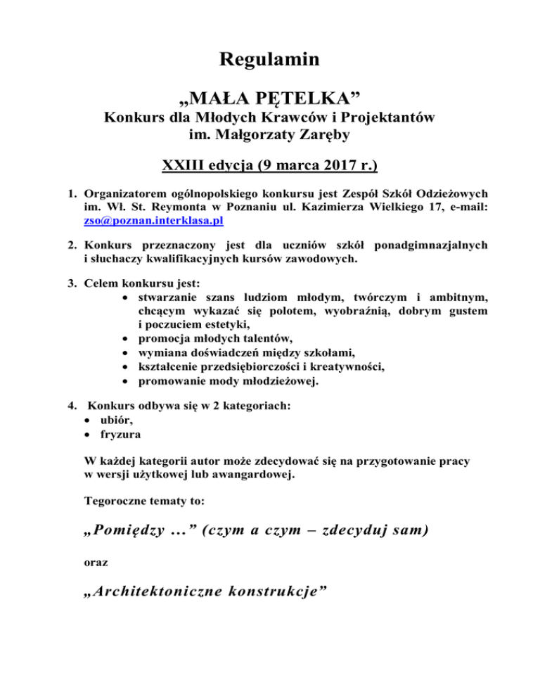 Regulamin „MAŁA PĘTELKA” Konkurs dla Młodych Krawców i Projektantów im. Małgorzaty Zaręby XXIII edycja (9 marca 2017 r.) 1. Organizatorem ogólnopolskiego konkursu jest Zespół Szkół Odzieżowych im. Wł. St. Reymonta w Poznaniu ul. Kazimierza Wielkiego 17, e-mail: [email protected] 2. Konkurs przeznaczony jest dla uczniów szkół ponadgimnazjalnych i słuchaczy kwalifikacyjnych kursów zawodowych. 3. Celem konkursu jest: stwarzanie szans ludziom młodym, twórczym i ambitnym, chcącym wykazać się polotem, wyobraźnią, dobrym gustem i poczuciem estetyki, promocja młodych talentów, wymiana doświadczeń między szkołami, kształcenie przedsiębiorczości i kreatywności, promowanie mody młodzieżowej. 4. Konkurs odbywa się w 2 kategoriach: ubiór, fryzura W każdej kategorii autor może zdecydować się na przygotowanie pracy w wersji użytkowej lub awangardowej. Tegoroczne tematy to: „Pomiędzy …” (czym a czym – zdecyduj sam) oraz „Architektoniczne konstrukcje” 5. Kolekcje muszą składać się z minimum: dla kategorii „ubiór” – 3 modeli, dla kategorii „ fryzura” – 1 modelu, 6. Zgłoszenie dla kategorii ubiór powinno zawierać: tytuł kolekcji nazwisko autora krótką informację o kolekcji (liczba modeli itp.) (według załącznika) 7. Każdy uczestnik konkursu zobowiązany jest do zgłoszenia dołączyć podpisaną przez opiekunów prawnych zgodę na wykorzystanie wizerunku i przetwarzanie danych osobowych. (Załącznik 4) 8. Autor we własnym zakresie przygotowuje aranżację pokazu. Czas pokazu nie może przekroczyć dla 3 modeli – 2 minut. 9. Jury powołane przez organizatorów konkursu oceniać będzie: o pomysł, o kolorystykę, o zharmonizowanie całości, o wizjonerstwo, o zgodność z trendami mody, o ciekawą formę prezentacji. Autorom najlepszych prac przyznane zostaną „Małe Pętelki” i nagrody rzeczowe. 10. Podczas prezentacji nagrodzonych kolekcji poza szkołą organizatorzy zastrzegają sobie prawo do zmiany aranżacji i doboru modelek. 11. Organizatorzy mogą unieważnić przyznaną nagrodę w przypadku udowodnienia plagiatu lub niedopełnienia wymogów regulaminowych. 12. W sprawach nienormowanych niniejszym regulaminem decyzje podejmuje przewodnicząca konkursu dyr. ZSO Grażyna Łakomiec. 13. Wszelkich informacji udziela organizatorka konkursu p. Maria Korczak. Wstępne zgłoszenia należy przysłać do 18 grudnia 2016 (Załącznik 1) Ostateczny termin zgłoszeń do 17 lutego 2017 (Załączniki 2 i 3) Z przyczyn organizacyjnych prosimy o przesłanie muzyki (w formacie mp3) do kolekcji na poniższy adres mailowy. Zgłoszenia przyjmuje p. M. Korczak osobiście, na adres e-mail: [email protected] lub listownie na adres szkoły z dopiskiem „MAŁA PĘTELKA”