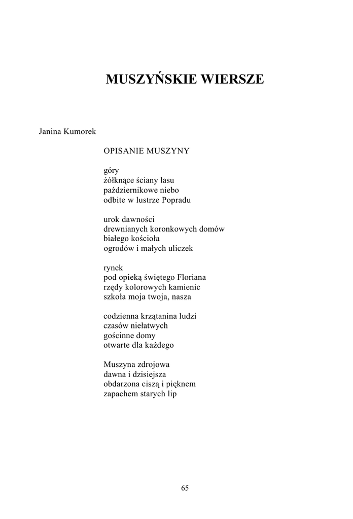 MUSZYŃSKIE WIERSZE Janina Kumorek OPISANIE MUSZYNY góry żółknące ściany lasu październikowe niebo odbite w lustrze Popradu urok dawności drewnianych koronkowych domów białego kościoła ogrodów i małych uliczek rynek pod opieką świętego Floriana rzędy kolorowych kamienic szkoła moja twoja, nasza codzienna krzątanina ludzi czasów niełatwych gościnne domy otwarte dla każdego Muszyna zdrojowa dawna i dzisiejsza obdarzona ciszą i pięknem zapachem starych lip 65 Janina Kumorek NAGIETKI późną jesienią nagietki biorą w swoje posiadanie ogród płomienia się radośnie przed oknami starego domu i wdzięczą się do słońca a w szare dni same są słońcem i wspomnieniem złotego lata Muszyńskie lato pachnące lipami 66 66 Adam Krysiak UNIESIENIE Jeśli mam odejść teraz, tu gdy brak mi tchu gdy warem tętni w skroniach krew Górom chcę tchnąć ostatnie tchnienie mój zachwyt moje uniesienie gdzieś pośród jodeł i modrzewia Adam Krysiak CERKIEWNY CHÓR Zauroczonym Kopuła cerkwi w słońcu tonie w bukowej miedzi i rubinie Niesiony ciepłym wiatru tchnieniem ton wodogrzmotów górą płynie Jak chór cerkiewny na dwa głosy Gdzie kamień — tam się pieni W łożu szerokim sennie westchnie Jak my — oczarowani... zauroczeni. 67 Adam Frysiak NAD WIERCHOMLĄ Druhowi ze szlaku Tu Anioł Pański mi smakuje choć zamróz w mokre plecy kąsa z plecaka kęs suchego chleba z termosu — łyk gorąca Druh mój jak Zwiastun mówi do Matki Bożej: Dziękujemy — za to, co było dziękujemy, bo mogło być gorzej Nad Wierchomlą — na dachu na miarę moją — świata cudownie krzepi mnie suchy, zmrożony chleb i niekrzepnąca ,,Delikata” W słońcu — nagroda spiętrzony masyw Tatr rześki, przyjazny słoneczny chyba wiatr i droga... 68