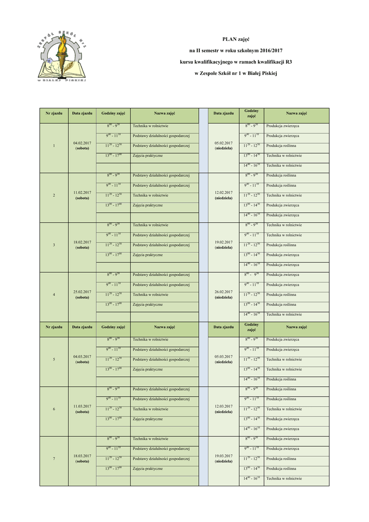 PLAN zajęć na II semestr w roku szkolnym 2016/2017 kursu kwalifikacyjnego w ramach kwalifikacji R3 w Zespole Szkół nr 1 w Białej Piskiej Nr zjazdu 1 2 3 4 Nr zjazdu 5 6 7 Data zjazdu 04.02.2017 (sobota) 11.02.2017 (sobota) 18.02.2017 (sobota) 25.02.2017 (sobota) Data zjazdu 04.03.2017 (sobota) 11.03.2017 (sobota) 18.03.2017 (sobota) Godziny zajęć Nazwa zajęć Data zjazdu Godziny zajęć Nazwa zajęć 800 - 930 Technika w rolnictwie 800 - 930 Produkcja zwierzęca 940 - 1110 Podstawy działalności gospodarczej 940 - 1110 Produkcja zwierzęca 1120 - 1250 Podstawy działalności gospodarczej 1120 - 1250 Produkcja roślinna 1300 - 1700 Zajęcia praktyczne 1300 - 1430 Technika w rolnictwie 1440 - 1610 Technika w rolnictwie 05.02.2017 (niedziela) 800 - 930 Podstawy działalności gospodarczej 800 - 930 Produkcja roślinna 940 - 1110 Podstawy działalności gospodarczej 940 - 1110 Produkcja roślinna 1120 - 1250 Technika w rolnictwie 1120 - 1250 Technika w rolnictwie 1300 - 1700 Zajęcia praktyczne 1300 - 1430 Produkcja zwierzęca 1440 - 1610 Produkcja zwierzęca 12.02.2017 (niedziela) 800 - 930 Technika w rolnictwie 800 - 930 Technika w rolnictwie 940 - 1110 Podstawy działalności gospodarczej 940 - 1110 Technika w rolnictwie 1120 - 1250 Podstawy działalności gospodarczej 1120 - 1250 Produkcja roślinna 1300 - 1700 Zajęcia praktyczne 1300 - 1430 Produkcja zwierzęca 1440 - 1610 Produkcja zwierzęca 19.02.2017 (niedziela) 800 - 930 Podstawy działalności gospodarczej 800 - 930 Produkcja zwierzęca 940 - 1110 Podstawy działalności gospodarczej 940 - 1110 Produkcja zwierzęca 1120 - 1250 Technika w rolnictwie 1120 - 1250 Produkcja roślinna 1300 - 1700 Zajęcia praktyczne 1300 - 1430 Produkcja roślinna 1440 - 1610 Technika w rolnictwie Godziny zajęć Nazwa zajęć 26.02.2017 (niedziela) Data zjazdu Godziny zajęć Nazwa zajęć 800 - 930 Technika w rolnictwie 800 - 930 Produkcja zwierzęca 940 - 1110 Podstawy działalności gospodarczej 940 - 1110 Produkcja zwierzęca 1120 - 1250 Podstawy działalności gospodarczej 1120 - 1250 Technika w rolnictwie 1300 - 1700 Zajęcia praktyczne 1300 - 1430 Technika w rolnictwie 1440 - 1610 Produkcja roślinna 05.03.2017 (niedziela) 800 - 930 Podstawy działalności gospodarczej 800 - 930 Produkcja roślinna 940 - 1110 Podstawy działalności gospodarczej 940 - 1110 Produkcja roślinna 1120 - 1250 Technika w rolnictwie 1120 - 1250 Technika w rolnictwie 1300 - 1700 Zajęcia praktyczne 1300 - 1430 Produkcja zwierzęca 1440 - 1610 Produkcja zwierzęca 12.03.2017 (niedziela) 800 - 930 Technika w rolnictwie 800 - 930 Produkcja zwierzęca 940 - 1110 Podstawy działalności gospodarczej 940 - 1110 Produkcja zwierzęca 1120 - 1250 Podstawy działalności gospodarczej 1120 - 1250 Produkcja roślinna 1300 - 1700 Zajęcia praktyczne 1300 - 1430 Produkcja roślinna 1440 - 1610 Technika w rolnictwie 19.03.2017 (niedziela) 8 9 10 Nr zjazdu 11 25.03.2017 (sobota) 01.04.2017 (sobota) 08.04.2017(so bota) Data zjazdu 22.04.2017 (sobota) 800 - 930 Podstawy działalności gospodarczej 800 - 930 Produkcja zwierzęca 940 - 1110 Podstawy działalności gospodarczej 940 - 1110 Produkcja zwierzęca 1120 - 1250 Technika w rolnictwie 1120 - 1250 Produkcja roślinna 1300 - 1700 Zajęcia praktyczne 1300 - 1430 Produkcja roślinna 1440 - 1610 Produkcja roślinna 26.03.2017 (niedziela) 800 - 930 Technika w rolnictwie 800 - 930 Produkcja roślinna 940 - 1110 Podstawy działalności gospodarczej 940 - 1110 Produkcja roślinna 1120 - 1250 Podstawy działalności gospodarczej 1120 - 1250 Produkcja zwierzęca 1300 - 1700 Zajęcia praktyczne 1300 - 1430 Produkcja zwierzęca 1440 - 1610 Produkcja zwierzęca 02.04.2017 (niedziela) 800 - 930 Podstawy działalności gospodarczej 800 - 930 Produkcja zwierzęca 940 - 1110 Podstawy działalności gospodarczej 940 - 1110 Produkcja zwierzęca 1120 - 1250 Technika w rolnictwie 1120 - 1250 Produkcja zwierzęca 1300 - 1700 Zajęcia praktyczne 1300 - 1430 Produkcja roślinna 1440 - 1610 Produkcja roślinna Godziny zajęć Nazwa zajęć 09.04.2017(nied ziela) Data zjazdu Godziny zajęć 800 - 930 Technika w rolnictwie 800 - 930 Produkcja zwierzęca 940 - 1110 Produkcja roślinna 940 - 1110 Produkcja zwierzęca 1120 - 1250 Podstawy działalności gospodarczej 1120 - 1250 Produkcja roślinna 1300 - 1700 Zajęcia praktyczne 1300 - 1430 Produkcja roślinna 1440 - 1610 Produkcja roślinna 23.04.2017 (niedziela) 20 50 16 - 17 12 13 14 29.04.2017 (sobota) 06.05.2017 (sobota) 13.05.2017 (sobota) Nazwa zajęć Podstawy działalności gospodarczej 800 - 930 Technika w rolnictwie 800 - 930 Produkcja roślinna 940 - 1110 Podstawy działalności gospodarczej 940 - 1110 Produkcja roślinna 1120 - 1250 Podstawy działalności gospodarczej 1120 - 1250 Produkcja roślinna 1300 - 1700 Zajęcia praktyczne 1300 - 1430 Technika w rolnictwie 1440 - 1610 Produkcja zwierzęca 1620 - 1750 Produkcja zwierzęca 30.04.2017 (niedziela) 800 - 930 Podstawy działalności gospodarczej 800 - 930 Produkcja roślinna 940 – 1110 Podstawy działalności gospodarczej 940 – 1110 Produkcja roślinna 1120 – 1250 Technika w rolnictwie 1120 - 1250 Produkcja roślinna 1300 - 1430 Podstawy działalności gospodarczej 1440 – 1610 Technika w rolnictwie 1300-1700 Zajęcia praktyczne 800 - 930 Podstawy działalności gospodarczej 940 - 1110 Podstawy działalności gospodarczej 1120 - 1250 Technika w rolnictwie 1300 - 1700 Zajęcia praktyczne 07.05.2017 (niedziela)