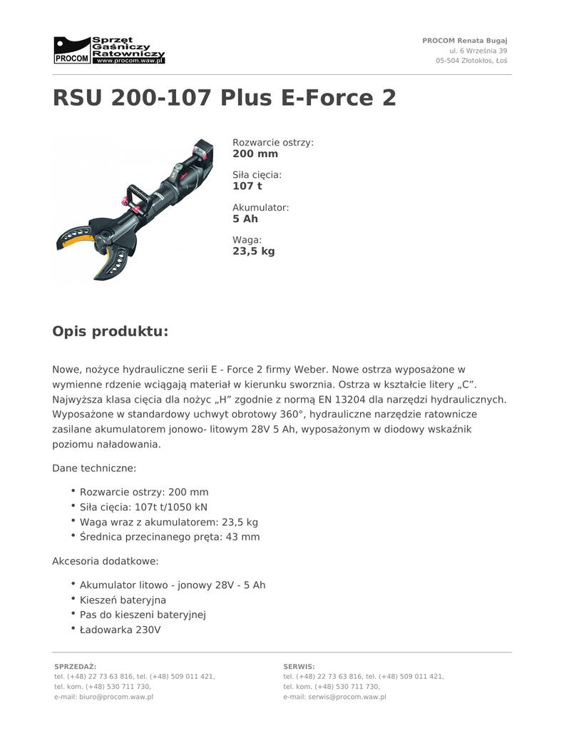 PROCOM Renata Bugaj ul. 6 Września 39 05-504 Złotokłos, Łoś RSU 200-107 Plus E-Force 2 Rozwarcie ostrzy: 200 mm Siła cięcia: 107 t Akumulator: 5 Ah Waga: 23,5 kg Opis produktu: Nowe, nożyce hydrauliczne serii E - Force 2 firmy Weber. Nowe ostrza wyposażone w wymienne rdzenie wciągają materiał w kierunku sworznia. Ostrza w kształcie litery „C”. Najwyższa klasa cięcia dla nożyc „H” zgodnie z normą EN 13204 dla narzędzi hydraulicznych. Wyposażone w standardowy uchwyt obrotowy 360°, hydrauliczne narzędzie ratownicze zasilane akumulatorem jonowo- litowym 28V 5 Ah, wyposażonym w diodowy wskaźnik poziomu naładowania. Dane techniczne: Rozwarcie ostrzy: 200 mm Siła cięcia: 107t t/1050 kN Waga wraz z akumulatorem: 23,5 kg Średnica przecinanego pręta: 43 mm Akcesoria dodatkowe: Akumulator litowo - jonowy 28V - 5 Ah Kieszeń bateryjna Pas do kieszeni bateryjnej Ładowarka 230V SPRZEDAŻ: tel. (+48) 22 73 63 816, tel. (+48) 509 011 421, SERWIS: tel. (+48) 22 73 63 816, tel. (+48) 509 011 421, tel. kom. (+48) 530 711 730, tel. kom. (+48) 530 711 730, e-mail: [email protected] e-mail: [email protected] PROCOM Renata Bugaj ul. 6 Września 39 05-504 Złotokłos, Łoś Ładowarka zasilacz kablowy SPRZEDAŻ: tel. (+48) 22 73 63 816, tel. (+48) 509 011 421, SERWIS: tel. (+48) 22 73 63 816, tel. (+48) 509 011 421, tel. kom. (+48) 530 711 730, tel. kom. (+48) 530 711 730, e-mail: [email protected] e-mail: [email protected]