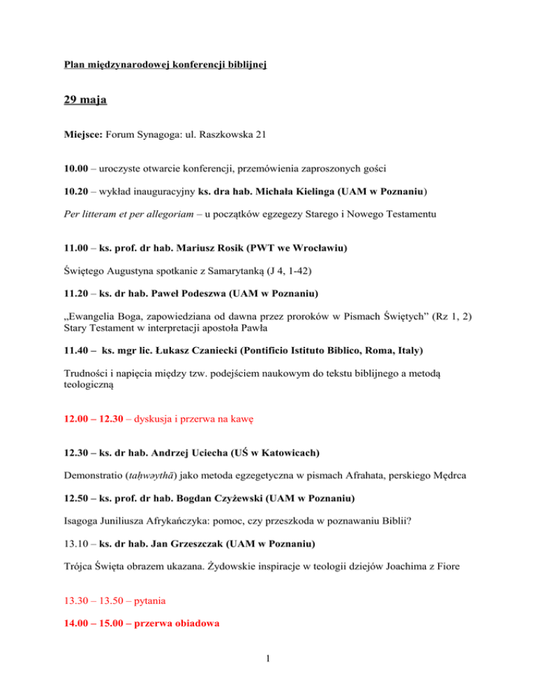 Plan międzynarodowej konferencji biblijnej 29 maja Miejsce: Forum Synagoga: ul. Raszkowska 21 10.00 – uroczyste otwarcie konferencji, przemówienia zaproszonych gości 10.20 – wykład inauguracyjny ks. dra hab. Michała Kielinga (UAM w Poznaniu) Per litteram et per allegoriam – u początków egzegezy Starego i Nowego Testamentu 11.00 – ks. prof. dr hab. Mariusz Rosik (PWT we Wrocławiu) Świętego Augustyna spotkanie z Samarytanką (J 4, 1-42) 11.20 – ks. dr hab. Paweł Podeszwa (UAM w Poznaniu) „Ewangelia Boga, zapowiedziana od dawna przez proroków w Pismach Świętych” (Rz 1, 2) Stary Testament w interpretacji apostoła Pawła 11.40 – ks. mgr lic. Łukasz Czaniecki (Pontificio Istituto Biblico, Roma, Italy) Trudności i napięcia między tzw. podejściem naukowym do tekstu biblijnego a metodą teologiczną 12.00 – 12.30 – dyskusja i przerwa na kawę 12.30 – ks. dr hab. Andrzej Uciecha (UŚ w Katowicach) Demonstratio (taḥwəythā) jako metoda egzegetyczna w pismach Afrahata, perskiego Mędrca 12.50 – ks. prof. dr hab. Bogdan Czyżewski (UAM w Poznaniu) Isagoga Juniliusza Afrykańczyka: pomoc, czy przeszkoda w poznawaniu Biblii? 13.10 – ks. dr hab. Jan Grzeszczak (UAM w Poznaniu) Trójca Święta obrazem ukazana. Żydowskie inspiracje w teologii dziejów Joachima z Fiore 13.30 – 13.50 – pytania 14.00 – 15.00 – przerwa obiadowa 1 SEKCJA I 15.00 – ks. prof. dr hab. Krzysztof Bardski (UKSW w Warszawie) Tradycyjna interpretacja alegoryczna Biblii z perspektywy współczesnej noematyki 15.20 – prof. ThDr. Albín Masarik (Pedagogická fakulta UMB v Banskej Bystrici, Slovakia) The Wisdom in the Communication-Process of Jesus 15.40 – dr Piotr Lorek (EWST we Wrocławiu) Śmierć Jezusa Chrystusa w Ewangeliach Nowego Testamentu 16.00 – 16.20 – pytania 16.20 – ks. prof. dr hab. Józef Naumowicz (UKSW w Warszawie) Symboliczne daty życia biblijnych patriarchów w egzegezie rabinicznej i patrystycznej 16.40 – prof. asist. Paul-Cazar Hârlăoanu (Faculty of Orthodox Theology, Iasi, Romania) Song of Songs in Christian Interpretation. From Origen to St. Gregory of Nyssa 17.00 – dr Joanna Lisek (UWr) Biblijna Rachela i jej interpretacja w jidyszowej literaturze kobiet 17.20 – 17.40 – pytania SEKCJA II Miejsce: Sala 23 (I p.) w Alma Mater Ostroviensis: ul. Gimnazjalna 9 15.00 – dr Dominika Budzanowska (UKSW w Warszawie) Jeden z siedmiu kluczy Tykoniusza 15.20 – dr Sławomir Torbus (UWr/EWST we Wrocławiu) Znaczenie wyrażenia ὁδὸν ποιεῖν w Mk 2, 23 2 15.40 – dr Amadeusz Citlak (Instytut Psychologii PAN Warszawa) Psychologiczna interpretacja tekstu biblijnego – możliwości i zagrożenia 16.00 – 16.20 – pytania 16.20 – dr Maria Chantry (UWr) Próby egzegezy biblijnej w twórczości Macieja Kazimierza Sarbiewskiego SJ (1595-1640) 16.40 – ks. Mirosław Chmielowski (PWT we Wrocławiu) Vanitas vanitatum omnia vanitas (Koh 1, 2). Idea vanitas w Alkuinowym Komentarzu do Ecclesiastesa 17.00 – dr Anna Rambiert (PWT we Wrocławiu) Epistemologiczne pożytki z badań nad metaforami biblijnymi, na przykładzie 2 Tm 2, 4-6 17.20 – 17.40 – pytania Od 18.30 – bankiet Miejsce: Forum Synagoga: ul. Raszkowska 21 3 30 maj 8.30 – ks. prof. dr hab. Jan Klinkowski (PWT we Wrocławiu) Biblijne tło symboliki serca w kulturze europejskiej 8.50 – ks. dr Waldemar Linke (UKSW w Warszawie) Tykoniusz: w poszukiwaniu trzeciej drogi między dosłownością a alegoryzmem 9.10 – dr Krzysztof Morta (UWr) Shaphan – kwestie identyfikacyjne i egzegetyczne 9.30 – 9.40 – pytania 9.40 – ks. dr Mirosław Mejzner (UKSW w Warszawie) Starochrześcijańska egzegeza „odzienia ze skór” (Rdz 3, 21) 10.00 – Ryszard Bobrowicz (CLAS w Warszawie) Czy Adam i Ewa naprawdę istnieli? Analiza interpretacji patrystycznych pierwszych rozdziałów Księgi Rodzaju 10.20 – Marek Kurkierewicz (ChAT w Warszawie) Peszer jako odpowiedź na potrzebę aktualizacji tekstu biblijnego 10.40 – 11.10 – pytania i przerwa kawowa 11.10 – Magdalena Jóźwiak (UWr) Komentarz do historii Hioba Filipa Prezbitera. Wybrane kwestie egzegetyczne 11.30 – Łukasz Krzyszczuk (UWr) Wpływ Dydyma Ślepego na Komentarz do Księgi Zachariasza św. Hieronima 11.50 – Ludmiła Lach-Bartlik (UŚ w Katowicach) In Christi figura – z zagadnień alegorycznego języka Apponiusza 12.10 – 12.20 – pytania 4 12.20 – Paweł Chról (UJ) Analiza zależności między znaczeniem dosłownym i mistycznym w żydowskiej egzegezie 12.40 – dr Sebastian Smolarz (EWST we Wrocławiu) Prawa dietetyczne w Biblii hebrajskiej a konflikt metod egzegezy tekstów świętych 13.00 – Sylwia Sperling (UP JP II w Krakowie) Antychryst alegoryczny czy antychryst dosłowny? Ojców Kościoła (i nie tylko) próby rozszyfrowania tajemnicy antychrysta 13.20 – 13.30 – pytania 13.30 – 14.40 – przerwa obiadowa SEKCJA I 14.40 – dr Igor Baron (WSTH w Podkowie Leśnej) Specyfika strukturalna w analizie egzegetycznej pierwszego rozdziału Księgi Daniela i jej wpływ na interpretację tekstu 15.00 – Zofia Brzozowska (UŁ) Uczta u Mądrości. Literackie i wizualne interpretacje Prz 9, 1 – 6 w kulturze Słowian prawosławnych XIII – XVI w. 15.20 – Alicja Malinowska (UW) Ile jest alegorii, a ile dosłowności w Psalmie 34? – prezentacja wniosków uzyskanych za pomocą metody analizy retorycznej 15.40 – 15.50 – pytania 15.50 – Maciej Dąbrowski (UWr) Rabbinic discussion in John 3:1-21 16.10 – Klaudia Karwacka (UP JP II w Krakowie) Kościół Chrystusowy. Przesłanie apokaliptycznych Listów do 7 Kościołów 5 16.30 – Łukasz Kosiński (UMCS w Lublinie) Egzegeza biblijna we wczesnej hagiografii iryjskiej na podstawie Vita Sancti Columbae pióra Adamnana z Iony 16.50 – 17.10 – pytania SEKCJA II Miejsce: Sala 23 (I p.) w Alma Mater Ostroviensis: ul. Gimnazjalna 9 14.40 – Paulina Nicko (UWr) Symbolika węża w Biblii – studium komparatystyczne wybranych tekstów Starego i Nowe