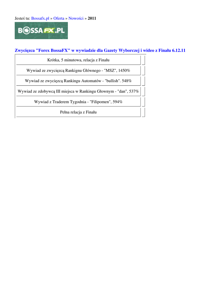 Jesteś tu: Bossafx.pl » Oferta » Nowości » 2011 Zwycięzca "Forex BossaFX" w wywiadzie dla Gazety Wyborczej i wideo z Finału 6.12.11 Krótka, 5 minutowa, relacja z Finału Wywiad ze zwycięzcą Rankignu Głównego - "MSZ", 1450% Wywiad ze zwycięzcą Rankingu Automatów - "bullish". 548% Wywiad ze zdobywcą III miejsca w Rankingu Głownym - "dan", 537% Wywiad z Traderem Tygodnia - "Filipomen", 594% Pełna relacja z Finału