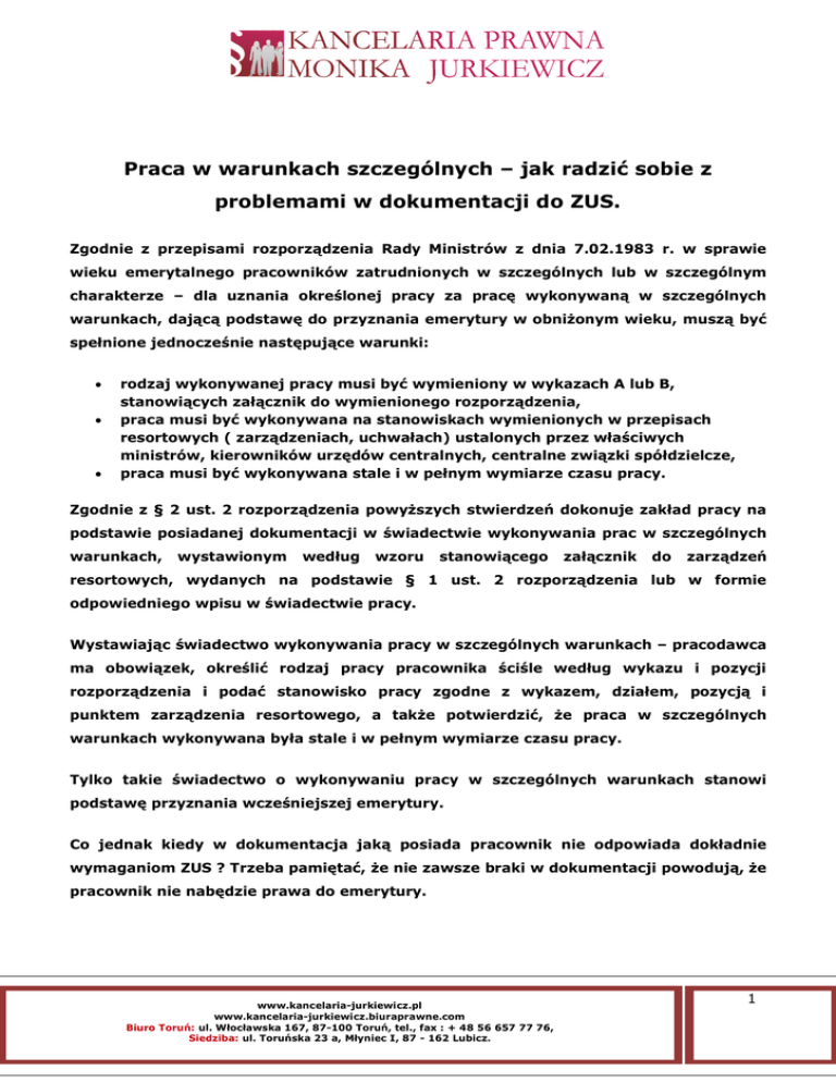 Praca w warunkach szczególnych – jak radzić sobie z problemami w dokumentacji do ZUS. Zgodnie z przepisami rozporządzenia Rady Ministrów z dnia 7.02.1983 r. w sprawie wieku emerytalnego pracowników zatrudnionych w szczególnych lub w szczególnym charakterze – dla uznania określonej pracy za pracę wykonywaną w szczególnych warunkach, dającą podstawę do przyznania emerytury w obniżonym wieku, muszą być spełnione jednocześnie następujące warunki: rodzaj wykonywanej pracy musi być wymieniony w wykazach A lub B, stanowiących załącznik do wymienionego rozporządzenia, praca musi być wykonywana na stanowiskach wymienionych w przepisach resortowych ( zarządzeniach, uchwałach) ustalonych przez właściwych ministrów, kierowników urzędów centralnych, centralne związki spółdzielcze, praca musi być wykonywana stale i w pełnym wymiarze czasu pracy. Zgodnie z § 2 ust. 2 rozporządzenia powyższych stwierdzeń dokonuje zakład pracy na podstawie posiadanej dokumentacji w świadectwie wykonywania prac w szczególnych warunkach, wystawionym według wzoru stanowiącego załącznik do zarządzeń resortowych, wydanych na podstawie § 1 ust. 2 rozporządzenia lub w formie odpowiedniego wpisu w świadectwie pracy. Wystawiając świadectwo wykonywania pracy w szczególnych warunkach – pracodawca ma obowiązek, określić rodzaj pracy pracownika ściśle według wykazu i pozycji rozporządzenia i podać stanowisko pracy zgodne z wykazem, działem, pozycją i punktem zarządzenia resortowego, a także potwierdzić, że praca w szczególnych warunkach wykonywana była stale i w pełnym wymiarze czasu pracy. Tylko takie świadectwo o wykonywaniu pracy w szczególnych warunkach stanowi podstawę przyznania wcześniejszej emerytury. Co jednak kiedy w dokumentacja jaką posiada pracownik nie odpowiada dokładnie wymaganiom ZUS ? Trzeba pamiętać, że nie zawsze braki w dokumentacji powodują, że pracownik nie nabędzie prawa do emerytury. www.kancelaria-jurkiewicz.pl www.kancelaria-jurkiewicz.biuraprawne.com Biuro Toruń: ul. Włocławska 167, 87-100 Toruń, tel., fax : + 48 56 657 77 76, Siedziba: ul. Toruńska 23 a, Młyniec I, 87 - 162 Lubicz. Strona 1 Dla oceny, czy pracownik pracował w szczególnych warunkach, nie ma istotnego znaczenia nazwa zajmowanego przez niego stanowiska, tylko rodzaj powierzonej mu pracy (rzeczywiście wykonywanych zadań pracowniczych). Praca w szczególnych warunkach to praca wykonywana stale (codziennie) i w pełnym wymiarze czasu pracy (przez 8 godzin jeżeli pracownika obowiązuje taki wymiar czasu pracy) w warunkach pozwalających na uznanie jej za jeden z rodzajów pracy wymienionych w wykazie stanowiącym załącznik do rozporządzenia Rady Ministrów z dnia 7 lutego 1983 r. w sprawie wieku emerytalnego pracowników zatrudnionych w szczególnych warunkach lub w szczególnym charakterze (Dz.U. Nr 8, poz. 43 ze zm.).” Z uprawnienia do emerytury w wieku wcześniejszym niż ustawowy korzysta zatem pracownik, który udowodni, że wykonywał pracę w szczególnych warunkach stale i w wymiarze nie niższym od czasu pracy obowiązującego go na zajmowanym stanowisku, bez względu na to, czy nazwa tego stanowiska odpowiada stanowisku określonemu np. w wykazach resortowych. O tym natomiast, czy praca wykonywana była w szczególnych warunkach lub w szczególnym charakterze, decydują warunki jej wykonywania oraz jej charakter, a nie to, czy w świadectwie pracy wyraźnie napisano, że była to praca w szczególnych warunkach lub w szczególnym charakterze. Treść świadectwa pracy jedynie fakt taki potwierdza i dokumentuje, ale go nie tworzy Nie można zatem ograniczać możliwości udowodnienia, że dana praca wykonywana była w szczególnych warunkach lub w szczególnym charakterze, jedynie do świadectw wykonywania prac w szczególnych warunkach, wystawionych według ustalonego w przepisach wzoru oraz do świadectw pracy posiadających wyraźny zapis wykonywaniu pracy w szczególnych warunkach lub szczególnym charakterze. Monika Jurkiewicz Radca prawny www.kancelaria-jurkiewicz.pl www.kancelaria-jurkiewicz.biuraprawne.com Biuro Toruń: ul. Włocławska 167, 87-100 Toruń, tel., fax : + 48 56 657 77 76, Siedziba: ul. Toruńska 23 a, Młyniec I, 87 - 162 Lubicz. Strona 2 o