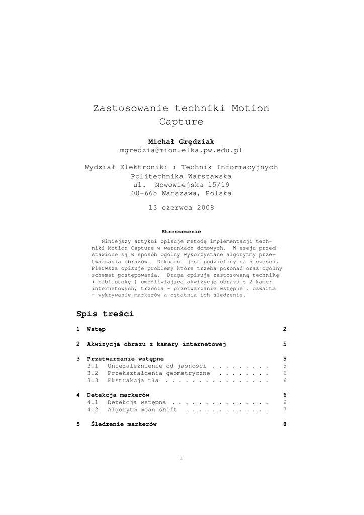Zastosowanie techniki Motion Capture Michał Grędziak [email protected] Wydział Elektroniki i Technik Informacyjnych Politechnika Warszawska ul. Nowowiejska 15/19 00-665 Warszawa, Polska 13 czerwca 2008 Streszczenie Niniejszy artykuł opisuje metodę implementacji techniki Motion Capture w warunkach domowych. W eseju przedstawione są w sposób ogólny wykorzystane algorytmy przetwarzania obrazów. Dokument jest podzielony na 5 części. Pierwsza opisuje problemy które trzeba pokonać oraz ogólny schemat postępowania. Druga opisuje zastosowaną technikę ( bibliotekę ) umożliwiającą akwizycję obrazu z 2 kamer internetowych, trzecia - przetwarzanie wstępne , czwarta - wykrywanie markerów a ostatnia ich śledzenie. Spis treści 1 Wstęp 2 2 Akwizycja obrazu z kamery internetowej 5 3 Przetwarzanie wstępne 3.1 Uniezależnienie od jasności . . . . . . . . . 3.2 Przekształcenia geometryczne . . . . . . . . 3.3 Ekstrakcja tła . . . . . . . . . . . . . . . . 5 5 6 6 4 Detekcja markerów 4.1 Detekcja wstępna . . . . . . . . . . . . . . . 4.2 Algorytm mean shift . . . . . . . . . . . . . 6 6 7 5 Śledzenie markerów 8 1 1 1 WSTĘP Wstęp Projekt gry interaktywnej oparty jest na pomyśle połączenia standardowej gry 3D z techniką "motion capture". Dokładniej, gracz jest obserwowany przez co najmniej 3 kamery a jego ruchy śledzone i przełożone na postać 3D. Jest to coś więcej niż tylko sterowanie myszką. Można sterować postacią za pomocą ruchów rąk czy całego korpusu. Gesty jednego gracza widzi gracz drugi który jest po drugiej stronie sieci, gdyż podstawą funkcjonalnością gry będzie możliwość grania przez sieć. W celu rozpoznania postawy, na odpowiednich częściach ciała będą umieszczone kolorowe markery. Z punktu widzenie ekonomicznego oraz samej wygody systemu jest umieszczenie jak najmniejszej liczby kamer oraz wykorzystanie jak najmniejszej liczby maszyn w celu przetwarzania odebranego sygnału. Jedna kamera będzie przekazywać widok z przodu , druga z lewej i wreszcie trzecia z prawej strony postaci. Potrzebna by była również kamera z góry ale ze względów technicznych i ekonomicznych na chwilę obecną nie jest to możliwe do zrealizowania. Rysunek 1: Konceptualny schemat gry multimedialnej. Fundamentem techniki "Motion Capture"jest wykrycie "interesujących"punktów i umieszczenie ich w przestrzeni 3D. W pracy magisterskiej proces ten jest podzielony na 4 podstawowe etapy: • Akwizycja obrazu z kamery • Przetwarzanie wstępne (preprocessing) • Detekcja punktów kandydujących • Śledzenie filtrem Kalmana 2 1 Rysunek 2: WSTĘP Schemat implementacji techniki MC Pierwszym etapem jest akwizycja obrazu z 2 kamer internetowych. Dostęp do obrazu jest możliwy dzięki wykorzystaniu biblioteki OPENCV. Wykorzystanie już 3 kamer wprowadza trudności implemetacyjne związane z wydajnością. Problemem jest również ograniczenie biblioteki OPENCV w której można wykorzystać w systemie Windows maksimum 2 kamery. Przed procesem przedtwarzania obrazu należy go odpowiednio przygotować. By uniezależnić się od składowej jasności koloru, obraz przetwarzany jest to trybu HSV (Hue Saturaion Value) . Kolejnym krokiem ulepszającym wykrywanie jest usunięcie z niego części, które nas nie interesują czyli wszystko co nie jest pierwszym planem czyli jest poprostu tłem. Mając już tak przygotowany obraz można przejść do procesu wykrywania markerów. Markery są to punkty odniesienia na ciele które należy wyodrębnić od całej reszty obrazu. Mając oddzielone tło teraz należy oddzielić obszary pierwszego planu które nie są markerami. Wykrzystać do tego można wiele algorytmów. Jednym z podejść może być wykorzystanie progowania i algorytmu zalewania "fllod fill": Ponieważ cechą charakterystyczną markerów ( to co powinno wyróżniać je od całej reszty ) jest barwa należy wydzielić te obszary obrazu przez progowanie. Progowanie jest funkcją która w zależnośći od wartości jaką mają 3 składowe piksela przyporządkowuje im jedną z 2 wartości binarnych. Czyli daje nam odpowiedź na pytanie czy piksel spełnia nasze kryterium czy nie. Zastosowanie progowania dla całego obrazu da nam 2 wymiarową funkcję binarną. Mając taką mapę binarną wystarczyłoby pozaznaczać obszary gdzie wynikiem progowania jest wartość pozytywna , wyliczyć powierzchnę tych obszarów oraz ich śroki i oznaczyć jako markery. Wydaje się to proste. Niestety przychodzący z kamery obraz jest mocno zaszumiony a obszary które jak nam się wydaje powinny mieć jednolity kolor tak naprawdę są wielokolorowe. Marker na takim obrazie 3 1 WSTĘP jest jedynie zagęszczeniem pikseli mających podobny kolor do tego co byśmy chcieli. W takich przypadkach zastowowanie algorytmów bazujących na progowaniu takich jak flood fill nie zdaje egzaminu. Czyli są do rozwiązania 2 problemy: - problem barwy markera - problem szumu Do rozwiązania pierwszego problemu można wykorzystać metody opierające się na analizie histogramu: • stworzyć plik obrazu z markerami • poprzez progowanie wyznaczyć obszary w obrazie wyznaczające tylko obszary markera - wynikiem tej operacji jest maska zaznaczająca na obrazie obszar markera • wyznaczenie funkcji rozkładu prawdopodobieństwa wystąpienia piksela w obszarze markera - czyli na obrazie otrzymanym poprzez wykonanie operacji logicznej ’and’ na obrazie markera i maski otrzymanej po progowaniu • wykonać rzut histogramu na przychodzącą z kamery ramkę ( w takim przypadku otrzymamy obraz w odcieniu szarośći gdzie pikselami o większej jasności są te które częśćiej występują w obrazie wzorca.) Mając taki obraz rzutu należy wyznaczyć obszary o największej wartości całki po powierzchni na ograniczonym obrazie. Szybkie znalezienie tych obszarów jest możliwe przez wykorzystanie algorytmu mean shift. Mając metody do wyznaczania maksimów można przejść do śledzenia. Efektywn