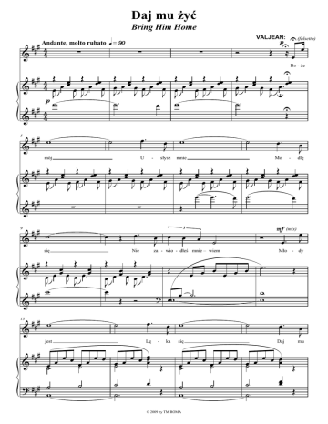 Daj mu Ŝyć # Andante, molto rubato q # 4 & # 4 ∑ »ªº # # # 4 Œ œœ Œ œœ Œ & 4 œ œ œ œ œ œ œ œ J J J J J pw ˙. # # & # 44 5 & ### w Bring Him Home ∑ œ. ˙ U 9 ∑ - œ J w słysz mnie œ Œ się & ### w Œ œœ œ œ œ Jœ œ œ .œ. J J œ Œ Ó jest & ### Œ ? œ. Lę ˙ ˙ ˙. œ Ó ˙ - œ - dlę się F (mix) œ œ. J ˙. Œ w w œw œ ˙ . ka Œ œ J Mło - dy œ œ œ œ œ œ œ w J œ œ œ œ œ œ œ œœœ œ œ œ œ˙ œ˙ ˙ Œ ? ### ˙ w œ za - wio - dłeś mnie – wiem Œ ˙ œ. Mo 3 œ œ J Nie ### Œ œ Œ œ & œ œ œ œJ œ œ .œ J J ### w & 13 œ. ˙ Œ œ Œ œœ Œ œ Œ œœ œ œ œ œ œ Jœ œ œJ Jœ œ œJ Jœ œ œJ J J œ œ. œ ˙. œ J Œ ∑ ### w & Bo - Ŝe œœ Œ œ œœ Œ œ œœ Œ œ œœ Œ œ œœ Œ œ œœ œ œ œ œ . œ œ œ œ œ œJ J J J J J u J J J J w ˙. œ U Œ # # # Œ œœ Œ œœ Œ œœ Œ œœ & œ œ œ Jœ œ Jœ œJ œ œJ œJ œ œJ J J & Ó ∑ U mój ### pU U (falsetto) Œ ≈ œ œ VALJEAN: ˙ œ. Daj œ œ œ œ œ œ œ œœ œ œ œ œ˙ œ˙ ˙ œœ ˙ ˙ ˙ w ˙. © 2009 by TM ROMA œ J mu Œ Œ Daj mu Ŝyć - str. 2 ### w & œ. ˙ 17 trwać ### œ & ? ### w Bła œ w J - gam œ f (full tenor) œ Œ œ. J cię mu śyć œ œ œ œ œ #œ œ œ œ œ œ œ œ œ œ œ œ œ œ œ œ œ # œ œ œ œ œ œ œ œ œ ˙. ˙. Più mosso ### w & œ. (falsetto) ˙ 21 Œ daj śyć Œ wẇ œ. ˙ P (full œ . voice)œ J ˙ œ w J mu œœ œ ˙˙ rall. daj Daj mu œ J Più mosso Ó Ŝyć ### œ œ œ œ œ œ & œ œ œ œ œ œ œ œ œ œ œ œ œ œ œ œ œ œ œ œ œ œ œ . œJ œ œ ˙ ### ‰ j & œ œ œ œ œ œ œ (full voice) 26 Bo gdy - by Bóg mi ### w œœ œœ .. & J . ? # # # Jœ œ 29 & ### œœ .. sy - na œœ J œ J œ. f œ A˙tempo . ‰ œj œ rall. ˙ ja Mi - ja - ją ### j & œ˙˙ œ œj œ . ? # # # ˙˙ Ó w w œ œ ˙ w ˙ ? # # # w˙ dni j œ œ. œ ‰œœ œ J Ó ‰ œj œ œ œ œ œ œ w dał By - łby Œ ‰ j œ œ œœ œœ .. œ œœ .. œœ J J œ œ œ œ œ J J ‰ œ œ ˙ j œj œ . ˙ .œ œww œ ˙ . ˙ ˙ Œ Je-sień tuŜ ˙œœ œœ . . J j œw œ . on, by - łby œ. sił ‰ œ œ non dim. Dzień po œ ˙ .œ œ œ œ œœ œ œ ˙ œ J œ. œ œ œ Jœ J œ w w w w jak j œœ J j œ œœœ .. . œ œ œ ˙. J J U - by - wa jak Daj mu Ŝyć - str. 3 # # # rit.˙ & 33 dniu Pj ‰ œ œ. œ ˙ Zbyt wie - le lat ### œ œ œ œœ œ Œ œ & œ . ‰ J J w ? ### w 37 & ### w A tempo primo ‰ œj œ œ Sam dźwi-gam ˙. ‰ œJ ˙ j œ ‰ œ. daj Ra ### œ œ œ œ œ œ œ œœœ œ œ œ & œ˙ œ˙ ˙ p œ ˙ ˙ ? ### ˙ w ˙. # # # w(cresc.) & 41 ˙ jest - w dość daj Œ œ. Ó Œ Œ Œ œ n œ œ œ œœœœ Œ œ Œ p n˙ ˙ œ. Mło za - bie - raj Ó go nam ˙ œ œ œ Œ œ œ œ œ œ œ œ œ œ œ œ œ œ œ œœ œ œ ˙ ˙ ˙ œ ˙ . ? ### Ó œw ˙ Ó ˙ ˙ & ### w brać ˙ œ. Mo - œ J w Ŝesz dać œ J dy F œ. œ J œ. œ J Mo - Ŝesz # # # wœ & 45 - j Œ œ œ œ œ . œ œ œ ˙ . œ œ œ œœ œ œ œ œ Œ œœ ˙˙ ˙˙ ˙˙ Œ w ˙. œ œ œ œ œ ˙ J Nie œ œ Po - kój ˙. œ J Œ Œ U (falsetto) U juŜ œœ . œ ˙ . # ˙ J ‰ ‰ Jœ ˙. ˙ p rall. ˙. ˙ Ó œ. Daj j ˙œ ### w œ œ ˙ œ œ w œ ˙ œ . œ œ œ œ œ œ œ œ œ œ œ œ œ Œ & œ œ œ œ œ œ œ œ œ Œ œœ œœ ˙˙ ˙˙ ˙˙ ˙˙ ˙ ˙ ? ### Œ Œ w ˙. w ˙. œ J mu Daj mu Ŝyć - str. 4 ### w & œ. ˙ 49 trwać # # # œ˙ . & w ? ### Daj w mu ˙. ˙. ˙ w ? # # # ww ww w Più mosso Ó œ œ J Œ Mu œ J - sisz ˙. œ œ ˙ œ œ œ œ œ œœ œœ œ œ œ œ ww w w w Œ ƒ >œ . œ f œ. Ŝyć œ Œ œ œ œ ˙œ œ œ œ œ #œ œ œ œ #œ œ œ ### w & 53 œ J cresc. w ˙ w w w ˙ ˙ œ. rall. œ J brać za - bierz mnie Le - piej j w ˙ œ . œ œ œ œ œ ˙ œ œ œ œ œ œ œ œ œ œ ˙œ œ œ œ œ # # # ˙œ œ œ œ œ œ Ó œ œ & œ œ œ A tempo 57 & # # # (falsetto) w œ. ˙ mnie ### w œ œ œ œ œ œ & œ œ p ? ### ˙ w 60 & ### ˙ œ. Daj mu ### ˙ œ œ œœ & œ œ œ ? ### ˙˙ ˙. w œ J œ Daj mu Ŝyć Œ j œ Œ ˙ 46 Ŝyć & ˙ ˙ 46 ˙ œ J œ œ w œ œ œ œ œ œ ˙˙ ˙ w U̇ U̇ śyć mu U œ œ œ ˙ .. œ 6 ˙ œ œ œ œ œ œ 4 œ œ œ œ œ œ œ Œ Œ w œœ rall. molto ten. œ J ˙ œ œ œ. œ œ œ ˙˙ ˙. ˙˙ ten. œ. U ˙ 44 44 U ˙ 44 Daj mu Ŝyć - str. 5 A tempo ### 4 & 4 63 w daj w rall. œœ œœ œ œ # œ # œ œ œ & # 44 œ œ œ œ œ œ œ œ œ œ ### 4 & 4 w w π U w U ggg wwww ggg ggg ggg ggg gg ggg w u
