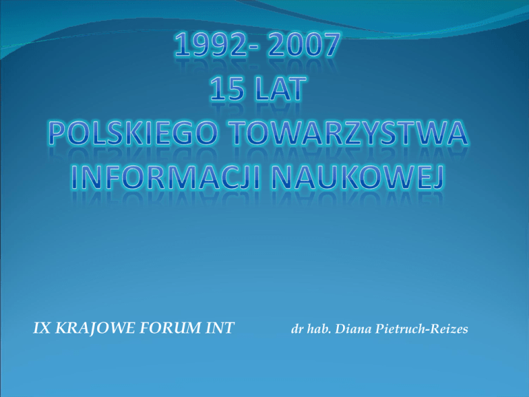 IX KRAJOWE FORUM INT dr hab. Diana Pietruch-Reizes Mis ja P TIN oddziaływanie na procesy komunikacyjne w sferze naukowej i praktycznej inspirowanie działań w celu przygotowania strategii komunikowania naukowego ochrona praw użytkowników kształtowanie postaw i zachowań pracowników i użytkowników informacji ochrona własności intelektualnej współtworzenie lobby zawodu czy kultury komunikowania C ele i zadania P TIN kontekst potrzeb i wyzwań kształtującego się społeczeństwa informacyjnego, gwałtowny rozwój technologii informacyjnokomunikacyjnych, proces integracji europejskiej i członkostwo Polski w Unii Europejskiej, budowa konkurencyjnej, dynamicznej i opartej na wiedzy gospodarki upowszechnianie w społeczeństwie wiedzy na temat teorii i praktyki informacji naukowej i technicznej oraz o roli i znaczeniu informacji w nowocześnie funkcjonującej gospodarce, współuczestniczenie w kształtowaniu polityki informacyjnej państwa i jej najważniejszych elementów (potrzeb informacyjnych społeczeństwa, uwarunkowań legislacyjnych i finansowoorganizacyjnych tych potrzeb, promocji rozwoju działalności informacyjnej) oraz dostosowanie dalszego rozwoju informacji naukowej w Polsce do wymogów UE. wpływanie na rozwój informacji naukowej, technicznej poprzez uczestniczenie członków PTIN w zespołach opiniujących przedsięwzięcia w zakresie informacji naukowej na szczeblu ministerialnym, np. w Forum do spraw Społeczeństwa Informacyjnego, powołanym w 2000 r. przez Ministra Nauki – Przewodniczącego Komitetu Badań Naukowych, którego zadaniem było m.in. opiniowanie strategii przygotowywanych w ramach realizacji Celów i kierunków rozwoju społeczeństwa informacyjnego , inicjowanie prac na rzecz integracji krajowych środowisk twórców i użytkowników informacji – przedstawicieli instytucji zajmujących opracowywaniem, informacji się gromadzeniem, przetwarzaniem i naukowej m.in. odpowiednich ram prawnych w udostępnianiem celu stworzenia w odniesieniu do całokształtu działalności informacyjnej w zakresie nauki i techniki, które przyspieszą pozytywne zmiany w kierunku kształtowania wszystkich społeczeństwa informacyjnego dla Krajowe F ORUM Informacji Naukowej i Technicznej Rola informacji naukowo-technicznej w dobie dostosowania nauki i gospodarki kraju do wymagań Unii Europejskiej Informacja – Wiedza –Gospodarka Usługi, aplikacje, treści w gospodarce opartej na wiedzy Kierunki i priorytety rozwoju informacji naukowej w kontekście budowania społeczeństwa wiedzy Wymiana informacji i rozwój profesjonalnych usług informacyjnych w edukacji, nauce i kulturze na rzecz społeczeństwa opartego na wiedzy Inicjatywy wydawnicze PTIN re d ag o w anie i pub lik o w anie o d 1 9 9 3 r. k w artalnik a „ Prak tyk a i Te o ria Info rm ac ji Nauk o w e j i Te c h nic zne j” (PTINT), w 2 0 0 0 r. Po lsk ie To w arzystw o Info rm ac ji Nauk o w e j zainic jo w a ł o se ri ę w yd aw nic z ą - PRACE P T I N Wymiana informacji i interaktywne komunikowanie medialne. Pod red. Z. Kierzkowskiego, S. KluskaNawareckiej i A. Sielickiego. Poznań (PRACE PTIN NR 1) Społeczeństwo informacyjne w perspektywie nowego tysiąclecia. Pod red. D. Pietruch-Reizes, A. Sitarskiej i B. Stefaniak. Warszawa 2000 (PRACE PTIN NR 2) Forum integracyjne krajowych stowarzyszeń z zakresu informacji naukowej, bibliotekarstwa i dziedzin pokrewnych. Pod red. D. Pietruch-Reizes. Warszawa 2000. (PRACE PTIN NR 3) Informacja, wiedza, gospodarka. Pod red. W. Pindlowej i D. Pietruch-Reizes. Warszawa 2001 (PRACE PTIN NR 4) Usługi, aplikacje, treści w gospodarce opartej na wiedzy. Pod red. D. Pietruch-Reizes i W. Babika. Warszawa 2004 (PRACE PTIN NR 5) Kierunki i priorytety rozwoju informacji naukowej w kontekście budowania społeczeństwa wiedzy. Pod red. D. Pietruch-Reizes i W.Babika. Katowice 2006 (PRACE PTIN NR 6) Działalno ść P TIN na rzecz rozwoju s połecze ń s twa informacyjnego inicjowanie dyskusji na temat rozwoju przyjaznego społeczeństwa informacyjnego w Europie w aspekcie społecznym, kulturowym i prawnym we współpracy z akademickimi ośrodkami kształcenia bibliotekarzy i specjalistów z zakresu informacji naukowej i ICT oraz z krajowymi i zagranicznymi organizacjami i stowarzyszeniami z zakresu informacji naukowej i dziedzin pokrewnych prezentowanie na łamach kwartalnika „Praktyka i Teoria Informacji Naukowej i Technicznej” oraz na stronie WWW PTIN (www.ptin.org.pl) zagadnień nowych technologii informacyjno-komunikacyjnych w aspekcie pracy w społeczeństwie informacyjnym, doskonalenia znajomości techniki informacyjnokomunikacyjnej i posługiwania się informacją i komunikowaniem włączenie PTIN w działania informacyjno – edukacyjno – promocyjne dotyczące integracji europejskiej i Unii Europejskiej, w tym: organizowanie konferencji naukowych, seminariów szkoleniowych, wykładów, odczytów na temat szeroko pojmowanej informacji naukowej ze szczególnym uwzględnieniem m.in. roli informacji w procesie integracji Polski z Unią Europejską, wymiany informacji i rozwoju profesjonalnych usług informacyjnych w społeczeństwie informacyjnym, potrzeb informacyjnych sektora małych i średnich przedsiębiorstw czy informacji w kontekście zagadnień ochrony własności intelektualnej.