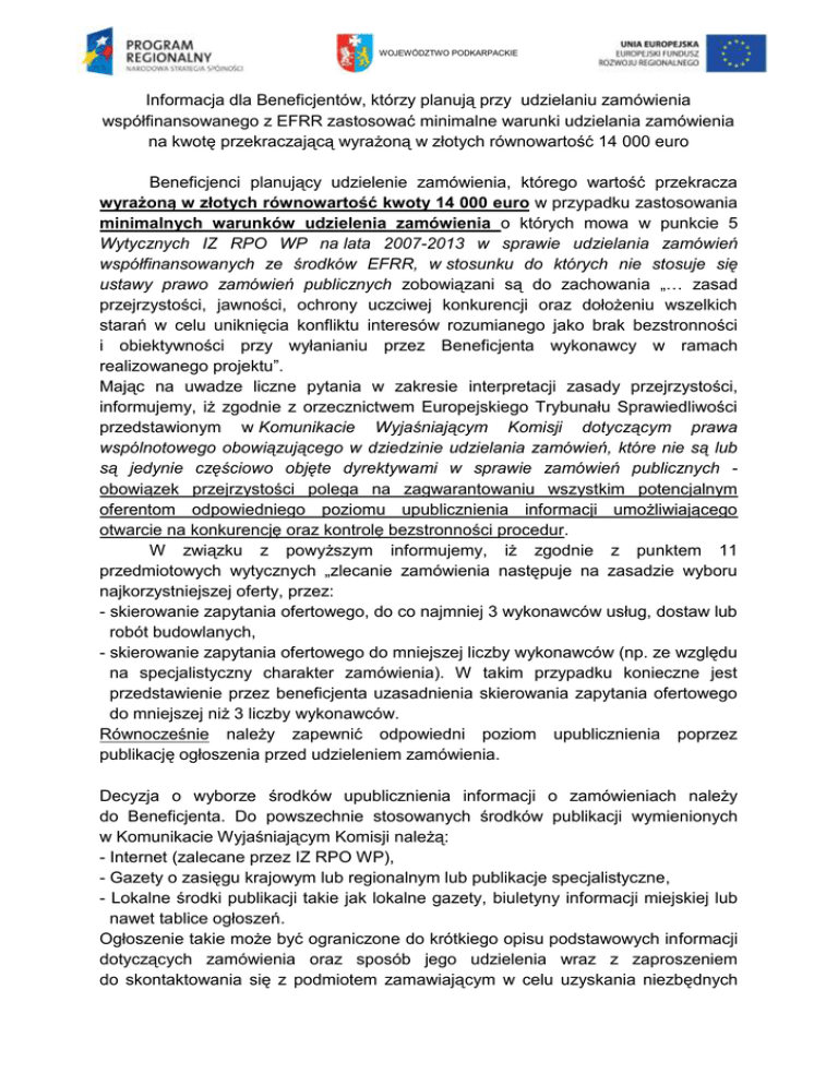 WOJEWÓDZTWO PODKARPACKIE Informacja dla Beneficjentów, którzy planują przy udzielaniu zamówienia współfinansowanego z EFRR zastosować minimalne warunki udzielania zamówienia na kwotę przekraczającą wyrażoną w złotych równowartość 14 000 euro Beneficjenci planujący udzielenie zamówienia, którego wartość przekracza wyrażoną w złotych równowartość kwoty 14 000 euro w przypadku zastosowania minimalnych warunków udzielenia zamówienia o których mowa w punkcie 5 Wytycznych IZ RPO WP na lata 2007-2013 w sprawie udzielania zamówień współfinansowanych ze środków EFRR, w stosunku do których nie stosuje się ustawy prawo zamówień publicznych zobowiązani są do zachowania „… zasad przejrzystości, jawności, ochrony uczciwej konkurencji oraz dołożeniu wszelkich starań w celu uniknięcia konfliktu interesów rozumianego jako brak bezstronności i obiektywności przy wyłanianiu przez Beneficjenta wykonawcy w ramach realizowanego projektu”. Mając na uwadze liczne pytania w zakresie interpretacji zasady przejrzystości, informujemy, iż zgodnie z orzecznictwem Europejskiego Trybunału Sprawiedliwości przedstawionym w Komunikacie Wyjaśniającym Komisji dotyczącym prawa wspólnotowego obowiązującego w dziedzinie udzielania zamówień, które nie są lub są jedynie częściowo objęte dyrektywami w sprawie zamówień publicznych obowiązek przejrzystości polega na zagwarantowaniu wszystkim potencjalnym oferentom odpowiedniego poziomu upublicznienia informacji umożliwiającego otwarcie na konkurencję oraz kontrolę bezstronności procedur. W związku z powyższym informujemy, iż zgodnie z punktem 11 przedmiotowych wytycznych „zlecanie zamówienia następuje na zasadzie wyboru najkorzystniejszej oferty, przez: - skierowanie zapytania ofertowego, do co najmniej 3 wykonawców usług, dostaw lub robót budowlanych, - skierowanie zapytania ofertowego do mniejszej liczby wykonawców (np. ze względu na specjalistyczny charakter zamówienia). W takim przypadku konieczne jest przedstawienie przez beneficjenta uzasadnienia skierowania zapytania ofertowego do mniejszej niż 3 liczby wykonawców. Równocześnie należy zapewnić odpowiedni poziom upublicznienia poprzez publikację ogłoszenia przed udzieleniem zamówienia. Decyzja o wyborze środków upublicznienia informacji o zamówieniach należy do Beneficjenta. Do powszechnie stosowanych środków publikacji wymienionych w Komunikacie Wyjaśniającym Komisji należą: - Internet (zalecane przez IZ RPO WP), - Gazety o zasięgu krajowym lub regionalnym lub publikacje specjalistyczne, - Lokalne środki publikacji takie jak lokalne gazety, biuletyny informacji miejskiej lub nawet tablice ogłoszeń. Ogłoszenie takie może być ograniczone do krótkiego opisu podstawowych informacji dotyczących zamówienia oraz sposób jego udzielenia wraz z zaproszeniem do skontaktowania się z podmiotem zamawiającym w celu uzyskania niezbędnych WOJEWÓDZTWO PODKARPACKIE informacji dotyczących zamówienia, które później pozwolą podmiotowi zamawiającemu właściwie porównać i ocenić wszystkie otrzymane oferty. Jeżeli jest to konieczne, ogłoszenie może być uzupełnione dodatkowymi informacjami udostępnianymi w Internecie lub też na wniosek złożony u podmiotu zamawiającego. Jednocześnie w związku z dużą ilością pytań dotyczących formy przekazania zapytań ofertowych, informujemy iż dopuszczalne jest także osobiste dostarczenie/odbiór zapytania ofertowego. Ponadto należy mieć na uwadze zapisy umowy o dofinansowanie/ww. Wytycznych Instytucji Zarządzającej RPO WP mówiące o tym, że Beneficjent jest zobowiązany przechowywać pełną dokumentację związaną z realizacją projektu, w tym również związaną z udzielonym zamówieniem (bez względu na wynik i zastosowane procedury) tj. „Opis udzielonego zamówienia” oraz dowody przekazania zapytań ofertowych i zamieszczenia ogłoszeń, pisemne oferty, wydruki stron internetowych, foldery, katalogi i inne dokumenty. Rzeszów dnia 26 czerwca 2009r.