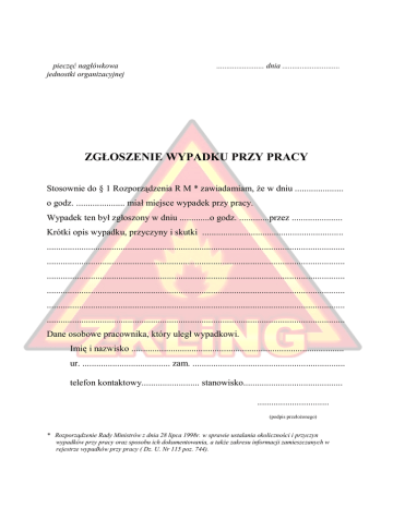 pieczęć nagłówkowa jednostki organizacyjnej ........................ dnia ............................. ZGŁOSZENIE WYPADKU PRZY PRACY Stosownie do § 1 Rozporządzenia R M * zawiadamiam, że w dniu ..................... o godz. ..................... miał miejsce wypadek przy pracy. Wypadek ten był zgłoszony w dniu .............o godz. .............przez ...................... Krótki opis wypadku, przyczyny i skutki ............................................................. ................................................................................................................................. ................................................................................................................................. ................................................................................................................................. ................................................................................................................................. ................................................................................................................................. ................................................................................................................................. Dane osobowe pracownika, który uległ wypadkowi. Imię i nazwisko ............................................................................................ ur. ...................................... zam. .................................................................. telefon kontaktowy......................... stanowisko........................................... ............................... (podpis przełożonego) * Rozporządzenie Rady Ministrów z dnia 28 lipca 1998r. w sprawie ustalania okoliczności i przyczyn wypadków przy pracy oraz sposobu ich dokumentowania, a także zakresu informacji zamieszczanych w rejestrze wypadków przy pracy ( Dz. U. Nr 115 poz. 744).